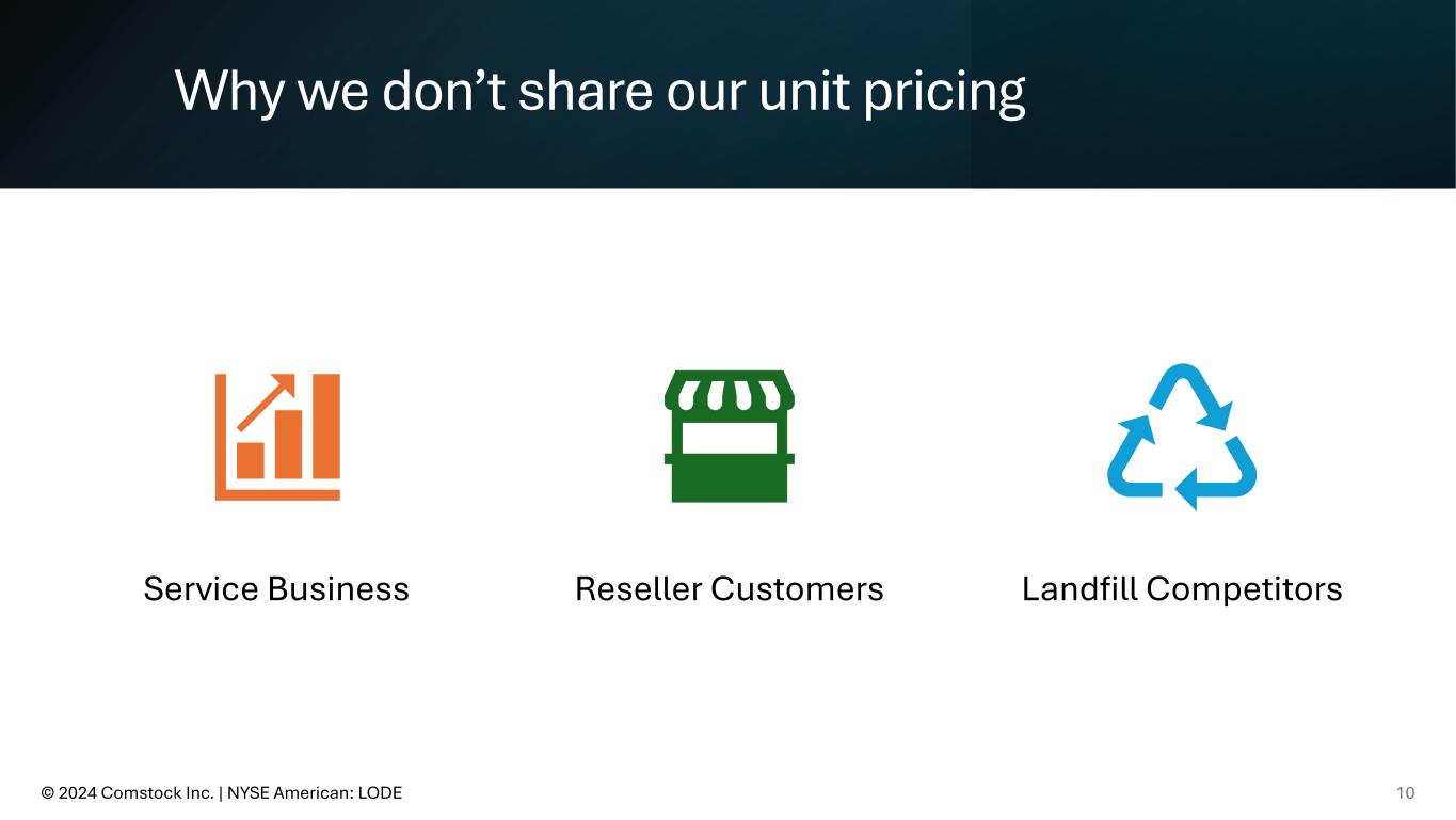 Why we don’t share our unit pricing Service Business Reseller Customers Landfill Competitors © 2024 Comstock Inc. | NYSE American: LODE 10