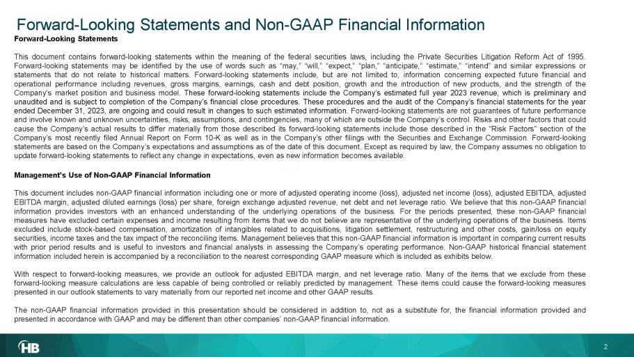 Forward - Looking Statements and Non - GAAP Financial Information Forward - Looking Statements This document contains forward - looking statements within the meaning of the federal securities laws, including the Private Securities Litigation Reform Act of 1995 . Forward - looking statements may be identified by the use of words such as “may,” “will,” “expect,” “plan,” “anticipate,” “estimate,” “intend” and similar expressions or statements that do not relate to historical matters . Forward - looking statements include, but are not limited to, information concerning expected future financial and operational performance including revenues, gross margins, earnings, cash and debt position, growth and the introduction of new products, and the strength of the Company’s market position and business model . These forward - looking statements include the Company’s estimated full year 2023 revenue, which is preliminary and unaudited and is subject to completion of the Company’s financial close procedures . These procedures and the audit of the Company’s financial statements for the year ended December 31 , 2023 , are ongoing and could result in changes to such estimated information . Forward - looking statements are not guarantees of future performance and involve known and unknown uncertainties, risks, assumptions, and contingencies, many of which are outside the Company’s control . Risks and other factors that could cause the Company’s actual results to differ materially from those described its forward - looking statements include those described in the “Risk Factors” section of the Company’s most recently filed Annual Report on Form 10 - K as well as in the Company’s other filings with the Securities and Exchange Commission . Forward - looking statements are based on the Company’s expectations and assumptions as of the date of this document . Except as required by law, the Company assumes no obligation to update forward - looking statements to reflect any change in expectations, even as new information becomes available . Management’s Use of Non - GAAP Financial Information This document includes non - GAAP financial information including one or more of adjusted operating income (loss), adjusted net income (loss), adjusted EBITDA, adjusted EBITDA margin, adjusted diluted earnings (loss) per share, foreign exchange adjusted revenue, net debt and net leverage ratio . We believe that this non - GAAP financial information provides investors with an enhanced understanding of the underlying operations of the business . For the periods presented, these non - GAAP financial measures have excluded certain expenses and income resulting from items that we do not believe are representative of the underlying operations of the business . Items excluded include stock - based compensation, amortization of intangibles related to acquisitions, litigation settlement, restructuring and other costs, gain/loss on equity securities, income taxes and the tax impact of the reconciling items . Management believes that this non - GAAP financial information is important in comparing current results with prior period results and is useful to investors and financial analysts in assessing the Company’s operating performance . Non - GAAP historical financial statement information included herein is accompanied by a reconciliation to the nearest corresponding GAAP measure which is included as exhibits below . With respect to forward - looking measures, we provide an outlook for adjusted EBITDA margin, and net leverage ratio . Many of the items that we exclude from these forward - looking measure calculations are less capable of being controlled or reliably predicted by management . These items could cause the forward - looking measures presented in our outlook statements to vary materially from our reported net income and other GAAP results . The non - GAAP financial information provided in this presentation should be considered in addition to, not as a substitute for, the financial information provided and presented in accordance with GAAP and may be different than other companies’ non - GAAP financial information . 2 2