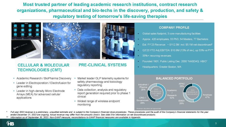 Jim Green, Chairman , President & CEO January 5, 2024 HBIO Investor Overview Enabling discovery, safety and production of tomorrow’s therapeutics