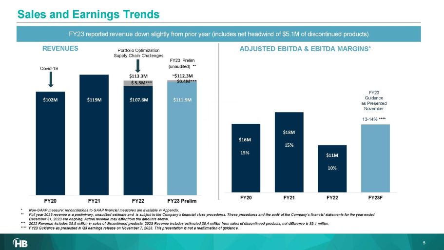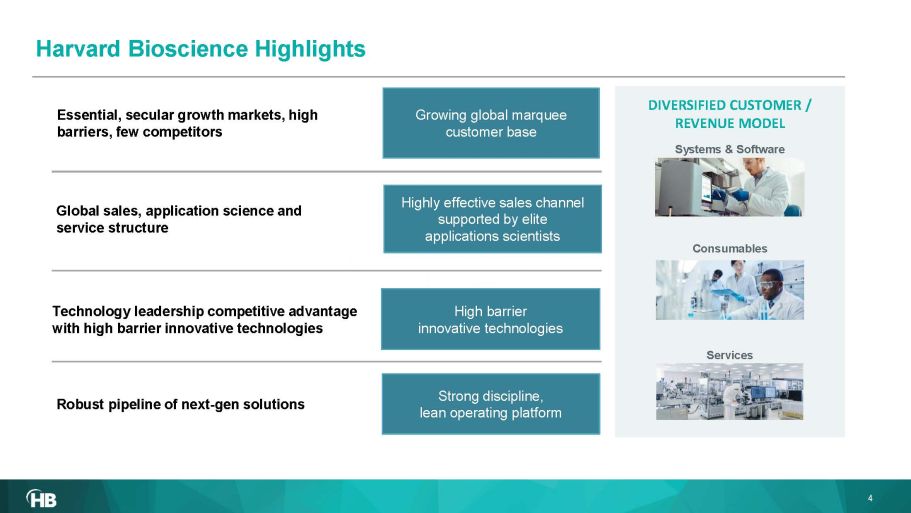 Most trusted partner of leading academic research institutions, contract research organizations, pharmaceutical and bio - techs in the discovery, production, and safety & regulatory testing of tomorrow’s life - saving therapies PRE - CLINICAL SYSTEMS CELLULAR & MOLECULAR TECHNOLOGIES (CMT) ▪ Academic Research / BioPharma Discovery ▪ Leader in Electroporation / Electrofusion for gene editing ▪ Leader in high - density Micro Electrode Arrays (MEA) for advanced cellular applications 3 ▪ Global sales footprint, 3 core manufacturing facilities ▪ Approx. 420 employees, 33 PhD, 54 Masters, 77 Bachelors ▪ Est. FY’23 Revenue: ~ $112.3M incl. $5.1M net discontinued* ▪ Q3’23 YTD Adj EBITDA : $10.9M (13% of rev), up 53% vs PY** ▪ 35%+ recurring revenues ▪ Founded 1901, Public Listing Dec. 2000 “NASDAQ: HBIO” ▪ Headquarters: Greater Boston, MA COMPANY PROFILE BALANCED PORTFOLIO Academic / Research 52% CRO / Government 28% Industrial / Pharma 20% Americas 47% EMEA 28% APAC 25% 2022 REVENUE BY CUSTOMER TYPE 2022 REVENUE BY GEOGRAPHY Revenues allocations are approximate ▪ Market leader GLP telemetry systems for safety pharmacology and toxicology regulatory reporting ▪ Data collection, analysis and regulatory report generation required prior to phase 1 clinical ▪ Widest range of wireless endpoint monitoring * Full year 2023 revenue is a preliminary, unaudited estimate and is subject to the Company’s financial close procedures. Thes e p rocedures and the audit of the Company’s financial statements for the year ended December 31, 2023 are ongoing. Actual revenue may differ from the amounts shown. See slide 5 for information on net dis con tinued products. ** Information as of September 30, 2023. Non - GAAP measure ; reconciliations to GAAP financial measures are available in Appendix.