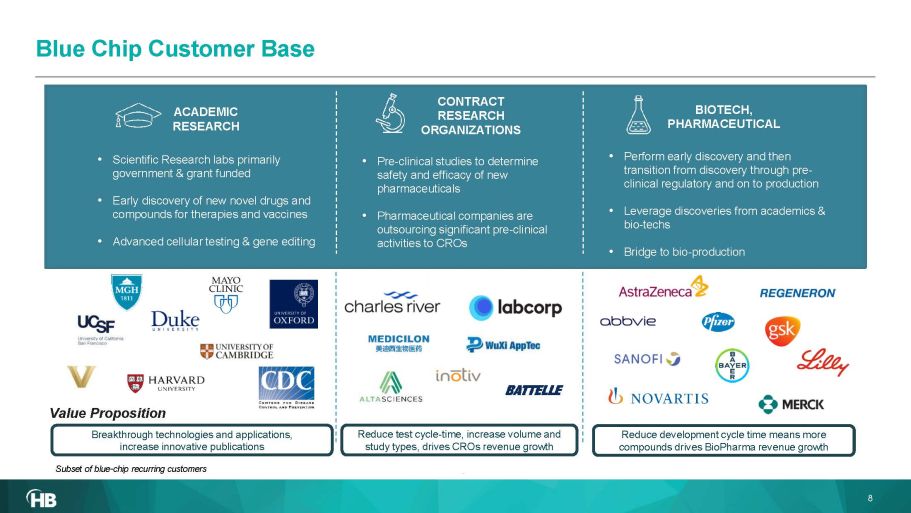 Increased funding for research and development of advanced therapeutics Rising incidence of disease – cardiac, cancer, respiratory, diabetes, obesity, Alzheimer’s, neurological, infectious 1) https://www.researchandmarkets.com/reports/5553406/pharmaceuticals - global - market - report - 2022 - by 2) https://www.acumenresearchandconsulting.com/biotechnology - market 3) https://www.emergenresearch.com/request - sample/1221 4) https://ncses.nsf.gov/pubs/nsf22323 5) https://www.grandviewresearch.com/industry - analysis/preclinical - cro - market *Internal estimates calculated based on publicly - available data. Increased demand for research tools, devices and systems that improve efficiency & productivity and enable therapeutics discovery and safety & regulatory through bio - production DRIVERS END MARKET SEGMENTS Estimated size & projected CAGR PHARMACEUTICAL 1 BIOTECH 2 CONTRACT RESEARCH ORGANIZATIONS 3 ACADEMIC RESEARCH 4 Global $1.6T 2022 7.7% 2022 - 2026 Global $372B 2021 15.5% 2022 - 2030 Global $61B 2021 10.9% 2021 - 2030 Essential Technologies Serving Well - funded, High - growth Secular Markets Demographic Tailwinds 7 R&D $222B (2021)* NIH Grants $30.2B (2021)* R&D $60B (2021)* Estimated R&D expenditure within HBIO markets US Federal $179B 2021 9.3% 2016 - 2021 Pre - clinical market $5B (2021) 5 7
