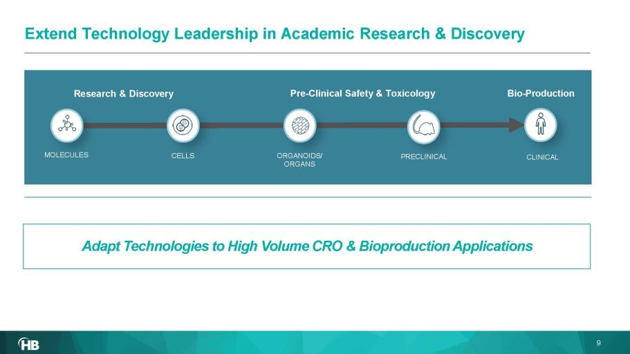 Subset of blue - chip recurring customers • Scientific Research labs primarily government & grant funded • Early discovery of new novel drugs and compounds for therapies and vaccines • Advanced cellular testing & gene editing ACADEMIC RESEARCH • Perform early discovery and then transition from discovery through pre - clinical regulatory and on to production • Leverage discoveries from academics & bio - techs • Bridge to bio - production BIOTECH, PHARMACEUTICAL CONTRACT RESEARCH ORGANIZATIONS • Pre - clinical studies to determine safety and efficacy of new pharmaceuticals • Pharmaceutical companies are outsourcing significant pre - clinical activities to CROs Breakthrough technologies and applications, increase innovative publications Reduce test cycle - time, increase volume and study types, drives CROs revenue growth Reduce development cycle time means more compounds drives BioPharma revenue growth Value Proposition 8 Blue Chip Customer Base