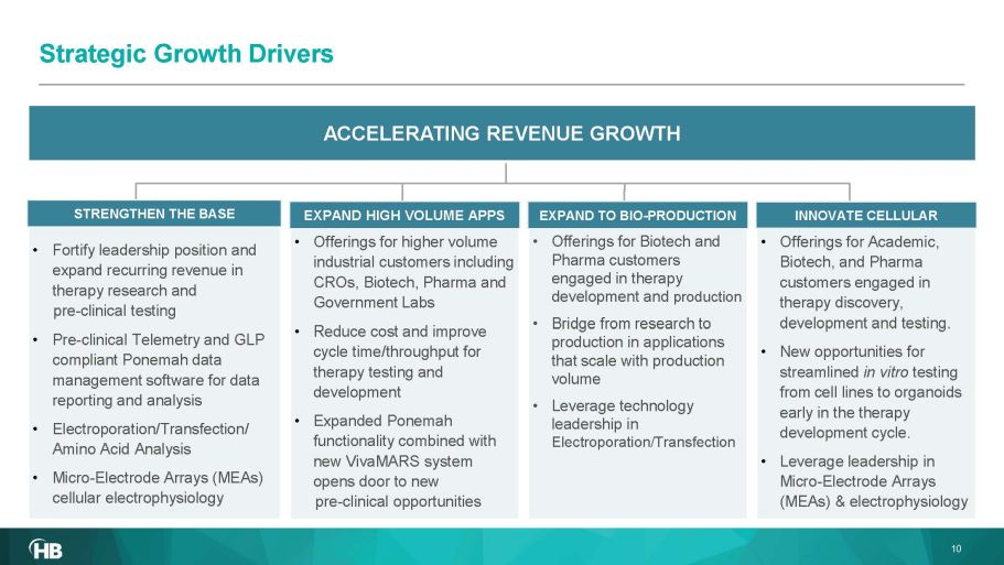 9 Adapt Technologies to High Volume CRO & Bioproduction Applications Research & Discovery Pre - Clinical Safety & Toxicology CELLS MOLECULES CLINICAL ORGANOIDS/ ORGANS PRECLINICAL Bio - Production Extend Technology Leadership in Academic Research & Discovery