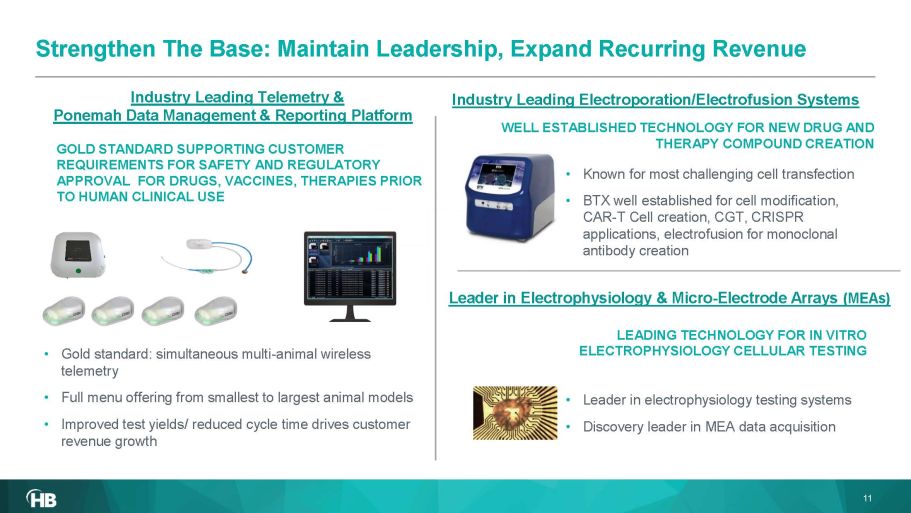 • Fortify leadership position and expand recurring revenue in therapy research and pre - clinical testing • Pre - clinical Telemetry and GLP compliant Ponemah data management software for data reporting and analysis • Electroporation/Transfection/ Amino Acid Analysis • Micro - Electrode Arrays (MEAs) cellular electrophysiology STRENGTHEN THE BASE • Offerings for higher volume industrial customers including CROs, Biotech, Pharma and Government Labs • Reduce cost and improve cycle time/throughput for therapy testing and development • Expanded Ponemah functionality combined with new VivaMARS system opens door to new pre - clinical opportunities EXPAND HIGH VOLUME APPS • Offerings for Biotech and Pharma customers engaged in therapy development and production • Bridge from research to production in applications that scale with production volume • Leverage technology leadership in Electroporation/Transfection EXPAND TO BIO - PRODUCTION • Offerings for Academic, Biotech, and Pharma customers engaged in therapy discovery, development and testing. • New opportunities for streamlined in vitro testing from cell lines to organoids early in the therapy development cycle. • Leverage leadership in Micro - Electrode Arrays (MEAs) & electrophysiology INNOVATE CELLULAR 10 ACCELERATING REVENUE GROWTH Strategic Growth Drivers
