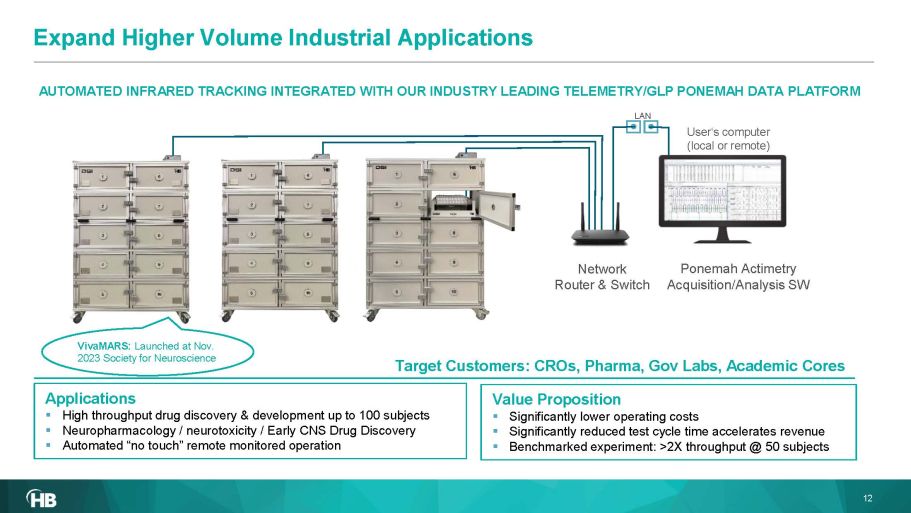 Ponemah Actimetry Acquisition/Analysis SW Network Router & Switch User‘s computer (local or remote) LAN Value Proposition ▪ Significantly lower operating costs ▪ Significantly reduced test cycle time accelerates revenue ▪ Benchmarked experiment: >2X throughput @ 50 subjects Applications ▪ High throughput drug discovery & development up to 100 subjects ▪ Neuropharmacology / neurotoxicity / Early CNS Drug Discovery ▪ Automated “no touch” remote monitored operation Target Customers: CROs, Pharma, Gov Labs, Academic Cores VivaMARS : Launched at Nov. 2023 Society for Neuroscience 12 AUTOMATED INFRARED TRACKING INTEGRATED WITH OUR INDUSTRY LEADING TELEMETRY/GLP PONEMAH DATA PLATFORM Expand Higher Volume Industrial Applications