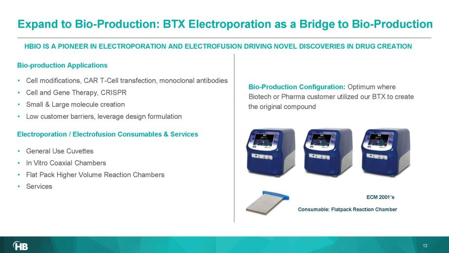 • General Use Cuvettes • In Vitro Coaxial Chambers • Flat Pack Higher Volume Reaction Chambers • Services HBIO IS A PIONEER IN ELECTROP ORATION AND ELECTROFUSION DRIVING NOVEL DISCOVERIES IN DRUG CREATION Electroporation / Electrofusion Consumables & Services • Cell modifications, CAR T - Cell transfection, monoclonal antibodies • Cell and Gene Therapy, CRISPR • Small & Large molecule creation • Low customer barriers, leverage design formulation Consumable: Flat pack Reaction Chamber Bio - Production Configuration: Optimum where Biotech or Pharma customer utilized our BTX to create the original compound ECM 2001’s 13 Bio - production Applications Expand to Bio - Production: BTX Electroporation as a Bridge to Bio - Production