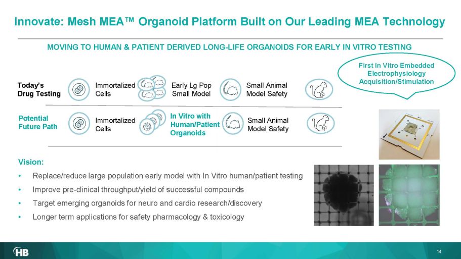 Vision: • Replace/reduce large population early model with In Vitro human/patient testing • Imp rove pre - clinical throughput/yield of successful compounds • Target emerging organoids for neuro and cardio research/discovery • Longer term applications for safety pharmacology & toxicology MOVING TO HUMAN & PATIENT DERIVED LONG - LIFE ORGANOIDS FOR EARLY IN VITRO TESTING Early Lg Pop Small Model Immortalized Cells In Vitro with Human/Patient Organoids Today’s Drug Testing Potential Future Path 14 First In Vitro Embedded Electrophysiology Acquisition/Stimulation Immortalized Cells Small Animal Model Safety Small Animal Model Safety Innovate: Mesh MEA Œ Organoid Platform B uilt on Our L eading MEA Technology