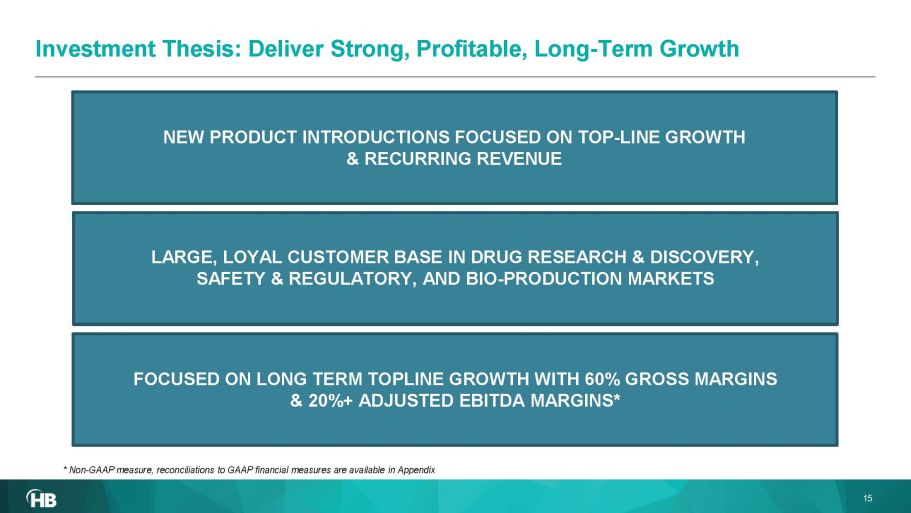 LARGE, LOYAL CUSTOMER BASE IN DRUG RESEARCH & DISCOVERY, SAFETY & REGULATORY, AND BIO - PRODUCTION MARKETS NEW PRODUCT INTRODUCTIONS FOCUSED ON TOP - LINE GROWTH & RECURRING REVENUE Investment Thesis: Deliver Strong, Profitable, Long - Term Growth 15 FOCUSED ON LONG TERM TOPLINE GROWTH WITH 60% GROSS MARGINS & 20%+ ADJUSTED EBITDA MARGINS* * Non - GAAP measure, reconciliations to GAAP financial measures are available in Appendix