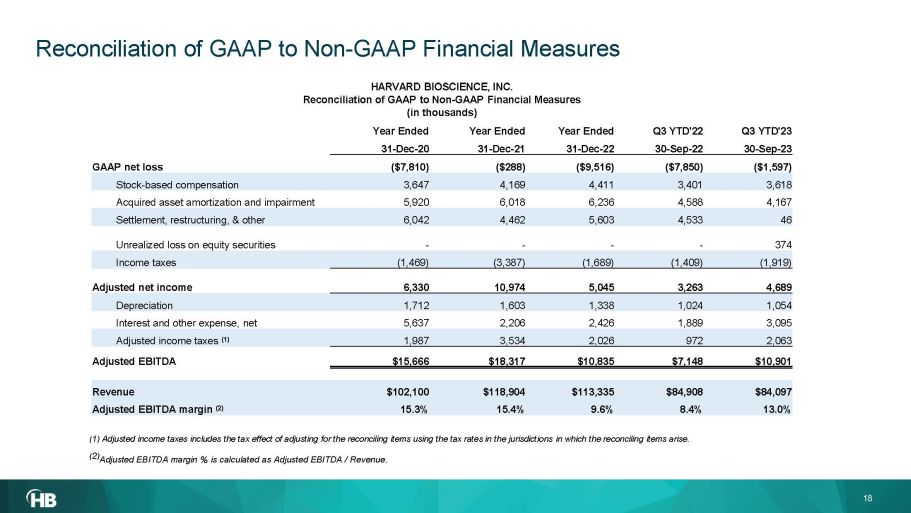 Reconciliation of GAAP to Non - GAAP Financial Measures HARVARD BIOSCIENCE, INC. Reconciliation of GAAP to Non - GAAP Financial Measures (in thousands) Q3 YTD'23 Q3 YTD'22 Year Ended Year Ended Year Ended 30 - Sep - 23 30 - Sep - 22 31 - Dec - 22 31 - Dec - 21 31 - Dec - 20 ($1,597) ($7,850) ($9,516) ($288) ($7,810) GAAP net loss 3,618 3,401 4,411 4,169 3,647 Stock - based compensation 4,167 4,588 6,236 6,018 5,920 Acquired asset amortization and impairment 46 4,533 5,603 4,462 6,042 Settlement, restructuring, & other 374 - - - - Unrealized loss on equity securities (1,919) (1,409) (1,689) (3,387) (1,469) Income taxes 4,689 3,263 5,045 10,974 6,330 Adjusted net income 1,054 1,024 1,338 1,603 1,712 Depreciation 3,095 1,889 2,426 2,206 5,637 Interest and other expense, net 2,063 972 2,026 3,534 1,987 Adjusted income taxes (1) $10,901 $7,148 $10,835 $18,317 $15,666 Adjusted EBITDA $84,097 $84,908 $113,335 $118,904 $102,100 Revenue 13.0% 8.4% 9.6% 15.4% 15.3% Adjusted EBITDA margin (2) (1) Adjusted income taxes includes the tax effect of adjusting for the reconciling items using the tax rates in the jurisdict ion s in which the reconciling items arise. (2) Adjusted EBITDA margin % is calculated as Adjusted EBITDA / Revenue. 18