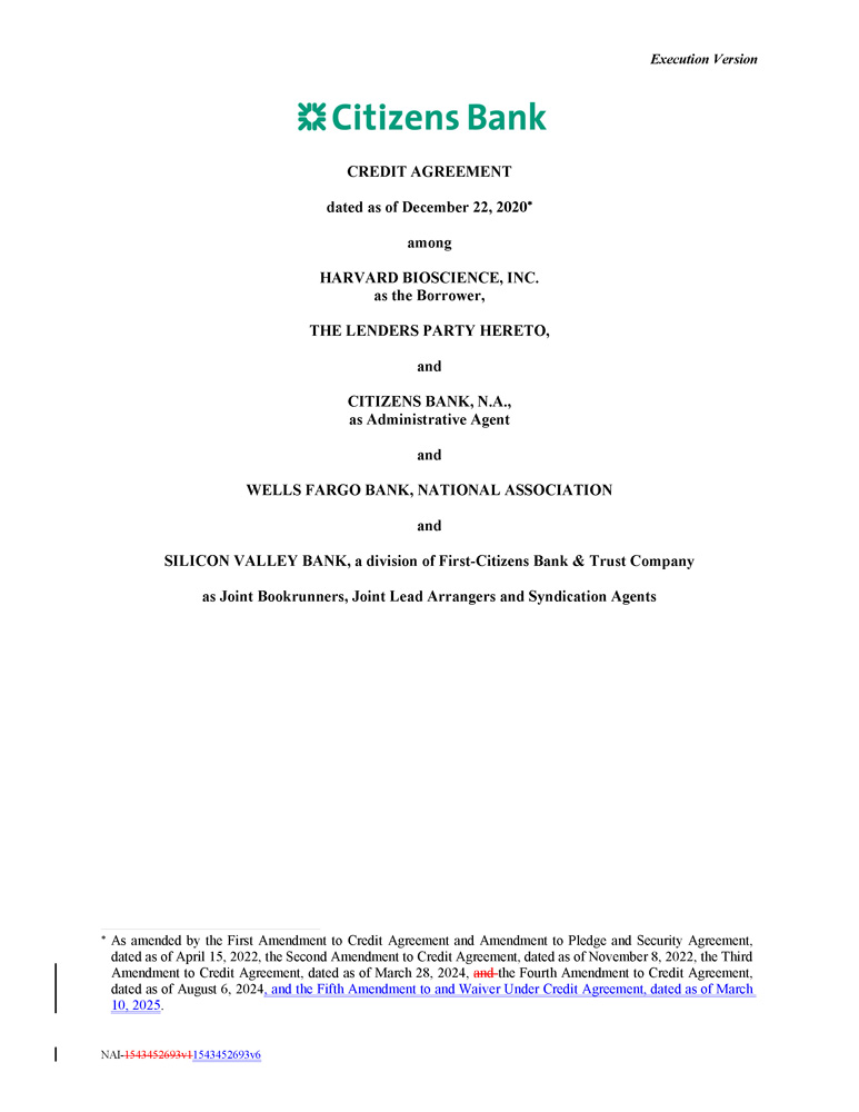 Execution Version CREDIT AGREEMENT dated as of December 22, 2020  among HARVARD BIOSCIENCE, INC. as the Borrower, THE LENDERS PARTY HERETO, and CITIZENS BANK, N.A., as Administrative Agent and WELLS FARGO BANK, NATIONAL ASSOCIATION and SILICON VALLEY BANK, a division of First - Citizens Bank & Trust Company as Joint Bookrunners, Joint Lead Arrangers and Syndication Agents  As amended by the First Amendment to Credit Agreement and Amendment to Pledge and Security Agreement, dated as of April 15 , 2022 , the Second Amendment to Credit Agreement, dated as of November 8 , 2022 , the Third Amendment to Credit Agreement, dated as of March 28 , 2024 , and the Fourth Amendment to Credit Agreement, dated as of August 6 , 2024 , and the Fifth Amendment to and Waiver Under Credit Agreement, dated as of March 10 , 2025 . NAI - 1543452693v1 1543452693v6