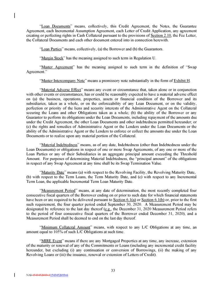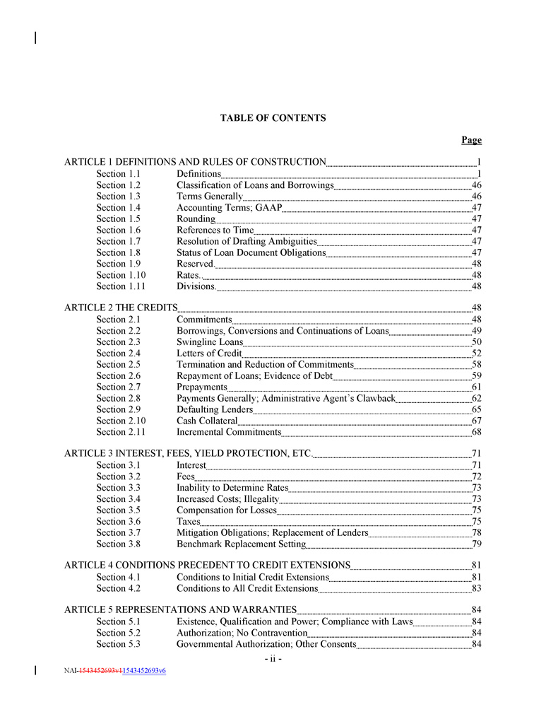TABLE OF CONTENTS Page ARTICLE 1 DEFINITIONS AND RULES OF CONSTRUCTION 1 Section 1.1 Section 1.2 Section 1.3 Section 1.4 Section 1.5 Section 1.6 Section 1.7 Section 1.8 Section 1.9 Section 1.10 Section 1.11 Definitions 1 Classification of Loans and Borrowings 46 Terms Generally 46 Accounting Terms ; GAAP 47 Rounding 47 References to Time 47 Resolution of Drafting Ambiguities 47 Status of Loan Document Obligations 47 Reserved . 48 Rates .. 48 Divisions . 48 ARTICLE 2 THE CREDITS 48 - 2 - NAI - 1543452693v1 1543452693v6 Section 2.1 Section 2.2 Section 2.3 Section 2.4 Section 2.5 Section 2.6 Section 2.7 Section 2.8 Section 2.9 Section 2.10 Section 2.11 Commitments 48 Borrowings, Conversions and Continuations of Loans 49 Swingline Loans 50 Letters of Credit 52 Termination and Reduction of Commitments 58 Repayment of Loans ; Evidence of Debt 59 Prepayments 61 Payments Generally ; Administrative Agent’s Clawback 62 Defaulting Lenders 65 Cash Collateral 67 Incremental Commitments 68 ARTICLE 3 INTEREST, FEES, YIELD PROTECTION, ETC. 71 Section 3.1 Section 3.2 Section 3.3 Section 3.4 Section 3.5 Section 3.6 Section 3.7 Section 3.8 Interest 71 Fees 72 Inability to Determine Rates 73 Increased Costs ; Illegality 73 Compensation for Losses 75 Taxes 75 Mitigation Obligations ; Replacement of Lenders 78 Benchmark Replacement Setting 79 ARTICLE 4 CONDITIONS PRECEDENT TO CREDIT EXTENSIONS 81 Section 4.1 Section 4.2 Conditions to Initial Credit Extensions 81 Conditions to All Credit Extensions 83 ARTICLE 5 REPRESENTATIONS AND WARRANTIES 84 Section 5.1 Section 5.2 Section 5.3 Existence, Qualification and Power ; Compliance with Laws 84 Authorization ; No Contravention 84 Governmental Authorization ; Other Consents 84
