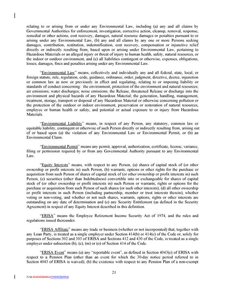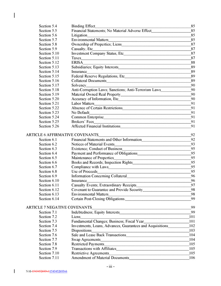 Section 5.4 Section 5.5 Section 5.6 Section 5.7 Section 5.8 Section 5.9 Section 5.10 Section 5.11 Section 5.12 Section 5.13 Section 5.14 Section 5.15 Section 5.16 Section 5.17 Section 5.18 Section 5.19 Section 5.20 Section 5.21 Section 5.22 Section 5.23 Section 5.24 Section 5.25 Section 5.26 - 3 - NAI - 1543452693v1 1543452693v6 Binding Effect 85 Financial Statements ; No Material Adverse Effect 85 Litigation 85 Environmental Matters 85 Ownership of Properties ; Liens 87 Casualty, Etc 87 Investment Company Status, Etc 87 Taxes 87 ERISA 88 Subsidiaries ; Equity Interests 89 Insurance 89 Federal Reserve Regulations, Etc 89 Collateral Documents 89 Solvency 90 Anti - Corruption Laws ; Sanctions ; Anti - Terrorism Laws 90 Material Owned Real Property 90 Accuracy of Information, Etc 90 Labor Matters 91 Absence of Certain Restrictions 91 No Default 91 Common Enterprise 91 Brokers’ Fees 91 Affected Financial Institutions 91 ARTICLE 6 AFFIRMATIVE COVENANTS 92 Section 6.1 Section 6.2 Section 6.3 Section 6.4 Section 6.5 Section 6.6 Section 6.7 Section 6.8 Section 6.9 Section 6.10 Section 6.11 Section 6.12 Section 6.13 Section 6.14 Financial Statements and Other Information 92 Notices of Material Events 93 Existence ; Conduct of Business 95 Payment and Performance of Obligations 95 Maintenance of Properties 95 Books and Records ; Inspection Rights 95 Compliance with Laws 95 Use of Proceeds 95 Information Concerning Collateral 96 Insurance 96 Casualty Events ; Extraordinary Receipts 97 Covenant to Guarantee and Provide Security 98 Environmental Matters 98 Certain Post - Closing Obligations . 99 ARTICLE 7 NEGATIVE COVENANTS 99 Section 7.1 Section 7.2 Section 7.3 Section 7.4 Section 7.5 Section 7.6 Section 7.7 Section 7.8 Section 7.9 Section 7.10 Section 7.11 Indebtedness ; Equity Interests 99 Liens 101 Fundamental Changes ; Business ; Fiscal Year 101 Investments, Loans, Advances, Guarantees and Acquisitions 102 Dispositions 103 Sale and Lease Back Transactions 104 Swap Agreements 104 Restricted Payments 105 Transactions with Affiliates 105 Restrictive Agreements 105 Amendment of Material Documents 106