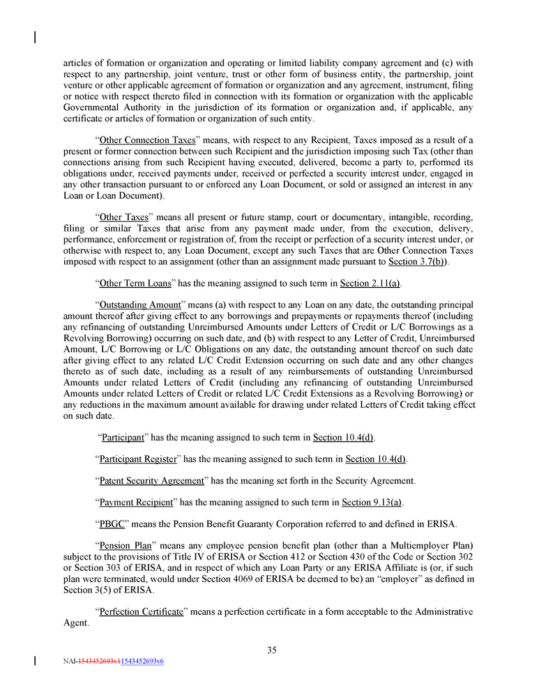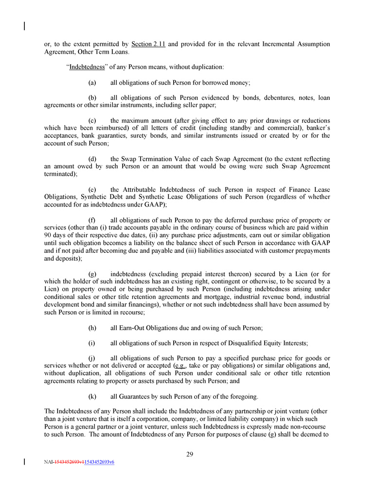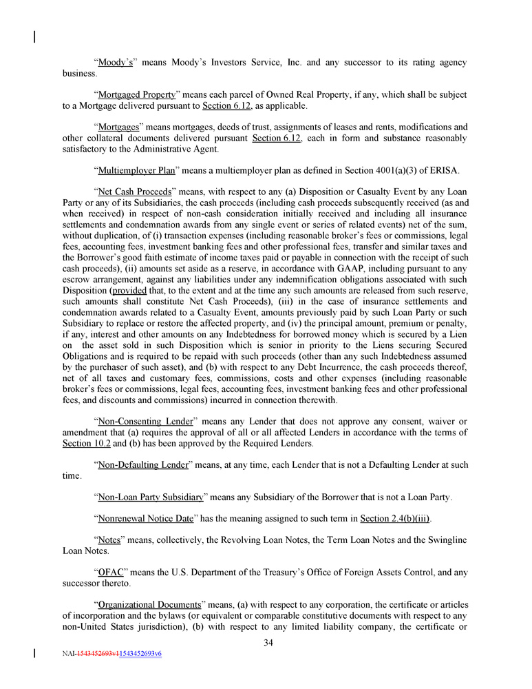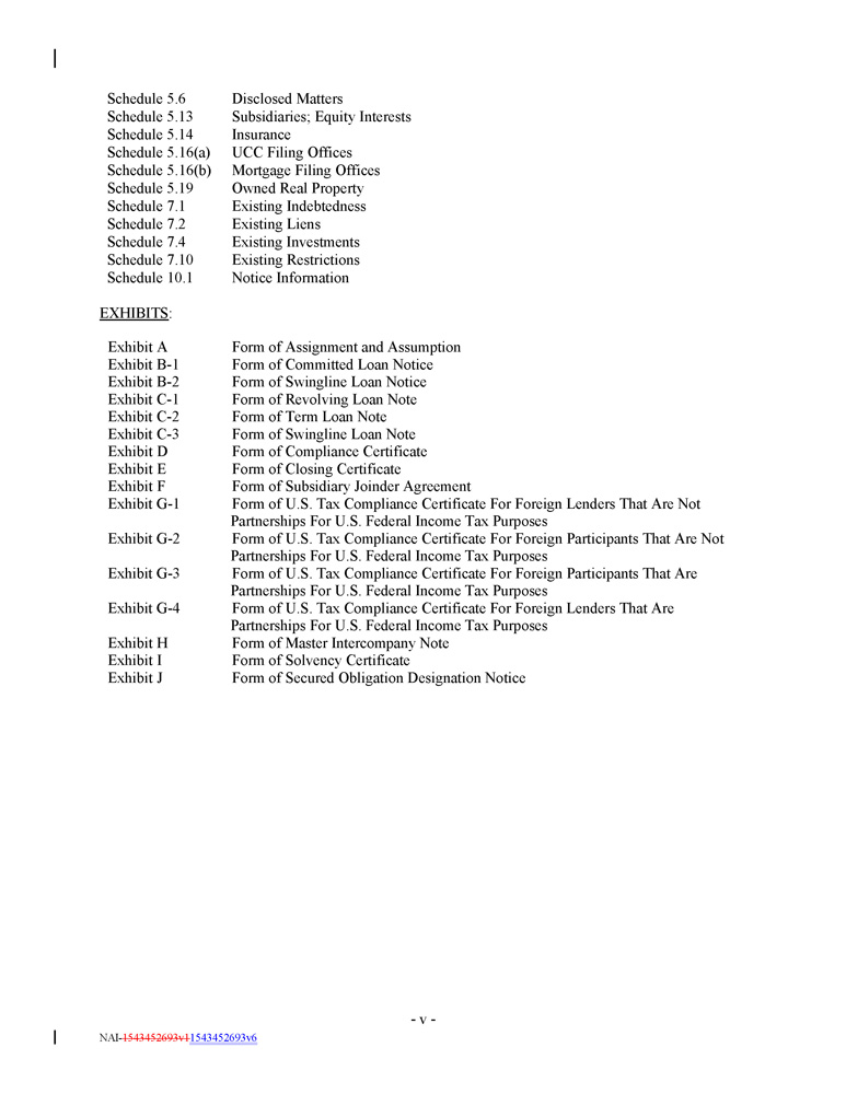 - v - Disclosed Matters Subsidiaries; Equity Interests Insurance UCC Filing Offices Mortgage Filing Offices Owned Real Property Existing Indebtedness Existing Liens Existing Investments Existing Restrictions Notice Information NAI - 1543452693v1 1543452693v6 Exhibit A Exhibit B - 1 Exhibit B - 2 Exhibit C - 1 Exhibit C - 2 Exhibit C - 3 Exhibit D Exhibit E Exhibit F Exhibit G - 1 Form of Assignment and Assumption Form of Committed Loan Notice Form of Swingline Loan Notice Form of Revolving Loan Note Form of Term Loan Note Form of Swingline Loan Note Form of Compliance Certificate Form of Closing Certificate Form of Subsidiary Joinder Agreement Form of U.S. Tax Compliance Certificate For Foreign Lenders That Are Not Partnerships For U.S. Federal Income Tax Purposes Form of U.S. Tax Compliance Certificate For Foreign Participants That Are Not Partnerships For U.S. Federal Income Tax Purposes Form of U.S. Tax Compliance Certificate For Foreign Participants That Are Partnerships For U.S. Federal Income Tax Purposes Form of U.S. Tax Compliance Certificate For Foreign Lenders That Are Partnerships For U.S. Federal Income Tax Purposes Form of Master Intercompany Note Form of Solvency Certificate Form of Secured Obligation Designation Notice Schedule 5.6 Schedule 5.13 Schedule 5.14 Schedule 5.16(a) Schedule 5.16(b) Schedule 5.19 Schedule 7.1 Schedule 7.2 Schedule 7.4 Schedule 7.10 Schedule 10.1 Exhibit G - 2 Exhibit G - 3 EXHIBITS : Exhibit G - 4 Exhibit H Exhibit I Exhibit J