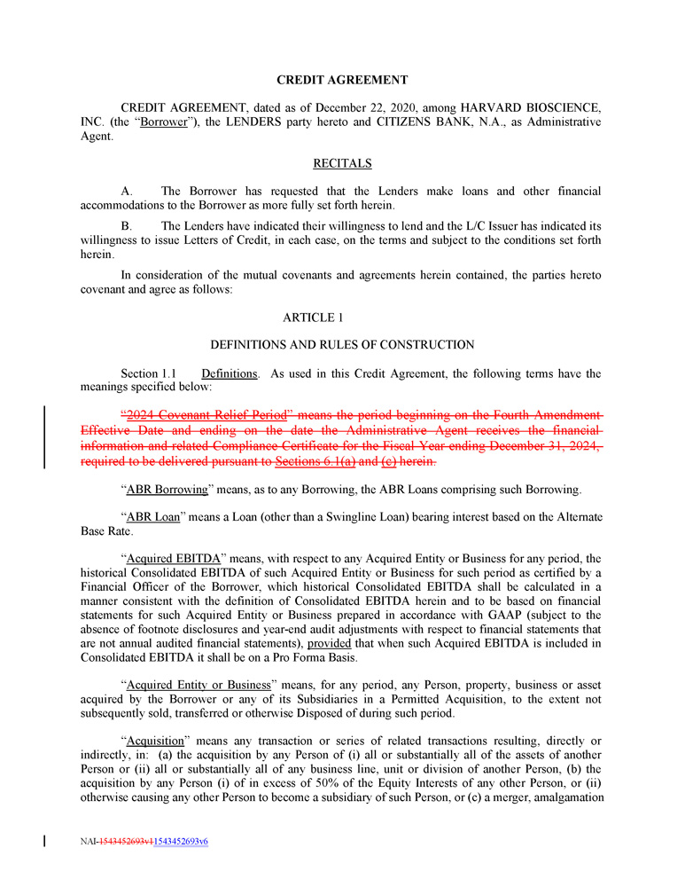 CREDIT AGREEMENT CREDIT AGREEMENT, dated as of December 22 , 2020 , among HARVARD BIOSCIENCE, INC . (the “ Borrower ”), the LENDERS party hereto and CITIZENS BANK, N . A . , as Administrative Agent . RECITALS A. The Borrower has requested that the Lenders make loans and other financial accommodations to the Borrower as more fully set forth herein . B. The Lenders have indicated their willingness to lend and the L/C Issuer has indicated its willingness to issue Letters of Credit, in each case, on the terms and subject to the conditions set forth herein . In consideration of the mutual covenants and agreements herein contained, the parties hereto covenant and agree as follows : ARTICLE 1 DEFINITIONS AND RULES OF CONSTRUCTION Section 1 . 1 Definitions . As used in this Credit Agreement, the following terms have the meanings specified below : “ 2024 Covenant Relief Period ” means the period beginning on the Fourth Amendment Effective Date and ending on the date the Administrative Agent receives the financial information and related Compliance Certificate for the Fiscal Year ending December 31 , 2024 , required to be delivered pursuant to Sections 6 . 1 (a) and (c) herein . “ ABR Borrowing ” means, as to any Borrowing, the ABR Loans comprising such Borrowing . “ ABR Loan ” means a Loan (other than a Swingline Loan) bearing interest based on the Alternate Base Rate. “ Acquired EBITDA ” means, with respect to any Acquired Entity or Business for any period, the historical Consolidated EBITDA of such Acquired Entity or Business for such period as certified by a Financial Officer of the Borrower, which historical Consolidated EBITDA shall be calculated in a manner consistent with the definition of Consolidated EBITDA herein and to be based on financial statements for such Acquired Entity or Business prepared in accordance with GAAP (subject to the absence of footnote disclosures and year - end audit adjustments with respect to financial statements that are not annual audited financial statements), provided that when such Acquired EBITDA is included in Consolidated EBITDA it shall be on a Pro Forma Basis . “ Acquired Entity or Business ” means, for any period, any Person, property, business or asset acquired by the Borrower or any of its Subsidiaries in a Permitted Acquisition, to the extent not subsequently sold, transferred or otherwise Disposed of during such period . “ Acquisition ” means any transaction or series of related transactions resulting, directly or indirectly, in : (a) the acquisition by any Person of (i) all or substantially all of the assets of another Person or (ii) all or substantially all of any business line, unit or division of another Person, (b) the acquisition by any Person (i) of in excess of 50 % of the Equity Interests of any other Person, or (ii) otherwise causing any other Person to become a subsidiary of such Person, or (c) a merger, amalgamation NAI - 1543452693v1 1543452693v6
