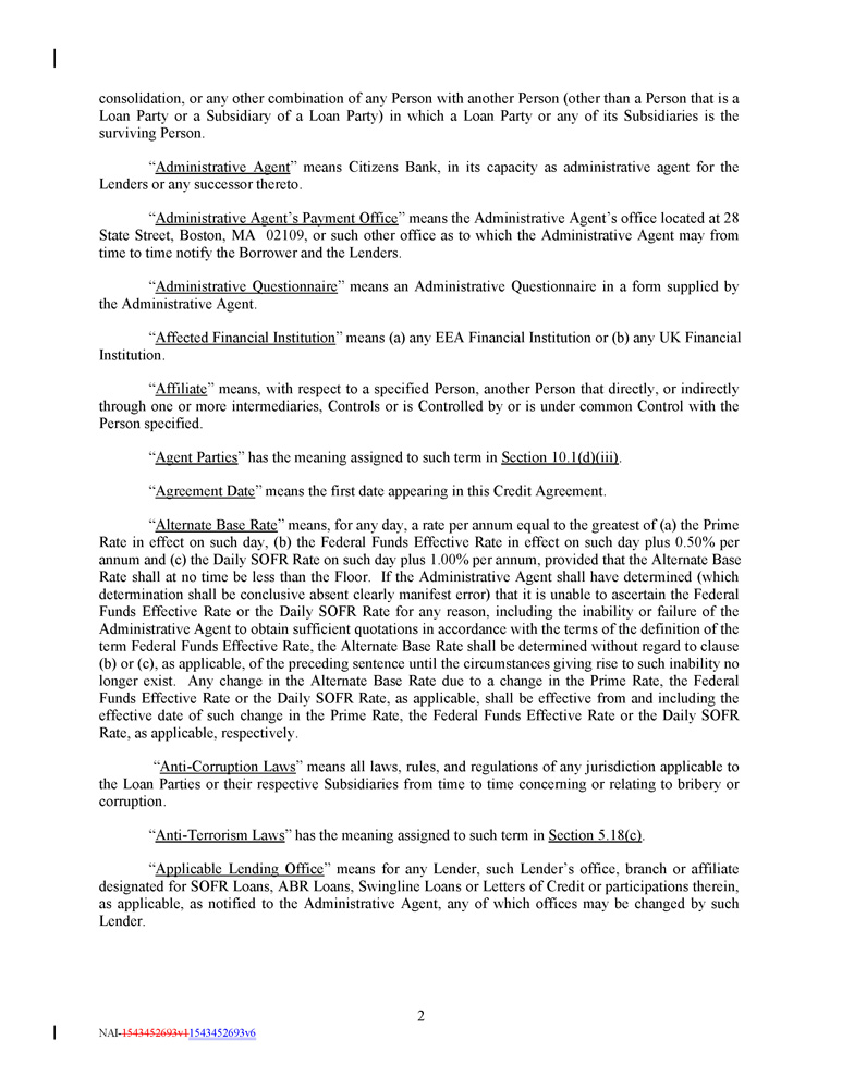 consolidation, or any other combination of any Person with another Person (other than a Person that is a Loan Party or a Subsidiary of a Loan Party) in which a Loan Party or any of its Subsidiaries is the surviving Person . “ Administrative Agent ” means Citizens Bank, in its capacity as administrative agent for the Lenders or any successor thereto . “ Administrative Agent’s Payment Office ” means the Administrative Agent’s office located at 28 State Street, Boston, MA 02109 , or such other office as to which the Administrative Agent may from time to time notify the Borrower and the Lenders . “ Administrative Questionnaire ” means an Administrative Questionnaire in a form supplied by the Administrative Agent . “ Affected Financial Institution ” means (a) any EEA Financial Institution or (b) any UK Financial Institution . “ Affiliate ” means, with respect to a specified Person, another Person that directly, or indirectly through one or more intermediaries, Controls or is Controlled by or is under common Control with the Person specified . “ Agent Parties ” has the meaning assigned to such term in Section 10 . 1 (d)(iii) . “ Agreement Date ” means the first date appearing in this Credit Agreement . “ Alternate Base Rate ” means, for any day, a rate per annum equal to the greatest of (a) the Prime Rate in effect on such day, (b) the Federal Funds Effective Rate in effect on such day plus 0 . 50 % per annum and (c) the Daily SOFR Rate on such day plus 1 . 00 % per annum, provided that the Alternate Base Rate shall at no time be less than the Floor . If the Administrative Agent shall have determined (which determination shall be conclusive absent clearly manifest error) that it is unable to ascertain the Federal Funds Effective Rate or the Daily SOFR Rate for any reason, including the inability or failure of the Administrative Agent to obtain sufficient quotations in accordance with the terms of the definition of the term Federal Funds Effective Rate, the Alternate Base Rate shall be determined without regard to clause (b) or (c), as applicable, of the preceding sentence until the circumstances giving rise to such inability no longer exist . Any change in the Alternate Base Rate due to a change in the Prime Rate, the Federal Funds Effective Rate or the Daily SOFR Rate, as applicable, shall be effective from and including the effective date of such change in the Prime Rate, the Federal Funds Effective Rate or the Daily SOFR Rate, as applicable, respectively . “ Anti - Corruption Laws ” means all laws, rules, and regulations of any jurisdiction applicable to the Loan Parties or their respective Subsidiaries from time to time concerning or relating to bribery or corruption . “ Anti - Terrorism Laws ” has the meaning assigned to such term in Section 5.18(c) . “ Applicable Lending Office ” means for any Lender, such Lender’s office, branch or affiliate designated for SOFR Loans, ABR Loans, Swingline Loans or Letters of Credit or participations therein, as applicable, as notified to the Administrative Agent, any of which offices may be changed by such Lender . 2 NAI - 1543452693v1 1543452693v6