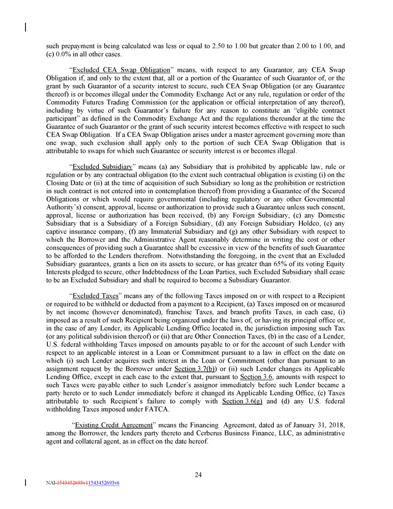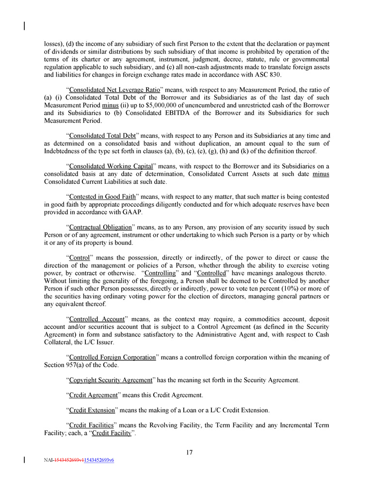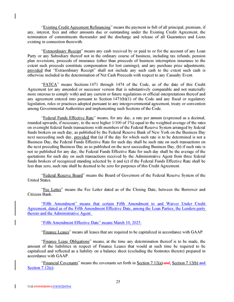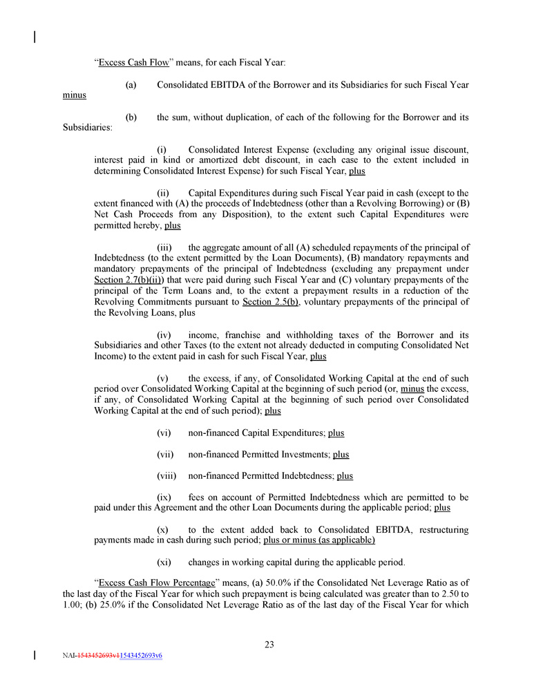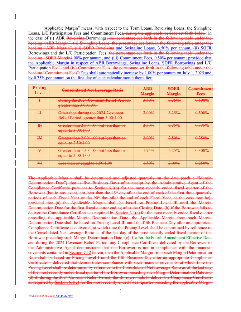 Commitment SOFR Margin ABR Margin Consolidated Net Leverage Ratio Pricing Level Fees 0.500% 3.75% 3.50% During the 2024 Covenant Relief Period, greater than 3.00:1.00 I 0.500% 3.25% 3.00% Other than during the 2024 Covenant Relief Period, greater than 3.00:1.00 II 0.375% 2.75% 2.50% Greater than 2.50:1.00 but less than or equal to 3.00:1.00 III 0.350% 2.50% 2.00% Greater than 2.00:1.00 but less than or equal to 2.50:1.00 IV 0.300% 2.25% 1.75% Greater than 1.50:1.00 but less than or equal to 2.00:1.00 V 0.250% 2.00% 1.50% Less than or equal to 1.50:1.00 VI The Applicable Margin shall be determined and adjusted quarterly on the date (each a “ Margin Determination Date ”) that is five Business Days after receipt by the Administrative Agent of the Compliance Certificate pursuant to Section 6 . 1 (c) for the most recently ended fiscal quarter of the Borrower (but in any event, not later than the 45 th day after the end of each of the first three quarterly periods of each Fiscal Year or the 90 th day after the end of each Fiscal Year, as the case may be) ; provided that (a) the Applicable Margin shall be based on Pricing Level III until the Margin Determination Date for the first fiscal quarter ending after the Closing Date, (b) if the Borrower fails to deliver the Compliance Certificate as required by Section 6 . 1 (c) for the most recently ended fiscal quarter preceding the applicable Margin Determination Date, the Applicable Margin from such Margin Determination Date shall be based on Pricing Level III until the fifth Business Day after an appropriate Compliance Certificate is delivered, at which time the Pricing Level shall be determined by reference to the Consolidated Net Leverage Ratio as of the last day of the most recently ended fiscal quarter of the Borrower preceding such Margin Determination Date, (c) if, after the Fourth Amendment Effective Date and during the 2024 Covenant Relief Period, any Compliance Certificate delivered by the Borrower to the Administrative Agent demonstrates that the Borrower is not in compliance with the financial covenants contained in Section 7 . 12 herein, then the Applicable Margin from such Margin Determination Date shall be based on Pricing Level I until the fifth Business Day after an appropriate Compliance Certificate is delivered that demonstrates compliance with such financial covenants, at which time the Pricing Level shall be determined by reference to the Consolidated Net Leverage Ratio as of the last day of the most recently ended fiscal quarter of the Borrower preceding such Margin Determination Date and (d) if, during the 2024 Covenant Relief Period, the Borrower fails to deliver the Compliance Certificate as required by Section 6 . 1 (c) for the most recently ended fiscal quarter preceding the applicable Margin “ Applicable Margin ” means, with respect to the Term Loans, Revolving Loans, the Swingline Loans, L/C Participation Fees and Commitment Fees , during the applicable periods set forth below : in the case of (i) ABR Revolving Borrowings , the percentage set forth in the following table under the heading “ABR Margin”, (ii) Swingline Loans, the percentage set forth in the following table under the heading “ABR Margin”, (iii) SOFR Revolving and Swingline Loans, 3 . 50 % per annum, (ii) SOFR Borrowings and the L/C Participation Fees, the percentage set forth in the following table under the heading “SOFR Margin 4 . 00 % per annum, and (iii) Commitment Fees, 0 . 50 % per annum ; provided that the Applicable Margin in respect of ABR Borrowings, Swingline Loans, SOFR Borrowings and L/C Participation Fee”, and (iv) Commitment Fees, the percentage set forth in the following table under the heading “Commitment Fees” : Fees shall automatically increase by 1 . 00 % per annum on July 1 , 2025 and by 0 . 75 % per annum on the first day of each calendar month thereafter . 3 NAI - 1543452693v1 1543452693v6