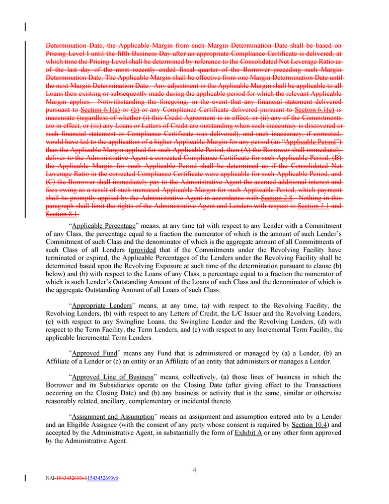 Determination Date, the Applicable Margin from such Margin Determination Date shall be based on Pricing Level I until the fifth Business Day after an appropriate Compliance Certificate is delivered, at which time the Pricing Level shall be determined by reference to the Consolidated Net Leverage Ratio as of the last day of the most recently ended fiscal quarter of the Borrower preceding such Margin Determination Date . The Applicable Margin shall be effective from one Margin Determination Date until the next Margin Determination Date . Any adjustment in the Applicable Margin shall be applicable to all Loans then existing or subsequently made during the applicable period for which the relevant Applicable Margin applies . Notwithstanding the foregoing, in the event that any financial statement delivered pursuant to Section 6 . 1 (a) or (b) or any Compliance Certificate delivered pursuant to Section 6 . 1 (c) is inaccurate (regardless of whether (i) this Credit Agreement is in effect, or (ii) any of the Commitments are in effect, or (iii) any Loans or Letters of Credit are outstanding when such inaccuracy is discovered or such financial statement or Compliance Certificate was delivered), and such inaccuracy, if corrected, would have led to the application of a higher Applicable Margin for any period (an “ Applicable Period ”) than the Applicable Margin applied for such Applicable Period, then (A) the Borrower shall immediately deliver to the Administrative Agent a corrected Compliance Certificate for such Applicable Period, (B) the Applicable Margin for such Applicable Period shall be determined as if the Consolidated Net Leverage Ratio in the corrected Compliance Certificate were applicable for such Applicable Period, and (C) the Borrower shall immediately pay to the Administrative Agent the accrued additional interest and fees owing as a result of such increased Applicable Margin for such Applicable Period, which payment shall be promptly applied by the Administrative Agent in accordance with Section 2 . 8 . Nothing in this paragraph shall limit the rights of the Administrative Agent and Lenders with respect to Section 3.1 and Section 8 . 1 . “ Applicable Percentage ” means, at any time (a) with respect to any Lender with a Commitment of any Class, the percentage equal to a fraction the numerator of which is the amount of such Lender’s Commitment of such Class and the denominator of which is the aggregate amount of all Commitments of such Class of all Lenders ( provided that if the Commitments under the Revolving Facility have terminated or expired, the Applicable Percentages of the Lenders under the Revolving Facility shall be determined based upon the Revolving Exposure at such time of the determination pursuant to clause (b) below) and (b) with respect to the Loans of any Class, a percentage equal to a fraction the numerator of which is such Lender’s Outstanding Amount of the Loans of such Class and the denominator of which is the aggregate Outstanding Amount of all Loans of such Class . 4 NAI - 1543452693v1 1543452693v6 “ Appropriate Lenders ” means, at any time, (a) with respect to the Revolving Facility, the Revolving Lenders, (b) with respect to any Letters of Credit, the L/C Issuer and the Revolving Lenders, (c) with respect to any Swingline Loans, the Swingline Lender and the Revolving Lenders, (d) with respect to the Term Facility, the Term Lenders, and (e) with respect to any Incremental Term Facility, the applicable Incremental Term Lenders . “ Approved Fund ” means any Fund that is administered or managed by (a) a Lender, (b) an Affiliate of a Lender or (c) an entity or an Affiliate of an entity that administers or manages a Lender . “ Approved Line of Business ” means, collectively, (a) those lines of business in which the Borrower and its Subsidiaries operate on the Closing Date (after giving effect to the Transactions occurring on the Closing Date) and (b) any business or activity that is the same, similar or otherwise reasonably related, ancillary, complementary or incidental thereto . “ Assignment and Assumption ” means an assignment and assumption entered into by a Lender and an Eligible Assignee (with the consent of any party whose consent is required by Section 10 . 4 ) and accepted by the Administrative Agent, in substantially the form of Exhibit A or any other form approved by the Administrative Agent .