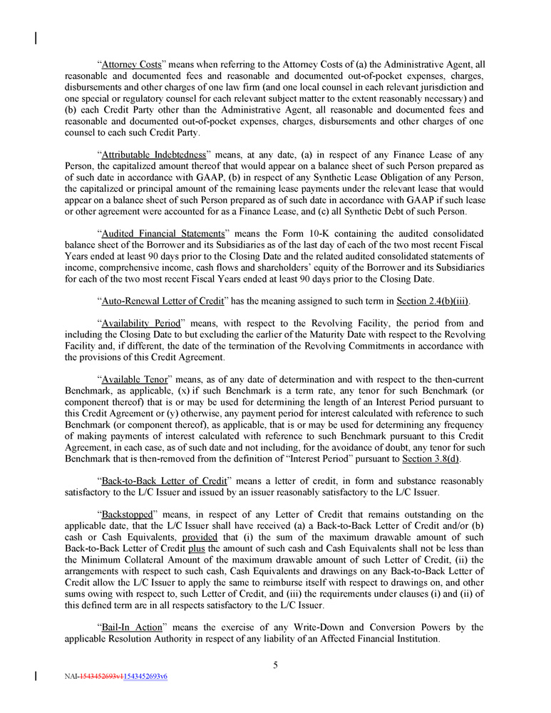 “ Attorney Costs ” means when referring to the Attorney Costs of (a) the Administrative Agent, all reasonable and documented fees and reasonable and documented out - of - pocket expenses, charges, disbursements and other charges of one law firm (and one local counsel in each relevant jurisdiction and one special or regulatory counsel for each relevant subject matter to the extent reasonably necessary) and (b) each Credit Party other than the Administrative Agent, all reasonable and documented fees and reasonable and documented out - of - pocket expenses, charges, disbursements and other charges of one counsel to each such Credit Party . “ Attributable Indebtedness ” means, at any date, (a) in respect of any Finance Lease of any Person, the capitalized amount thereof that would appear on a balance sheet of such Person prepared as of such date in accordance with GAAP, (b) in respect of any Synthetic Lease Obligation of any Person, the capitalized or principal amount of the remaining lease payments under the relevant lease that would appear on a balance sheet of such Person prepared as of such date in accordance with GAAP if such lease or other agreement were accounted for as a Finance Lease, and (c) all Synthetic Debt of such Person . “ Audited Financial Statements ” means the Form 10 - K containing the audited consolidated balance sheet of the Borrower and its Subsidiaries as of the last day of each of the two most recent Fiscal Years ended at least 90 days prior to the Closing Date and the related audited consolidated statements of income, comprehensive income, cash flows and shareholders’ equity of the Borrower and its Subsidiaries for each of the two most recent Fiscal Years ended at least 90 days prior to the Closing Date . “ Auto - Renewal Letter of Credit ” has the meaning assigned to such term in Section 2 . 4 (b)(iii) . “ Availability Period ” means, with respect to the Revolving Facility, the period from and including the Closing Date to but excluding the earlier of the Maturity Date with respect to the Revolving Facility and, if different, the date of the termination of the Revolving Commitments in accordance with the provisions of this Credit Agreement. “ Available Tenor ” means, as of any date of determination and with respect to the then - current Benchmark, as applicable, (x) if such Benchmark is a term rate, any tenor for such Benchmark (or component thereof) that is or may be used for determining the length of an Interest Period pursuant to this Credit Agreement or (y) otherwise, any payment period for interest calculated with reference to such Benchmark (or component thereof), as applicable, that is or may be used for determining any frequency of making payments of interest calculated with reference to such Benchmark pursuant to this Credit Agreement, in each case, as of such date and not including, for the avoidance of doubt, any tenor for such Benchmark that is then - removed from the definition of “Interest Period” pursuant to Section 3 . 8 (d) . “ Back - to - Back Letter of Credit ” means a letter of credit, in form and substance reasonably satisfactory to the L/C Issuer and issued by an issuer reasonably satisfactory to the L/C Issuer . “ Backstopped ” means, in respect of any Letter of Credit that remains outstanding on the applicable date, that the L/C Issuer shall have received (a) a Back - to - Back Letter of Credit and/or (b) cash or Cash Equivalents, provided that (i) the sum of the maximum drawable amount of such Back - to - Back Letter of Credit plus the amount of such cash and Cash Equivalents shall not be less than the Minimum Collateral Amount of the maximum drawable amount of such Letter of Credit, (ii) the arrangements with respect to such cash, Cash Equivalents and drawings on any Back - to - Back Letter of Credit allow the L/C Issuer to apply the same to reimburse itself with respect to drawings on, and other sums owing with respect to, such Letter of Credit, and (iii) the requirements under clauses (i) and (ii) of this defined term are in all respects satisfactory to the L/C Issuer . “ Bail - In Action ” means the exercise of any Write - Down and Conversion Powers by the applicable Resolution Authority in respect of any liability of an Affected Financial Institution . 5 NAI - 1543452693v1 1543452693v6