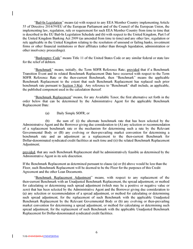 “ Bail - In Legislation ” means (a) with respect to any EEA Member Country implementing Article 55 of Directive 2014 / 59 /EU of the European Parliament and of the Council of the European Union, the implementing law, regulation, rule or requirement for such EEA Member Country from time to time that is described in the EU Bail - In Legislation Schedule and (b) with respect to the United Kingdom, Part I of the United Kingdom Banking Act 2009 (as amended from time to time) and any other law, regulation or rule applicable in the United Kingdom relating to the resolution of unsound or failing banks, investment firms or other financial institutions or their affiliates (other than through liquidation, administration or other insolvency proceedings) . “ Bankruptcy Code ” means Title 11 of the United States Code or any similar federal or state law for the relief of debtors . “ Benchmark ” means, initially, the Term SOFR Reference Rate ; provided that if a Benchmark Transition Event and its related Benchmark Replacement Date have occurred with respect to the Term SOFR Reference Rate or the then - current Benchmark, then “Benchmark” means the applicable Benchmark Replacement to the extent that such Benchmark Replacement has replaced such prior benchmark rate pursuant to Section 3 . 8 (a) . Any reference to “Benchmark” shall include, as applicable, the published component used in the calculation thereof . “ Benchmark Replacement ” means, for any Available Tenor, the first alternative set forth in the order below that can be determined by the Administrative Agent for the applicable Benchmark Replacement Date : (a) Daily Simple SOFR; or (b) the sum of : (i) the alternate benchmark rate that has been selected by the Administrative Agent and the Borrower giving due consideration to (A) any selection or recommendation of a replacement benchmark rate or the mechanism for determining such a rate by the Relevant Governmental Body or (B) any evolving or then - prevailing market convention for determining a benchmark rate and an adjustment as a replacement to the then - current Benchmark for Dollar - denominated syndicated credit facilities at such time and (ii) the related Benchmark Replacement Adjustment ; provided , that any such Benchmark Replacement shall be administratively feasible as determined by the Administrative Agent in its sole discretion. If the Benchmark Replacement as determined pursuant to clause (a) or (b) above would be less than the Floor, such Benchmark Replacement will be deemed to be the Floor for the purposes of this Credit Agreement and the other Loan Documents. “ Benchmark Replacement Adjustment ” means, with respect to any replacement of the then - current Benchmark with an Unadjusted Benchmark Replacement, the spread adjustment, or method for calculating or determining such spread adjustment (which may be a positive or negative value or zero) that has been selected by the Administrative Agent and the Borrower giving due consideration to (a) any selection or recommendation of a spread adjustment, or method for calculating or determining such spread adjustment, for the replacement of such Benchmark with the applicable Unadjusted Benchmark Replacement by the Relevant Governmental Body or (b) any evolving or then - prevailing market convention for determining a spread adjustment, or method for calculating or determining such spread adjustment, for the replacement of such Benchmark with the applicable Unadjusted Benchmark Replacement for Dollar - denominated syndicated credit facilities . 6 NAI - 1543452693v1 1543452693v6