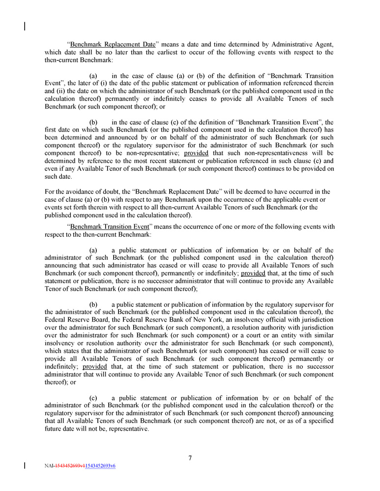 “ Benchmark Replacement Date ” means a date and time determined by Administrative Agent, which date shall be no later than the earliest to occur of the following events with respect to the then - current Benchmark : (a) in the case of clause (a) or (b) of the definition of “Benchmark Transition Event”, the later of (i) the date of the public statement or publication of information referenced therein and (ii) the date on which the administrator of such Benchmark (or the published component used in the calculation thereof) permanently or indefinitely ceases to provide all Available Tenors of such Benchmark (or such component thereof) ; or (b) in the case of clause (c) of the definition of “Benchmark Transition Event”, the first date on which such Benchmark (or the published component used in the calculation thereof) has been determined and announced by or on behalf of the administrator of such Benchmark (or such component thereof) or the regulatory supervisor for the administrator of such Benchmark (or such component thereof) to be non - representative ; provided that such non - representativeness will be determined by reference to the most recent statement or publication referenced in such clause (c) and even if any Available Tenor of such Benchmark (or such component thereof) continues to be provided on such date . For the avoidance of doubt, the “Benchmark Replacement Date” will be deemed to have occurred in the case of clause (a) or (b) with respect to any Benchmark upon the occurrence of the applicable event or events set forth therein with respect to all then - current Available Tenors of such Benchmark (or the published component used in the calculation thereof). “ Benchmark Transition Event ” means the occurrence of one or more of the following events with respect to the then - current Benchmark: (a) a public statement or publication of information by or on behalf of the administrator of such Benchmark (or the published component used in the calculation thereof) announcing that such administrator has ceased or will cease to provide all Available Tenors of such Benchmark (or such component thereof), permanently or indefinitely ; provided that, at the time of such statement or publication, there is no successor administrator that will continue to provide any Available Tenor of such Benchmark (or such component thereof) ; (b) a public statement or publication of information by the regulatory supervisor for the administrator of such Benchmark (or the published component used in the calculation thereof), the Federal Reserve Board, the Federal Reserve Bank of New York, an insolvency official with jurisdiction over the administrator for such Benchmark (or such component), a resolution authority with jurisdiction over the administrator for such Benchmark (or such component) or a court or an entity with similar insolvency or resolution authority over the administrator for such Benchmark (or such component), which states that the administrator of such Benchmark (or such component) has ceased or will cease to provide all Available Tenors of such Benchmark (or such component thereof) permanently or indefinitely ; provided that, at the time of such statement or publication, there is no successor administrator that will continue to provide any Available Tenor of such Benchmark (or such component thereof) ; or (c) a public statement or publication of information by or on behalf of the administrator of such Benchmark (or the published component used in the calculation thereof) or the regulatory supervisor for the administrator of such Benchmark (or such component thereof) announcing that all Available Tenors of such Benchmark (or such component thereof) are not, or as of a specified future date will not be, representative . 7 NAI - 1543452693v1 1543452693v6