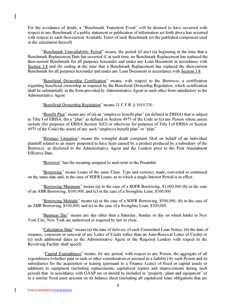 For the avoidance of doubt, a “Benchmark Transition Event” will be deemed to have occurred with respect to any Benchmark if a public statement or publication of information set forth above has occurred with respect to each then - current Available Tenor of such Benchmark (or the published component used in the calculation thereof) . “ Benchmark Unavailability Period ” means, the period (if any) (a) beginning at the time that a Benchmark Replacement Date has occurred if, at such time, no Benchmark Replacement has replaced the then - current Benchmark for all purposes hereunder and under any Loan Document in accordance with Section 3 . 8 and (b) ending at the time that a Benchmark Replacement has replaced the then - current Benchmark for all purposes hereunder and under any Loan Document in accordance with Section 3 . 8 . “ Beneficial Ownership Certification ” means, with respect to the Borrower, a certification regarding beneficial ownership as required by the Beneficial Ownership Regulation, which certification shall be substantially in the form provided by Administrative Agent or such other form satisfactory to the Administrative Agent . “ Beneficial Ownership Regulation ” means 31 C.F.R. † 1010.230. “ Benefit Plan ” means any of (a) an “employee benefit plan” (as defined in ERISA) that is subject to Title I of ERISA, (b) a “plan” as defined in Section 4975 of the Code or (c) any Person whose assets include (for purposes of ERISA Section 3 ( 42 ) or otherwise for purposes of Title I of ERISA or Section 4975 of the Code) the assets of any such “employee benefit plan” or “plan” . “ Biostage Litigation ” means the wrongful death complaint filed on behalf of an individual plaintiff related to an injury purported to have been caused by a product produced by a subsidiary of the Borrower, as disclosed to the Administrative Agent and the Lenders prior to the First Amendment Effective Date . “ Borrower ” has the meaning assigned to such term in the Preamble. “ Borrowing ” means Loans of the same Class, Type and currency made, converted or continued on the same date and, in the case of SOFR Loans, as to which a single Interest Period is in effect . “ Borrowing Minimum ” means (a) in the case of a SOFR Borrowing, $ 1 , 000 , 000 (b) in the case of an ABR Borrowing, $ 100 , 000 , and (c) in the case of a Swingline Loan, $ 100 , 000 . “ Borrowing Multiple ” means (a) in the case of a SOFR Borrowing, $ 500 , 000 , (b) in the case of an ABR Borrowing, $ 100 , 000 , and (c) in the case of a Swingline Loan, $ 100 , 000 . “ Business Day ” means any day other than a Saturday, Sunday or day on which banks in New York City, New York are authorized or required by law to close . “ Calculation Date ” means (a) the date of delivery of each Committed Loan Notice, (b) the date of issuance, extension or renewal of any Letter of Credit (other than an Auto - Renewal Letter of Credit) or (c) such additional dates as the Administrative Agent or the Required Lenders with respect to the Revolving Facility shall specify. “ Capital Expenditures ” means, for any period, with respect to any Person, the aggregate of all expenditures (whether paid in cash or other consideration or accrued as a liability) by such Person and its subsidiaries for the acquisition or leasing (pursuant to a Finance Lease) of fixed or capital assets or additions to equipment (including replacements, capitalized repairs and improvements during such period) that in accordance with GAAP are or should be included in “property, plant and equipment” or in a similar fixed asset account on its balance sheet (including all capitalized lease obligations that are 8 NAI - 1543452693v1 1543452693v6