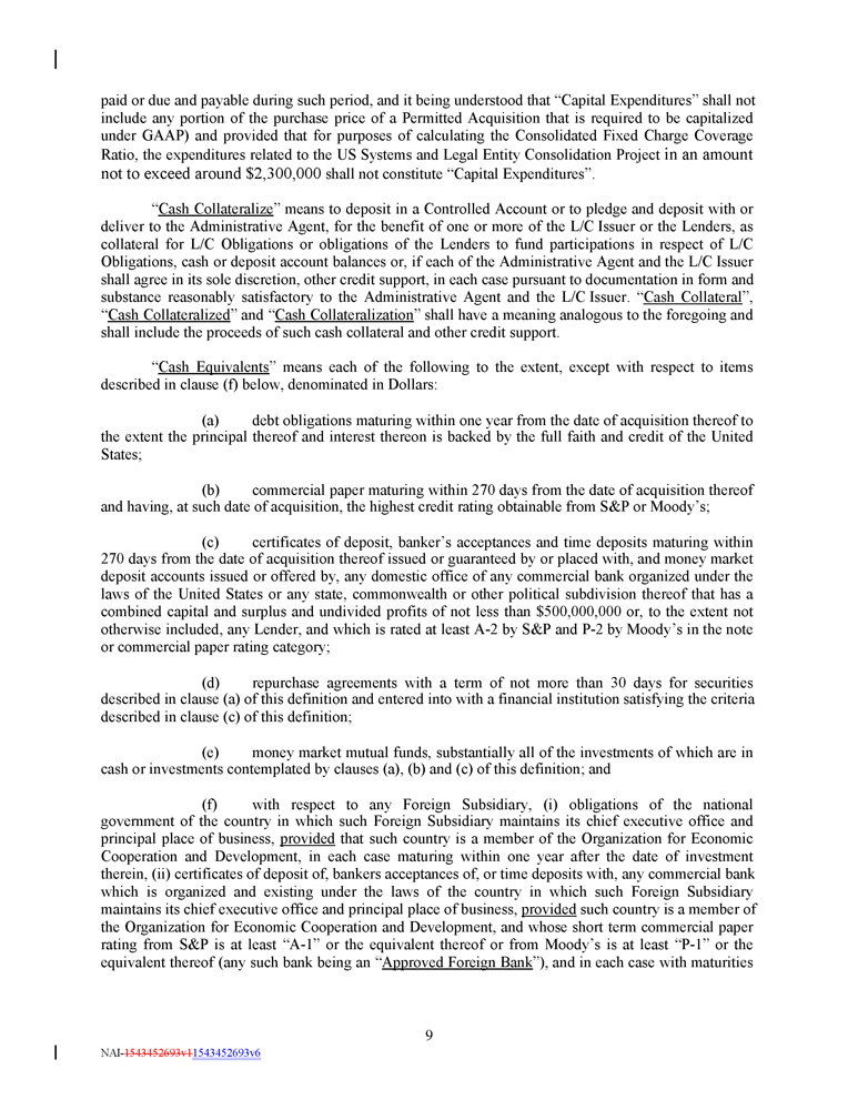 paid or due and payable during such period, and it being understood that “Capital Expenditures” shall not include any portion of the purchase price of a Permitted Acquisition that is required to be capitalized under GAAP) and provided that for purposes of calculating the Consolidated Fixed Charge Coverage Ratio, the expenditures related to the US Systems and Legal Entity Consolidation Project in an amount not to exceed around $ 2 , 300 , 000 shall not constitute “Capital Expenditures” . “ Cash Collateralize ” means to deposit in a Controlled Account or to pledge and deposit with or deliver to the Administrative Agent, for the benefit of one or more of the L/C Issuer or the Lenders, as collateral for L/C Obligations or obligations of the Lenders to fund participations in respect of L/C Obligations, cash or deposit account balances or, if each of the Administrative Agent and the L/C Issuer shall agree in its sole discretion, other credit support, in each case pursuant to documentation in form and substance reasonably satisfactory to the Administrative Agent and the L/C Issuer . “ Cash Collateral ”, “ Cash Collateralized ” and “ Cash Collateralization ” shall have a meaning analogous to the foregoing and shall include the proceeds of such cash collateral and other credit support . “ Cash Equivalents ” means each of the following to the extent, except with respect to items described in clause (f) below, denominated in Dollars : (a) debt obligations maturing within one year from the date of acquisition thereof to the extent the principal thereof and interest thereon is backed by the full faith and credit of the United States ; (b) commercial paper maturing within 270 days from the date of acquisition thereof and having, at such date of acquisition, the highest credit rating obtainable from S&P or Moody’s ; (c) certificates of deposit, banker’s acceptances and time deposits maturing within 270 days from the date of acquisition thereof issued or guaranteed by or placed with, and money market deposit accounts issued or offered by, any domestic office of any commercial bank organized under the laws of the United States or any state, commonwealth or other political subdivision thereof that has a combined capital and surplus and undivided profits of not less than $ 500 , 000 , 000 or, to the extent not otherwise included, any Lender, and which is rated at least A - 2 by S&P and P - 2 by Moody’s in the note or commercial paper rating category ; (d) repurchase agreements with a term of not more than 30 days for securities described in clause (a) of this definition and entered into with a financial institution satisfying the criteria described in clause (c) of this definition ; (e) money market mutual funds, substantially all of the investments of which are in cash or investments contemplated by clauses (a), (b) and (c) of this definition ; and (f) with respect to any Foreign Subsidiary, (i) obligations of the national government of the country in which such Foreign Subsidiary maintains its chief executive office and principal place of business, provided that such country is a member of the Organization for Economic Cooperation and Development, in each case maturing within one year after the date of investment therein, (ii) certificates of deposit of, bankers acceptances of, or time deposits with, any commercial bank which is organized and existing under the laws of the country in which such Foreign Subsidiary maintains its chief executive office and principal place of business, provided such country is a member of the Organization for Economic Cooperation and Development, and whose short term commercial paper rating from S&P is at least “A - 1 ” or the equivalent thereof or from Moody’s is at least “P - 1 ” or the equivalent thereof (any such bank being an “ Approved Foreign Bank ”), and in each case with maturities 9 NAI - 1543452693v1 1543452693v6