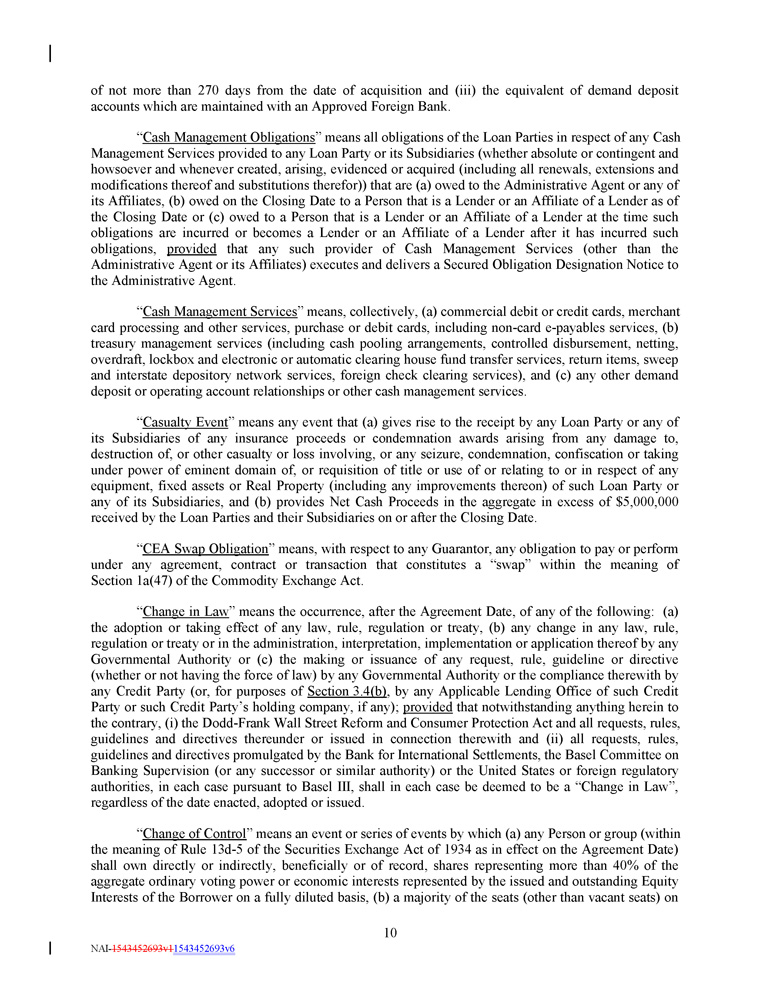 of not more than 270 days from the date of acquisition and (iii) the equivalent of demand deposit accounts which are maintained with an Approved Foreign Bank. “ Cash Management Obligations ” means all obligations of the Loan Parties in respect of any Cash Management Services provided to any Loan Party or its Subsidiaries (whether absolute or contingent and howsoever and whenever created, arising, evidenced or acquired (including all renewals, extensions and modifications thereof and substitutions therefor)) that are (a) owed to the Administrative Agent or any of its Affiliates, (b) owed on the Closing Date to a Person that is a Lender or an Affiliate of a Lender as of the Closing Date or (c) owed to a Person that is a Lender or an Affiliate of a Lender at the time such obligations are incurred or becomes a Lender or an Affiliate of a Lender after it has incurred such obligations, provided that any such provider of Cash Management Services (other than the Administrative Agent or its Affiliates) executes and delivers a Secured Obligation Designation Notice to the Administrative Agent . “ Cash Management Services ” means, collectively, (a) commercial debit or credit cards, merchant card processing and other services, purchase or debit cards, including non - card e - payables services, (b) treasury management services (including cash pooling arrangements, controlled disbursement, netting, overdraft, lockbox and electronic or automatic clearing house fund transfer services, return items, sweep and interstate depository network services, foreign check clearing services), and (c) any other demand deposit or operating account relationships or other cash management services . “ Casualty Event ” means any event that (a) gives rise to the receipt by any Loan Party or any of its Subsidiaries of any insurance proceeds or condemnation awards arising from any damage to, destruction of, or other casualty or loss involving, or any seizure, condemnation, confiscation or taking under power of eminent domain of, or requisition of title or use of or relating to or in respect of any equipment, fixed assets or Real Property (including any improvements thereon) of such Loan Party or any of its Subsidiaries, and (b) provides Net Cash Proceeds in the aggregate in excess of $ 5 , 000 , 000 received by the Loan Parties and their Subsidiaries on or after the Closing Date . “ CEA Swap Obligation ” means, with respect to any Guarantor, any obligation to pay or perform under any agreement, contract or transaction that constitutes a “swap” within the meaning of Section 1 a( 47 ) of the Commodity Exchange Act . “ Change in Law ” means the occurrence, after the Agreement Date, of any of the following : (a) the adoption or taking effect of any law, rule, regulation or treaty, (b) any change in any law, rule, regulation or treaty or in the administration, interpretation, implementation or application thereof by any Governmental Authority or (c) the making or issuance of any request, rule, guideline or directive (whether or not having the force of law) by any Governmental Authority or the compliance therewith by any Credit Party (or, for purposes of Section 3 . 4 (b) , by any Applicable Lending Office of such Credit Party or such Credit Party’s holding company, if any) ; provided that notwithstanding anything herein to the contrary, (i) the Dodd - Frank Wall Street Reform and Consumer Protection Act and all requests, rules, guidelines and directives thereunder or issued in connection therewith and (ii) all requests, rules, guidelines and directives promulgated by the Bank for International Settlements, the Basel Committee on Banking Supervision (or any successor or similar authority) or the United States or foreign regulatory authorities, in each case pursuant to Basel III, shall in each case be deemed to be a “Change in Law”, regardless of the date enacted, adopted or issued . “ Change of Control ” means an event or series of events by which (a) any Person or group (within the meaning of Rule 13 d - 5 of the Securities Exchange Act of 1934 as in effect on the Agreement Date) shall own directly or indirectly, beneficially or of record, shares representing more than 40 % of the aggregate ordinary voting power or economic interests represented by the issued and outstanding Equity Interests of the Borrower on a fully diluted basis, (b) a majority of the seats (other than vacant seats) on 10 NAI - 1543452693v1 1543452693v6