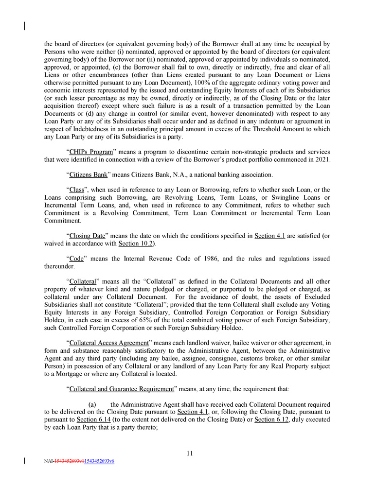 the board of directors (or equivalent governing body) of the Borrower shall at any time be occupied by Persons who were neither (i) nominated, approved or appointed by the board of directors (or equivalent governing body) of the Borrower nor (ii) nominated, approved or appointed by individuals so nominated, approved, or appointed, (c) the Borrower shall fail to own, directly or indirectly, free and clear of all Liens or other encumbrances (other than Liens created pursuant to any Loan Document or Liens otherwise permitted pursuant to any Loan Document), 100 % of the aggregate ordinary voting power and economic interests represented by the issued and outstanding Equity Interests of each of its Subsidiaries (or such lesser percentage as may be owned, directly or indirectly, as of the Closing Date or the later acquisition thereof) except where such failure is as a result of a transaction permitted by the Loan Documents or (d) any change in control (or similar event, however denominated) with respect to any Loan Party or any of its Subsidiaries shall occur under and as defined in any indenture or agreement in respect of Indebtedness in an outstanding principal amount in excess of the Threshold Amount to which any Loan Party or any of its Subsidiaries is a party . “ CHIPs Program ” means a program to discontinue certain non - strategic products and services that were identified in connection with a review of the Borrower’s product portfolio commenced in 2021 . “ Citizens Bank ” means Citizens Bank, N.A., a national banking association. “ Class ”, when used in reference to any Loan or Borrowing, refers to whether such Loan, or the Loans comprising such Borrowing, are Revolving Loans, Term Loans, or Swingline Loans or Incremental Term Loans, and, when used in reference to any Commitment, refers to whether such Commitment is a Revolving Commitment, Term Loan Commitment or Incremental Term Loan Commitment . “ Closing Date ” means the date on which the conditions specified in Section 4 . 1 are satisfied (or waived in accordance with Section 10 . 2 ) . “ Code ” means the Internal Revenue Code of 1986 , and the rules and regulations issued thereunder . “ Collateral ” means all the “Collateral” as defined in the Collateral Documents and all other property of whatever kind and nature pledged or charged, or purported to be pledged or charged, as collateral under any Collateral Document . For the avoidance of doubt, the assets of Excluded Subsidiaries shall not constitute “Collateral” ; provided that the term Collateral shall exclude any Voting Equity Interests in any Foreign Subsidiary, Controlled Foreign Corporation or Foreign Subsidiary Holdco, in each case in excess of 65 % of the total combined voting power of such Foreign Subsidiary, such Controlled Foreign Corporation or such Foreign Subsidiary Holdco . “ Collateral Access Agreement ” means each landlord waiver, bailee waiver or other agreement, in form and substance reasonably satisfactory to the Administrative Agent, between the Administrative Agent and any third party (including any bailee, assignee, consignee, customs broker, or other similar Person) in possession of any Collateral or any landlord of any Loan Party for any Real Property subject to a Mortgage or where any Collateral is located . “ Collateral and Guarantee Requirement ” means, at any time, the requirement that: (a) the Administrative Agent shall have received each Collateral Document required to be delivered on the Closing Date pursuant to Section 4 . 1 , or, following the Closing Date, pursuant to pursuant to Section 6 . 14 (to the extent not delivered on the Closing Date) or Section 6 . 12 , duly executed by each Loan Party that is a party thereto ; 11 NAI - 1543452693v1 1543452693v6