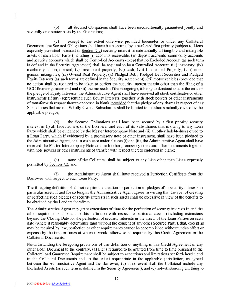(b) all Secured Obligations shall have been unconditionally guaranteed jointly and severally on a senior basis by the Guarantors; (c) except to the extent otherwise provided hereunder or under any Collateral Document, the Secured Obligations shall have been secured by a perfected first priority (subject to Liens expressly permitted pursuant to Section 7 . 2 ) security interest in substantially all tangible and intangible assets of each Loan Party (including (i) accounts receivable, (ii) deposit accounts, commodity accounts and security accounts which shall be Controlled Accounts except that no Excluded Account (as such term is defined in the Security Agreement) shall be required to be a Controlled Account, (iii) inventory, (iv) machinery and equipment, (v) investment property, (vi) cash, (vii) Intellectual Property, (viii) other general intangibles, (ix) Owned Real Property, (x) Pledged Debt, Pledged Debt Securities and Pledged Equity Interests (as such terms are defined in the Security Agreement), (xi) motor vehicles ( provided that no action shall be required to be taken to perfect the security interest therein other than the filing of a UCC financing statement) and (xii) the proceeds of the foregoing), it being understood that in the case of the pledge of Equity Interests, the Administrative Agent shall have received all stock certificates or other instruments (if any) representing such Equity Interests, together with stock powers or other instruments of transfer with respect thereto endorsed in blank ; provided that the pledge of any shares in respect of any Subsidiaries that are not Wholly - Owned Subsidiaries shall be limited to the shares actually owned by the applicable pledgor ; (d) the Secured Obligations shall have been secured by a first priority security interest in (i) all Indebtedness of the Borrower and each of its Subsidiaries that is owing to any Loan Party which shall be evidenced by the Master Intercompany Note and (ii) all other Indebtedness owed to a Loan Party, which if evidenced by a promissory note or other instrument, shall have been pledged to the Administrative Agent, and in each case under clauses (i) and (ii), the Administrative Agent shall have received the Master Intercompany Note and such other promissory notes and other instruments together with note powers or other instruments of transfer with respect thereto endorsed in blank ; (e) none of the Collateral shall be subject to any Lien other than Liens expressly permitted by Section 7.2 ; and (f) the Administrative Agent shall have received a Perfection Certificate from the Borrower with respect to each Loan Party. The foregoing definition shall not require the creation or perfection of pledges of or security interests in particular assets if and for so long as the Administrative Agent agrees in writing that the cost of creating or perfecting such pledges or security interests in such assets shall be excessive in view of the benefits to be obtained by the Lenders therefrom . The Administrative Agent may grant extensions of time for the perfection of security interests in and the other requirements pursuant to this definition with respect to particular assets (including extensions beyond the Closing Date for the perfection of security interests in the assets of the Loan Parties on such date) where it reasonably determines (and without the consent of any other Secured Party), that, except as may be required by law, perfection or other requirements cannot be accomplished without undue effort or expense by the time or times at which it would otherwise be required by this Credit Agreement or the Collateral Documents . Notwithstanding the foregoing provisions of this definition or anything in this Credit Agreement or any other Loan Document to the contrary, (a) Liens required to be granted from time to time pursuant to the Collateral and Guarantee Requirement shall be subject to exceptions and limitations set forth herein and in the Collateral Documents and, to the extent appropriate in the applicable jurisdiction, as agreed between the Administrative Agent and the Borrower, (b) in no event shall the Collateral include any Excluded Assets (as such term is defined in the Security Agreement), and (c) notwithstanding anything to 12 NAI - 1543452693v1 1543452693v6