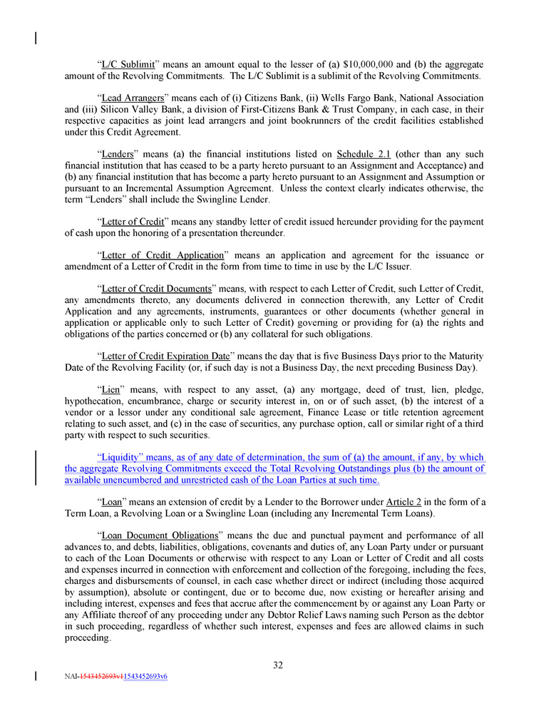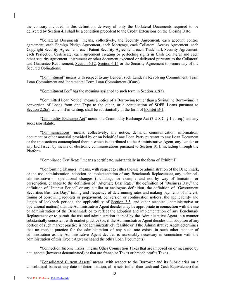 the contrary included in this definition, delivery of only the Collateral Documents required to be delivered by Section 4 . 1 shall be a condition precedent to the Credit Extensions on the Closing Date . “ Collateral Documents ” means, collectively, the Security Agreement, each account control agreement, each Foreign Pledge Agreement, each Mortgage, each Collateral Access Agreement, each Copyright Security Agreement, each Patent Security Agreement, each Trademark Security Agreement, each Perfection Certificate, each agreement creating or perfecting rights in Cash Collateral and each other security agreement, instrument or other document executed or delivered pursuant to the Collateral and Guarantee Requirement, Section 6 . 12 , Section 6 . 14 or the Security Agreement to secure any of the Secured Obligations . “ Commitment ” means with respect to any Lender, such Lender’s Revolving Commitment, Term Loan Commitment and Incremental Term Loan Commitment (if any) . “ Commitment Fee ” has the meaning assigned to such term in Section 3 . 2 (a) . “ Committed Loan Notice ” means a notice of a Borrowing (other than a Swingline Borrowing), a conversion of Loans from one Type to the other, or a continuation of SOFR Loans pursuant to Section 2 . 2 (a) , which, if in writing, shall be substantially in the form of Exhibit B - 1 . “ Commodity Exchange Act ” means the Commodity Exchange Act ( 7 U . S . C . † 1 et seq . ) and any successor statute . “ Communications ” means, collectively, any notice, demand, communication, information, document or other material provided by or on behalf of any Loan Party pursuant to any Loan Document or the transactions contemplated therein which is distributed to the Administrative Agent, any Lender or any L/C Issuer by means of electronic communications pursuant to Section 10 . 1 , including through the Platform . “ Compliance Certificate ” means a certificate, substantially in the form of Exhibit D . “ Conforming Changes ” means, with respect to either the use or administration of the Benchmark, or the use, administration, adoption or implementation of any Benchmark Replacement, any technical, administrative or operational changes (including, for example and not by way of limitation or prescription, changes to the definition of “Alternate Base Rate,” the definition of “Business Day,” the definition of “Interest Period” or any similar or analogous definition, the definition of “Government Securities Business Day,” timing and frequency of determining rates and making payments of interest, timing of borrowing requests or prepayment, conversion or continuation notices, the applicability and length of lookback periods, the applicability of Section 3 . 5 , and other technical, administrative or operational matters) that the Administrative Agent decides may be appropriate in connection with the use or administration of the Benchmark or to reflect the adoption and implementation of any Benchmark Replacement or to permit the use and administration thereof by the Administrative Agent in a manner substantially consistent with market practice (or, if the Administrative Agent decides that adoption of any portion of such market practice is not administratively feasible or if the Administrative Agent determines that no market practice for the administration of any such rate exists, in such other manner of administration as the Administrative Agent decides is reasonably necessary in connection with the administration of this Credit Agreement and the other Loan Documents) . “ Connection Income Taxes ” means Other Connection Taxes that are imposed on or measured by net income (however denominated) or that are franchise Taxes or branch profits Taxes . “ Consolidated Current Assets ” means, with respect to the Borrower and its Subsidiaries on a consolidated basis at any date of determination, all assets (other than cash and Cash Equivalents) that 13 NAI - 1543452693v1 1543452693v6