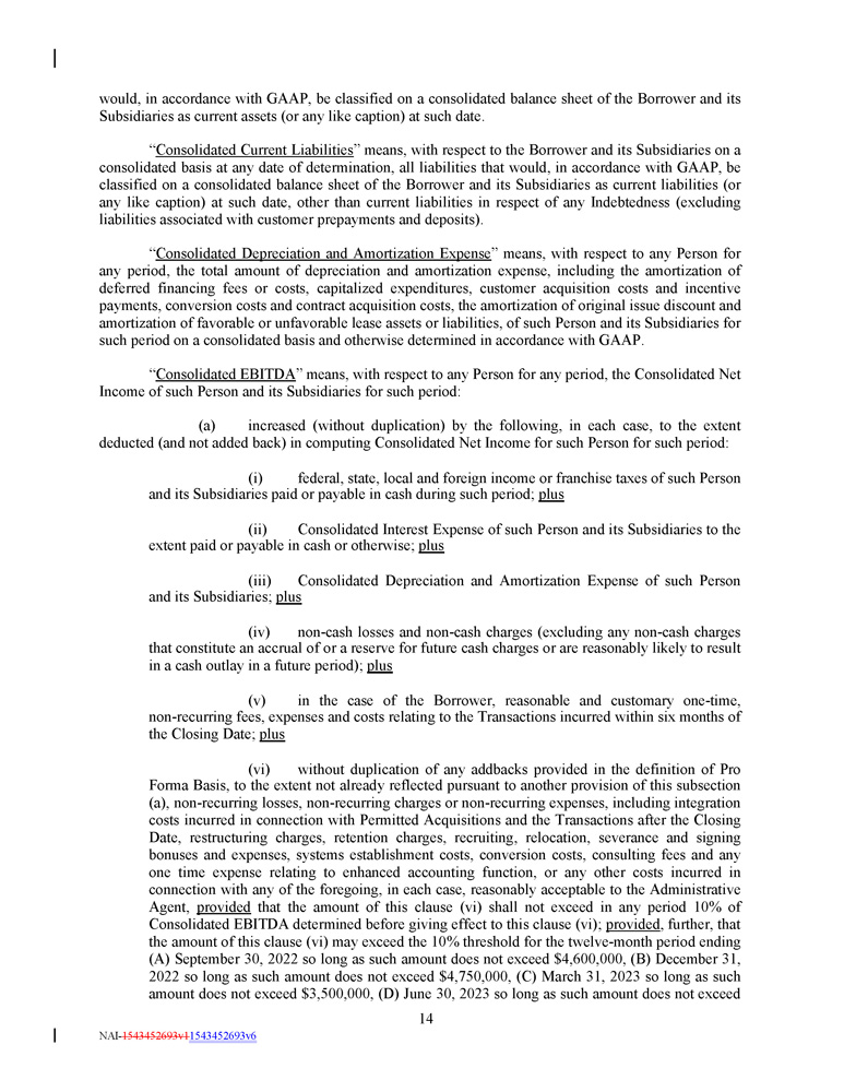 would, in accordance with GAAP, be classified on a consolidated balance sheet of the Borrower and its Subsidiaries as current assets (or any like caption) at such date. “ Consolidated Current Liabilities ” means, with respect to the Borrower and its Subsidiaries on a consolidated basis at any date of determination, all liabilities that would, in accordance with GAAP, be classified on a consolidated balance sheet of the Borrower and its Subsidiaries as current liabilities (or any like caption) at such date, other than current liabilities in respect of any Indebtedness (excluding liabilities associated with customer prepayments and deposits) . “ Consolidated Depreciation and Amortization Expense ” means, with respect to any Person for any period, the total amount of depreciation and amortization expense, including the amortization of deferred financing fees or costs, capitalized expenditures, customer acquisition costs and incentive payments, conversion costs and contract acquisition costs, the amortization of original issue discount and amortization of favorable or unfavorable lease assets or liabilities, of such Person and its Subsidiaries for such period on a consolidated basis and otherwise determined in accordance with GAAP . “ Consolidated EBITDA ” means, with respect to any Person for any period, the Consolidated Net Income of such Person and its Subsidiaries for such period : (a) increased (without duplication) by the following, in each case, to the extent deducted (and not added back) in computing Consolidated Net Income for such Person for such period: (i) federal, state, local and foreign income or franchise taxes of such Person and its Subsidiaries paid or payable in cash during such period; plus (ii) Consolidated Interest Expense of such Person and its Subsidiaries to the extent paid or payable in cash or otherwise; plus (iii) Consolidated Depreciation and Amortization Expense of such Person and its Subsidiaries; plus (iv) non - cash losses and non - cash charges (excluding any non - cash charges that constitute an accrual of or a reserve for future cash charges or are reasonably likely to result in a cash outlay in a future period) ; plus (v) in the case of the Borrower, reasonable and customary one - time, non - recurring fees, expenses and costs relating to the Transactions incurred within six months of the Closing Date ; plus (vi) without duplication of any addbacks provided in the definition of Pro Forma Basis, to the extent not already reflected pursuant to another provision of this subsection (a), non - recurring losses, non - recurring charges or non - recurring expenses, including integration costs incurred in connection with Permitted Acquisitions and the Transactions after the Closing Date, restructuring charges, retention charges, recruiting, relocation, severance and signing bonuses and expenses, systems establishment costs, conversion costs, consulting fees and any one time expense relating to enhanced accounting function, or any other costs incurred in connection with any of the foregoing, in each case, reasonably acceptable to the Administrative Agent, provided that the amount of this clause (vi) shall not exceed in any period 10 % of Consolidated EBITDA determined before giving effect to this clause (vi) ; provided , further, that the amount of this clause (vi) may exceed the 10 % threshold for the twelve - month period ending (A) September 30 , 2022 so long as such amount does not exceed $ 4 , 600 , 000 , (B) December 31 , 2022 so long as such amount does not exceed $ 4 , 750 , 000 , (C) March 31 , 2023 so long as such amount does not exceed $ 3 , 500 , 000 , (D) June 30 , 2023 so long as such amount does not exceed 14 NAI - 1543452693v1 1543452693v6