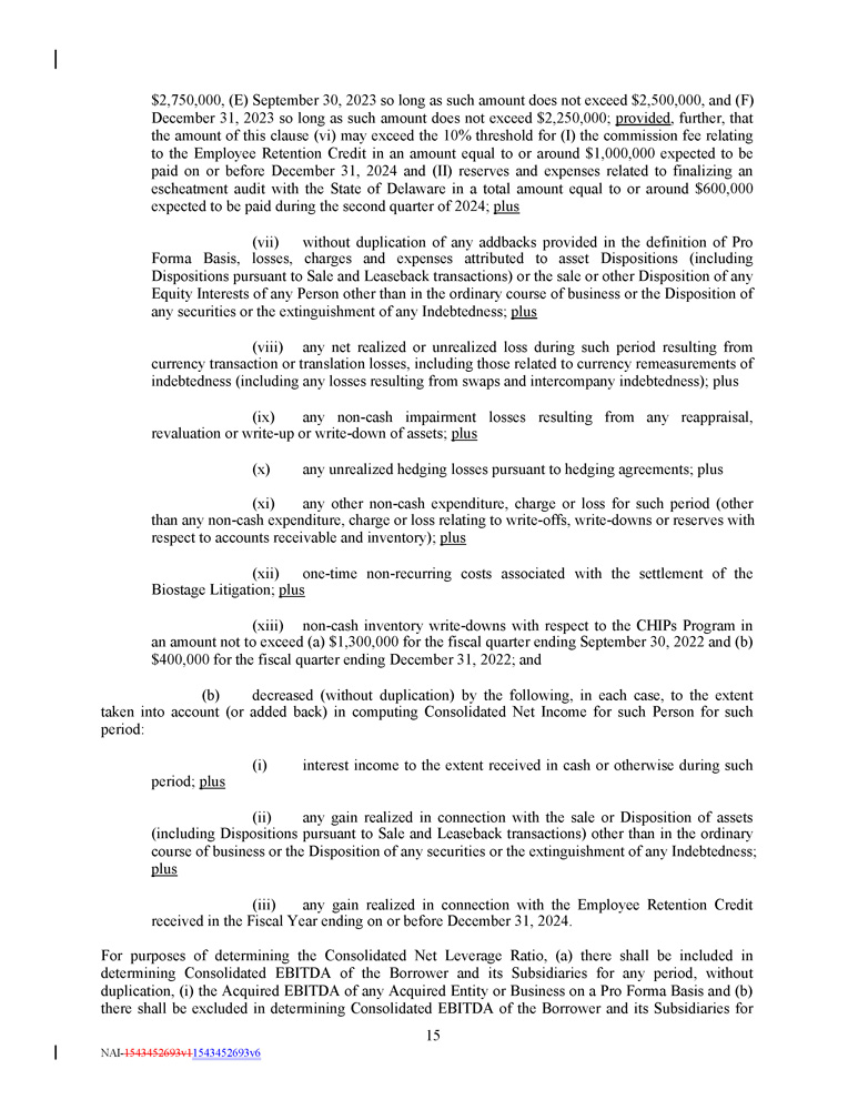 $ 2 , 750 , 000 , (E) September 30 , 2023 so long as such amount does not exceed $ 2 , 500 , 000 , and (F) December 31 , 2023 so long as such amount does not exceed $ 2 , 250 , 000 ; provided , further, that the amount of this clause (vi) may exceed the 10 % threshold for (I) the commission fee relating to the Employee Retention Credit in an amount equal to or around $ 1 , 000 , 000 expected to be paid on or before December 31 , 2024 and (II) reserves and expenses related to finalizing an escheatment audit with the State of Delaware in a total amount equal to or around $ 600 , 000 expected to be paid during the second quarter of 2024 ; plus (vii) without duplication of any addbacks provided in the definition of Pro Forma Basis, losses, charges and expenses attributed to asset Dispositions (including Dispositions pursuant to Sale and Leaseback transactions) or the sale or other Disposition of any Equity Interests of any Person other than in the ordinary course of business or the Disposition of any securities or the extinguishment of any Indebtedness ; plus (viii) any net realized or unrealized loss during such period resulting from currency transaction or translation losses, including those related to currency remeasurements of indebtedness (including any losses resulting from swaps and intercompany indebtedness) ; plus (ix) any non - cash impairment losses resulting from any reappraisal, revaluation or write - up or write - down of assets; plus (x) any unrealized hedging losses pursuant to hedging agreements; plus (xi) any other non - cash expenditure, charge or loss for such period (other than any non - cash expenditure, charge or loss relating to write - offs, write - downs or reserves with respect to accounts receivable and inventory) ; plus (xii) one - time non - recurring costs associated with the settlement of the Biostage Litigation; plus (xiii) non - cash inventory write - downs with respect to the CHIPs Program in an amount not to exceed (a) $1,300,000 for the fiscal quarter ending September 30, 2022 and (b) $ 400 , 000 for the fiscal quarter ending December 31 , 2022 ; and (b) decreased (without duplication) by the following, in each case, to the extent taken into account (or added back) in computing Consolidated Net Income for such Person for such period : (i) interest income to the extent received in cash or otherwise during such period ; plus (ii) any gain realized in connection with the sale or Disposition of assets (including Dispositions pursuant to Sale and Leaseback transactions) other than in the ordinary course of business or the Disposition of any securities or the extinguishment of any Indebtedness ; plus (iii) any gain realized in connection with the Employee Retention Credit received in the Fiscal Year ending on or before December 31, 2024. For purposes of determining the Consolidated Net Leverage Ratio, (a) there shall be included in determining Consolidated EBITDA of the Borrower and its Subsidiaries for any period, without duplication, (i) the Acquired EBITDA of any Acquired Entity or Business on a Pro Forma Basis and (b) there shall be excluded in determining Consolidated EBITDA of the Borrower and its Subsidiaries for 15 NAI - 1543452693v1 1543452693v6