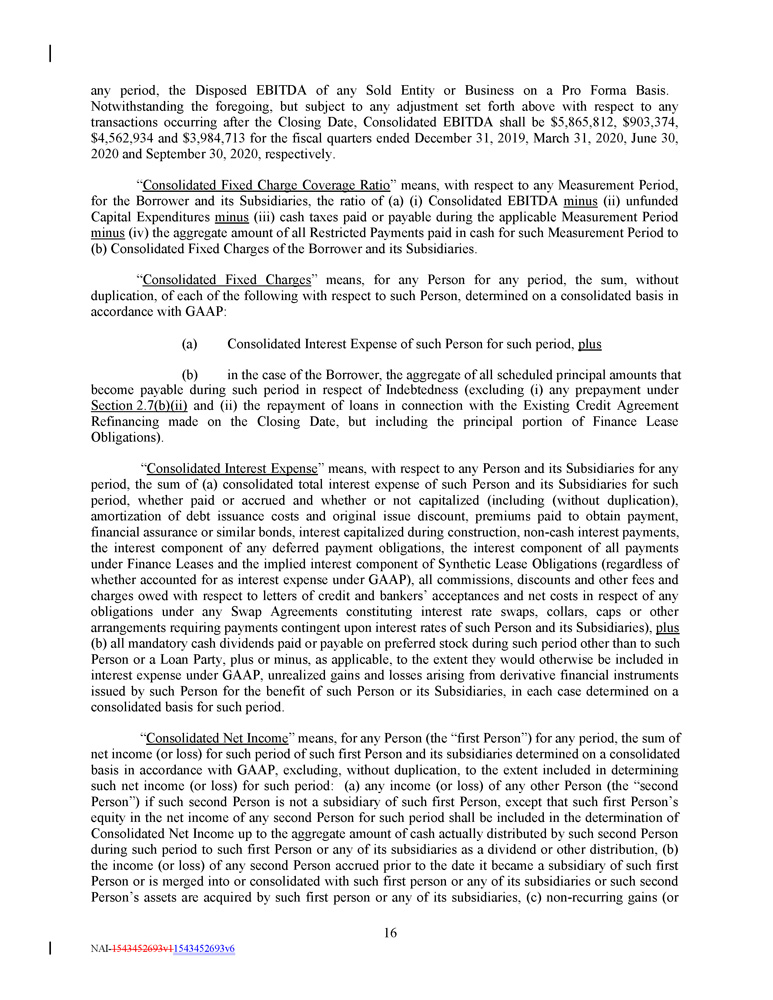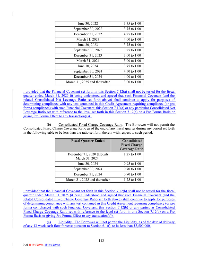 Consolidated Fixed Charge Coverage Ratio Fiscal Quarter Ended 1.25 to 1.00 December 31, 2020 through March 31, 2024 0.95 to 1.00 June 30, 2024 0.70 to 1.00 September 30, 2024 0.70 to 1.00 December 31, 2024 1.25 to 1.00 March 31, 2025 and thereafter 3.75 to 1.00 June 30, 2022 3.75 to 1.00 September 30, 2022 4.25 to 1.00 December 31, 2022 4.00 to 1.00 March 31, 2023 3.75 to 1.00 June 30, 2023 3.25 to 1.00 September 30, 2023 3.00 to 1.00 December 31, 2023 3.00 to 1.00 March 31, 2024 3.75 to 1.00 June 30, 2024 4.50 to 1.00 September 30, 2024 4.00 to 1.00 December 31, 2024 3.00 to 1.00 March 31, 2025 and thereafter ; provided that the Financial Covenant set forth in this Section 7 . 12 (a) shall not be tested for the fiscal quarter ended March 31 , 2025 (it being understood and agreed that such Financial Covenant (and the related Consolidated Net Leverage Ratio set forth above) shall continue to apply for purposes of determining compliance with any test contained in this Credit Agreement requiring compliance (or pro forma compliance) with such Financial Covenant, this Section 7 . 12 (a) or any particular Consolidated Net Leverage Ratio set with reference to the level set forth in this Section 7 . 12 (a) on a Pro Forma Basis or giving Pro Forma Effect to any transaction(s)) . (b) Consolidated Fixed Charge Coverage Ratio . The Borrower will not permit the Consolidated Fixed Charge Coverage Ratio as of the end of any fiscal quarter during any period set forth in the following table to be less than the ratio set forth therein with respect to such period : ; provided that the Financial Covenant set forth in this Section 7 . 12 (b) shall not be tested for the fiscal quarter ended March 31 , 2025 (it being understood and agreed that such Financial Covenant (and the related Consolidated Fixed Charge Coverage Ratio set forth above) shall continue to apply for purposes of determining compliance with any test contained in this Credit Agreement requiring compliance (or pro forma compliance) with such Financial Covenant, this Section 7 . 12 (b) or any particular Consolidated Fixed Charge Coverage Ratio set with reference to the level set forth in this Section 7 . 12 (b) on a Pro Forma Basis or giving Pro Forma Effect to any transaction(s)) . (c) Liquidity. The Borrower will not permit the Liquidity, as of the date of delivery of any 13 - week cash flow forecast pursuant to Section 6.1(f), to be less than $3,500,000. 113 NAI - 1543452693v1 1543452693v6