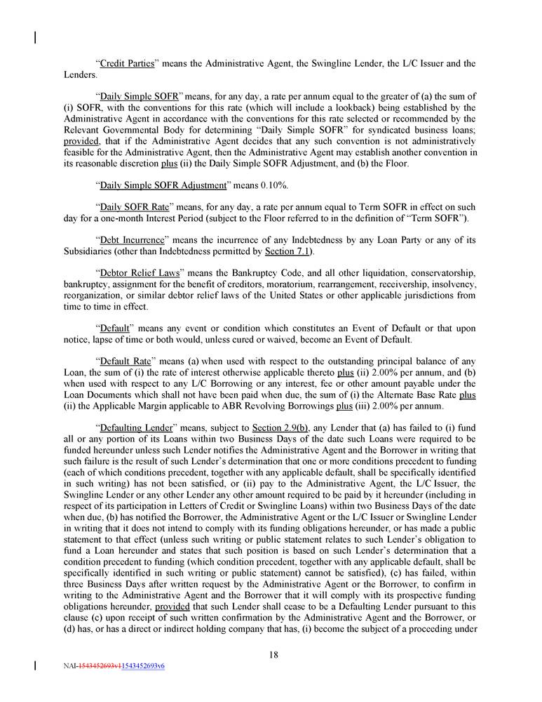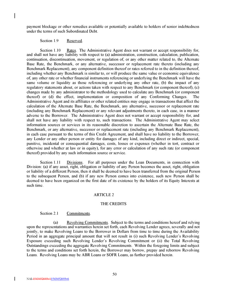 payment blockage or other remedies available or potentially available to holders of senior indebtedness under the terms of such Subordinated Debt. 50 NAI - 1543452693v1 1543452693v6 Section 1.9 Reserved . Section 1 . 10 Rates . The Administrative Agent does not warrant or accept responsibility for, and shall not have any liability with respect to (a) administration, construction, calculation, publication, continuation, discontinuation, movement, or regulation of, or any other matter related to, the Alternate Base Rate, the Benchmark, or any alternative, successor or replacement rate thereto (including any Benchmark Replacement), any component definition thereof or rates referred to in the definition thereof, including whether any Benchmark is similar to, or will produce the same value or economic equivalence of, any other rate or whether financial instruments referencing or underlying the Benchmark will have the same volume or liquidity as those referencing or underlying any other rate, (b) the impact of any regulatory statements about, or actions taken with respect to any Benchmark (or component thereof), (c) changes made by any administrator to the methodology used to calculate any Benchmark (or component thereof) or (d) the effect, implementation or composition of any Conforming Changes . The Administrative Agent and its affiliates or other related entities may engage in transactions that affect the calculation of the Alternate Base Rate, the Benchmark, any alternative, successor or replacement rate (including any Benchmark Replacement) or any relevant adjustments thereto, in each case, in a manner adverse to the Borrower . The Administrative Agent does not warrant or accept responsibility for, and shall not have any liability with respect to, such transactions . The Administrative Agent may select information sources or services in its reasonable discretion to ascertain the Alternate Base Rate, the Benchmark, or any alternative, successor or replacement rate (including any Benchmark Replacement), in each case pursuant to the terms of this Credit Agreement, and shall have no liability to the Borrower, any Lender or any other person or entity for damages of any kind, including direct or indirect, special, punitive, incidental or consequential damages, costs, losses or expenses (whether in tort, contract or otherwise and whether at law or in equity), for any error or calculation of any such rate (or component thereof) provided by any such information source or service . Section 1 . 11 Divisions . For all purposes under the Loan Documents, in connection with Division : (a) if any asset, right, obligation or liability of any Person becomes the asset, right, obligation or liability of a different Person, then it shall be deemed to have been transferred from the original Person to the subsequent Person, and (b) if any new Person comes into existence, such new Person shall be deemed to have been organized on the first date of its existence by the holders of its Equity Interests at such time . ARTICLE 2 THE CREDITS Section 2.1 Commitments . (a) Revolving Commitments . Subject to the terms and conditions hereof and relying upon the representations and warranties herein set forth, each Revolving Lender agrees, severally and not jointly, to make Revolving Loans to the Borrower in Dollars from time to time during the Availability Period in an aggregate principal amount that will not result in (i) such Revolving Lender’s Revolving Exposure exceeding such Revolving Lender’s Revolving Commitment or (ii) the Total Revolving Outstandings exceeding the aggregate Revolving Commitments . Within the foregoing limits and subject to the terms and conditions set forth herein, the Borrower may borrow, prepay and reborrow Revolving Loans . Revolving Loans may be ABR Loans or SOFR Loans, as further provided herein .