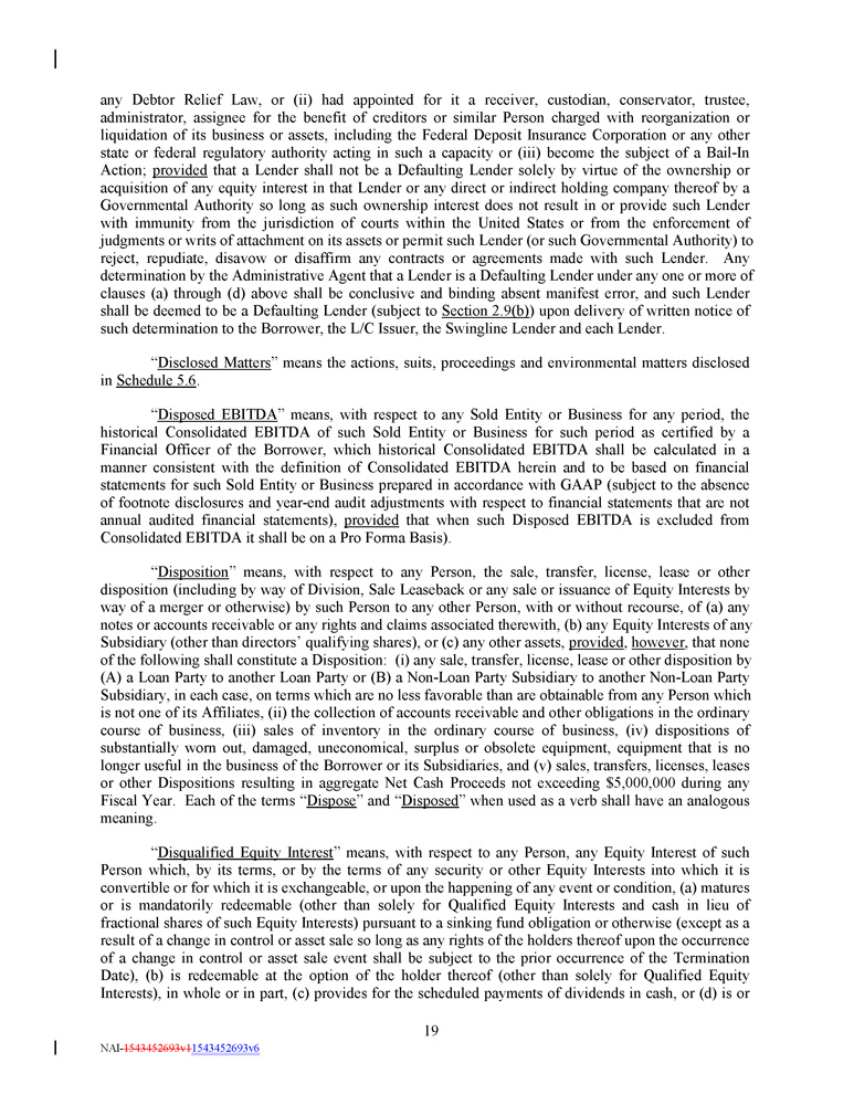 Schedule 2.1 Schedule 2.4 Schedule 4.1(f) - 4 - NAI - 1543452693v1 1543452693v6 Commitments Existing Letters of Credit Collateral Documents and Related Requirements Section 7.12 Section 7.13 Section 7.14 Section 7.15 Financial Covenants 106 Payments on Subordinated Debt 106 Government Regulation 107 Hazardous Materials 107 ARTICLE 8 EVENTS OF DEFAULT 107 Section 8.1 Section 8.2 Section 8.3 Events of Default 107 Remedies Upon Event of Default 109 Application of Funds 110 ARTICLE 9 THE ADMINISTRATIVE AGENT 111 Section 9.1 Section 9.2 Section 9.3 Section 9.4 Section 9.5 Section 9.6 Section 9.7 Section 9.8 Section 9.9 Section 9.10 Section 9.11 Section 9.12 Section 9.13 Appointment and Authority 111 Rights as a Lender 111 Exculpatory Provisions 112 Reliance by Administrative Agent 112 Delegation of Duties 113 Resignation of Administrative Agent 113 Non - Reliance on Administrative Agent and Other Lenders 114 No Other Duties, Etc 114 Administrative Agent May File Proofs of Claim 114 Collateral and Guarantee Matters 115 Compliance with Flood Insurance Laws 115 Cash Management Obligations and Swap Agreement Obligations 116 Erroneous Payments 116 ARTICLE 10 MISCELLANEOUS 119 Section 10.1 Section 10.2 Section 10.3 Section 10.4 Section 10.5 Section 10.6 Section 10.7 Section 10.8 Section 10.9 Section 10.10 Section 10.11 Section 10.12 Section 10.13 Section 10.14 Section 10.15 Section 10.16 Section 10.17 Section 10.18 Section 10.19 Notices 119 Waivers ; Amendments 120 Expenses ; Indemnity ; Damage Waiver 122 Successors and Assigns 124 Survival 127 Counterparts ; Integration ; Effectiveness ; Electronic Execution 128 Severability 128 Setoff 128 Governing Law ; Jurisdiction ; Consent to Service of Process 129 WAIVER OF JURY TRIAL 129 Payments Set Aside 130 Headings 130 Interest Rate Limitation 130 Confidentiality 130 USA PATRIOT Act 131 No Fiduciary Duty 132 Acknowledgement and Consent to Bail - In of Affected Financial Institutions132 Certain ERISA Matters 132 Acknowledgement Regarding Any Supported QFCs 133 SCHEDULES :