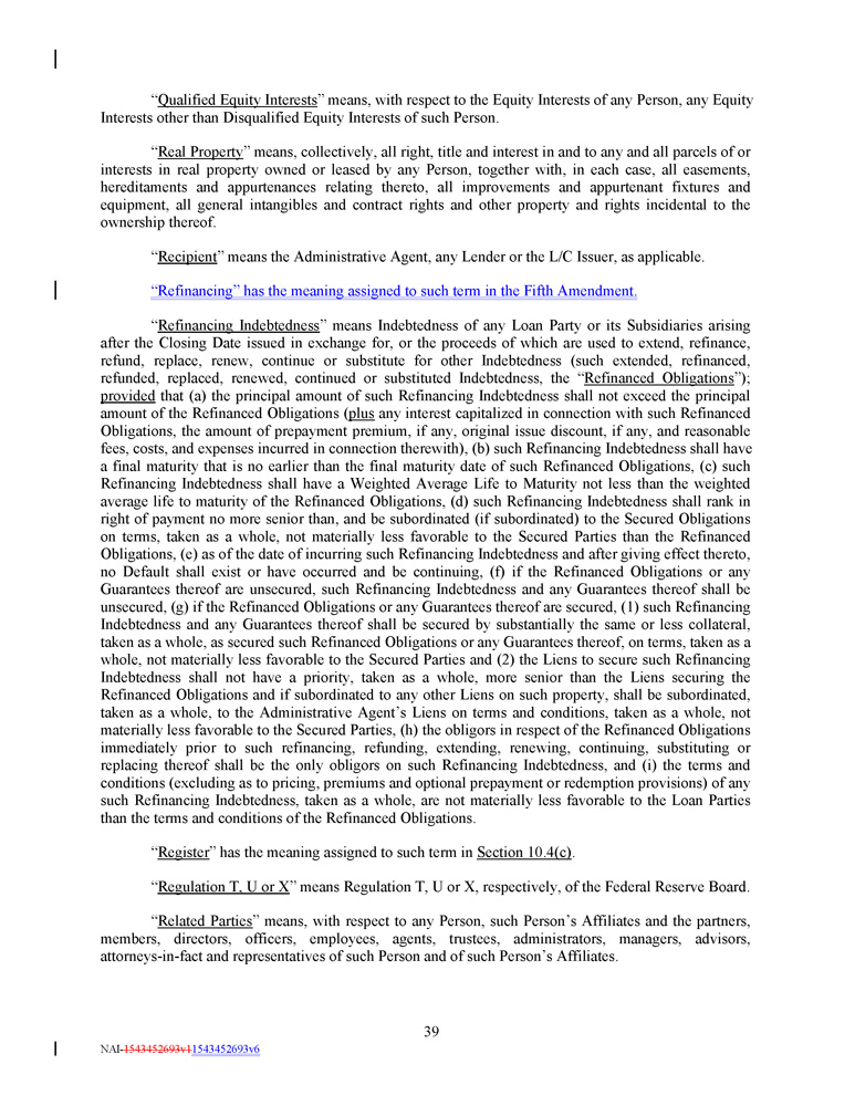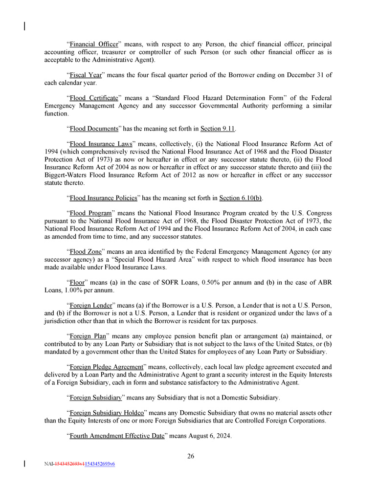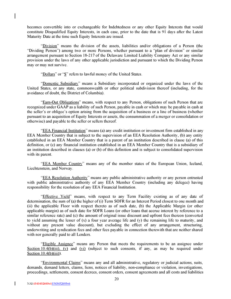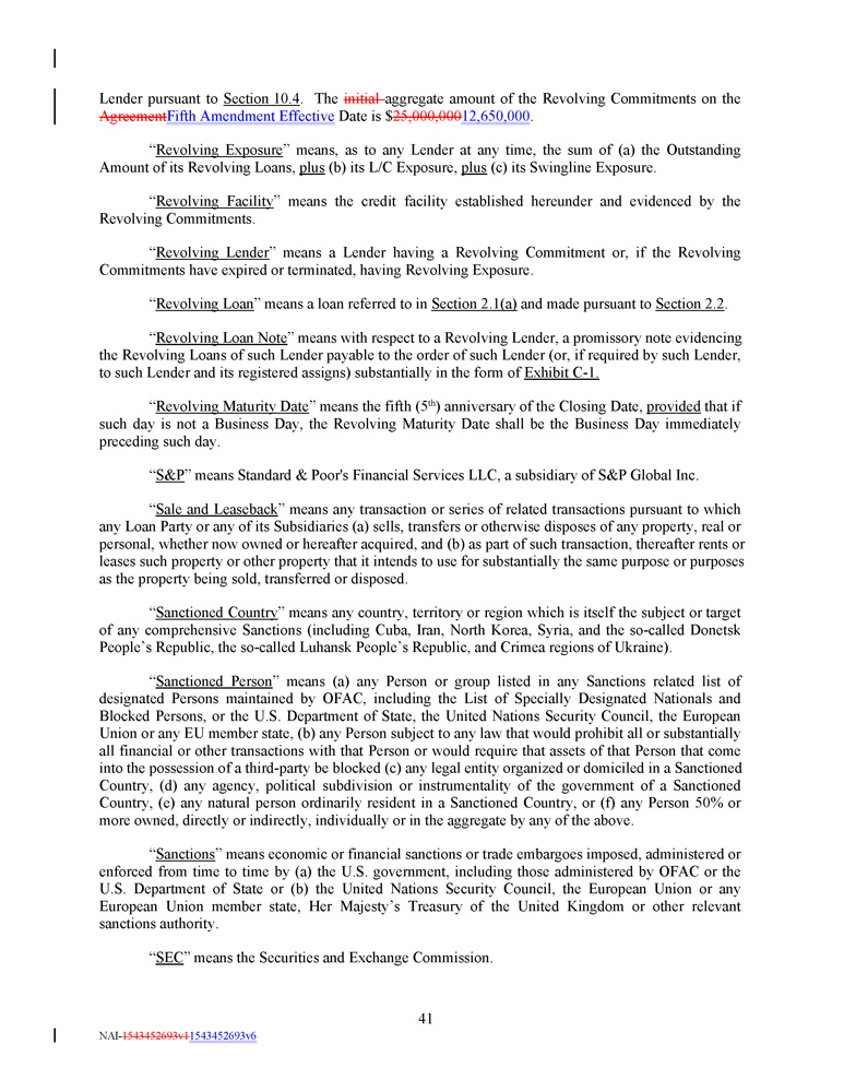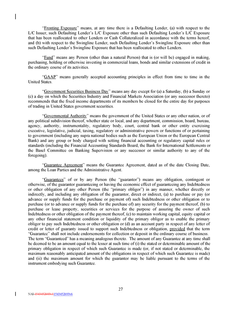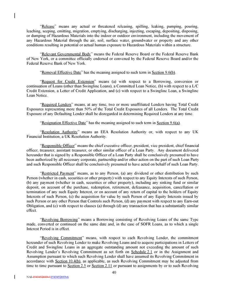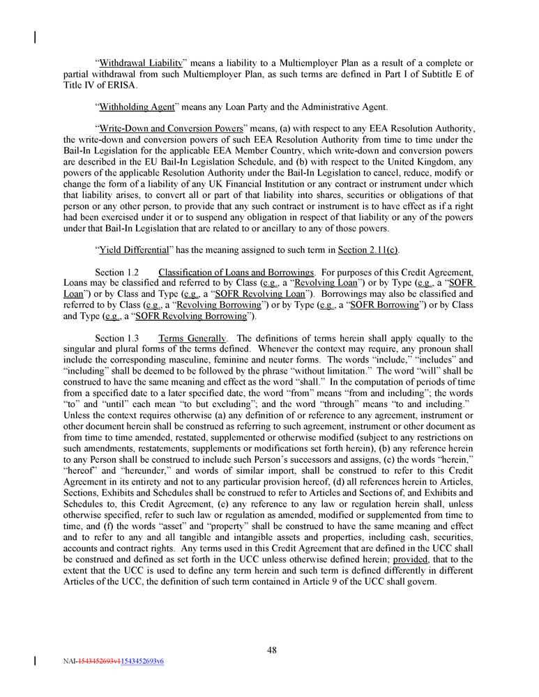 “ Withdrawal Liability ” means a liability to a Multiemployer Plan as a result of a complete or partial withdrawal from such Multiemployer Plan, as such terms are defined in Part I of Subtitle E of Title IV of ERISA . “ Withholding Agent ” means any Loan Party and the Administrative Agent. “ Write - Down and Conversion Powers ” means, (a) with respect to any EEA Resolution Authority, the write - down and conversion powers of such EEA Resolution Authority from time to time under the Bail - In Legislation for the applicable EEA Member Country, which write - down and conversion powers are described in the EU Bail - In Legislation Schedule, and (b) with respect to the United Kingdom, any powers of the applicable Resolution Authority under the Bail - In Legislation to cancel, reduce, modify or change the form of a liability of any UK Financial Institution or any contract or instrument under which that liability arises, to convert all or part of that liability into shares, securities or obligations of that person or any other person, to provide that any such contract or instrument is to have effect as if a right had been exercised under it or to suspend any obligation in respect of that liability or any of the powers under that Bail - In Legislation that are related to or ancillary to any of those powers . “ Yield Differential ” has the meaning assigned to such term in Section 2.11(c) . Section 1 . 2 Classification of Loans and Borrowings . For purposes of this Credit Agreement, Loans may be classified and referred to by Class ( e . g . , a “ Revolving Loan ”) or by Type ( e . g . , a “ SOFR Loan ”) or by Class and Type ( e . g . , a “ SOFR Revolving Loan ”) . Borrowings may also be classified and referred to by Class ( e . g . , a “ Revolving Borrowing ”) or by Type ( e . g . , a “ SOFR Borrowing ”) or by Class and Type ( e . g . , a “ SOFR Revolving Borrowing ”) . Section 1.3 Terms Generally . The definitions of terms herein shall apply equally to the singular and plural forms of the terms defined. Whenever the context may require, any pronoun shall include the corresponding masculine, feminine and neuter forms. The words “include,” “includes” and “including” shall be deemed to be followed by the phrase “without limitation.” The word “will” shall be construed to have the same meaning and effect as the word “shall.” In the computation of periods of time from a specified date to a later specified date, the word “from” means “from and including”; the words “to” and “until” each mean “to but excluding”; and the word “through” means “to and including.” Unless the context requires otherwise (a) any definition of or reference to any agreement, instrument or other document herein shall be construed as referring to such agreement, instrument or other document as from time to time amended, restated, supplemented or otherwise modified (subject to any restrictions on such amendments, restatements, supplements or modifications set forth herein), (b) any reference herein to any Person shall be construed to include such Person’s successors and assigns, (c) the words “herein,” “hereof” and “hereunder,” and words of similar import, shall be construed to refer to this Credit Agreement in its entirety and not to any particular provision hereof, (d) all references herein to Articles, Sections, Exhibits and Schedules shall be construed to refer to Articles and Sections of, and Exhibits and Schedules to, this Credit Agreement, (e) any reference to any law or regulation herein shall, unless otherwise specified, refer to such law or regulation as amended, modified or supplemented from time to time, and (f) the words “asset” and “property” shall be construed to have the same meaning and effect and to refer to any and all tangible and intangible assets and properties, including cash, securities, accounts and contract rights. Any terms used in this Credit Agreement that are defined in the UCC shall be construed and defined as set forth in the UCC unless otherwise defined herein; provided , that to the extent that the UCC is used to define any term herein and such term is defined differently in different Articles of the UCC, the definition of such term contained in Article 9 of the UCC shall govern. 48 NAI - 1543452693v1 1543452693v6