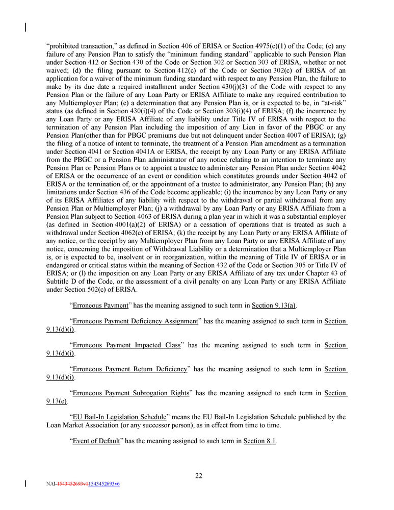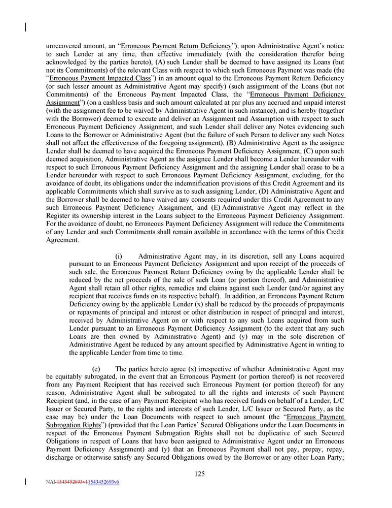 unrecovered amount, an “ Erroneous Payment Return Deficiency ”), upon Administrative Agent’s notice to such Lender at any time, then effective immediately (with the consideration therefor being acknowledged by the parties hereto), (A) such Lender shall be deemed to have assigned its Loans (but not its Commitments) of the relevant Class with respect to which such Erroneous Payment was made (the “ Erroneous Payment Impacted Class ”) in an amount equal to the Erroneous Payment Return Deficiency (or such lesser amount as Administrative Agent may specify) (such assignment of the Loans (but not Commitments) of the Erroneous Payment Impacted Class, the “ Erroneous Payment Deficiency Assignment ”) (on a cashless basis and such amount calculated at par plus any accrued and unpaid interest (with the assignment fee to be waived by Administrative Agent in such instance), and is hereby (together with the Borrower) deemed to execute and deliver an Assignment and Assumption with respect to such Erroneous Payment Deficiency Assignment, and such Lender shall deliver any Notes evidencing such Loans to the Borrower or Administrative Agent (but the failure of such Person to deliver any such Notes shall not affect the effectiveness of the foregoing assignment), (B) Administrative Agent as the assignee Lender shall be deemed to have acquired the Erroneous Payment Deficiency Assignment, (C) upon such deemed acquisition, Administrative Agent as the assignee Lender shall become a Lender hereunder with respect to such Erroneous Payment Deficiency Assignment and the assigning Lender shall cease to be a Lender hereunder with respect to such Erroneous Payment Deficiency Assignment, excluding, for the avoidance of doubt, its obligations under the indemnification provisions of this Credit Agreement and its applicable Commitments which shall survive as to such assigning Lender, (D) Administrative Agent and the Borrower shall be deemed to have waived any consents required under this Credit Agreement to any such Erroneous Payment Deficiency Assignment, and (E) Administrative Agent may reflect in the Register its ownership interest in the Loans subject to the Erroneous Payment Deficiency Assignment . For the avoidance of doubt, no Erroneous Payment Deficiency Assignment will reduce the Commitments of any Lender and such Commitments shall remain available in accordance with the terms of this Credit Agreement . (i) Administrative Agent may, in its discretion, sell any Loans acquired pursuant to an Erroneous Payment Deficiency Assignment and upon receipt of the proceeds of such sale, the Erroneous Payment Return Deficiency owing by the applicable Lender shall be reduced by the net proceeds of the sale of such Loan (or portion thereof), and Administrative Agent shall retain all other rights, remedies and claims against such Lender (and/or against any recipient that receives funds on its respective behalf) . In addition, an Erroneous Payment Return Deficiency owing by the applicable Lender (x) shall be reduced by the proceeds of prepayments or repayments of principal and interest or other distribution in respect of principal and interest, received by Administrative Agent on or with respect to any such Loans acquired from such Lender pursuant to an Erroneous Payment Deficiency Assignment (to the extent that any such Loans are then owned by Administrative Agent) and (y) may in the sole discretion of Administrative Agent be reduced by any amount specified by Administrative Agent in writing to the applicable Lender from time to time . (e) The parties hereto agree (x) irrespective of whether Administrative Agent may be equitably subrogated, in the event that an Erroneous Payment (or portion thereof) is not recovered from any Payment Recipient that has received such Erroneous Payment (or portion thereof) for any reason, Administrative Agent shall be subrogated to all the rights and interests of such Payment Recipient (and, in the case of any Payment Recipient who has received funds on behalf of a Lender, L/C Issuer or Secured Party, to the rights and interests of such Lender, L/C Issuer or Secured Party, as the case may be) under the Loan Documents with respect to such amount (the “ Erroneous Payment Subrogation Rights ”) (provided that the Loan Parties’ Secured Obligations under the Loan Documents in respect of the Erroneous Payment Subrogation Rights shall not be duplicative of such Secured Obligations in respect of Loans that have been assigned to Administrative Agent under an Erroneous Payment Deficiency Assignment) and (y) that an Erroneous Payment shall not pay, prepay, repay, discharge or otherwise satisfy any Secured Obligations owed by the Borrower or any other Loan Party ; 125 NAI - 1543452693v1 1543452693v6