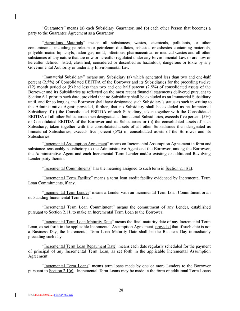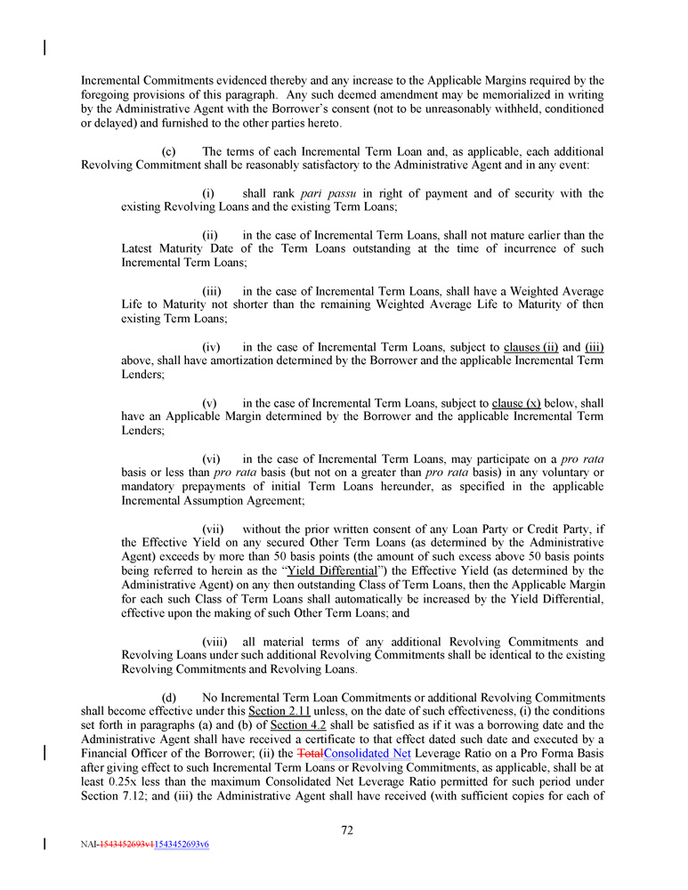 Incremental Commitments evidenced thereby and any increase to the Applicable Margins required by the foregoing provisions of this paragraph . Any such deemed amendment may be memorialized in writing by the Administrative Agent with the Borrower’s consent (not to be unreasonably withheld, conditioned or delayed) and furnished to the other parties hereto . (c) The terms of each Incremental Term Loan and, as applicable, each additional Revolving Commitment shall be reasonably satisfactory to the Administrative Agent and in any event : (i) shall rank pari passu in right of payment and of security with the existing Revolving Loans and the existing Term Loans ; (ii) in the case of Incremental Term Loans, shall not mature earlier than the Latest Maturity Date of the Term Loans outstanding at the time of incurrence of such Incremental Term Loans ; (iii) in the case of Incremental Term Loans, shall have a Weighted Average Life to Maturity not shorter than the remaining Weighted Average Life to Maturity of then existing Term Loans ; (iv) in the case of Incremental Term Loans, subject to clauses (ii) and (iii) above, shall have amortization determined by the Borrower and the applicable Incremental Term Lenders ; (v) in the case of Incremental Term Loans, subject to clause (x) below, shall have an Applicable Margin determined by the Borrower and the applicable Incremental Term Lenders ; (vi) in the case of Incremental Term Loans, may participate on a pro rata basis or less than pro rata basis (but not on a greater than pro rata basis) in any voluntary or mandatory prepayments of initial Term Loans hereunder, as specified in the applicable Incremental Assumption Agreement ; (vii) without the prior written consent of any Loan Party or Credit Party, if the Effective Yield on any secured Other Term Loans (as determined by the Administrative Agent) exceeds by more than 50 basis points (the amount of such excess above 50 basis points being referred to herein as the “ Yield Differential ”) the Effective Yield (as determined by the Administrative Agent) on any then outstanding Class of Term Loans, then the Applicable Margin for each such Class of Term Loans shall automatically be increased by the Yield Differential, effective upon the making of such Other Term Loans ; and (viii) all material terms of any additional Revolving Commitments and Revolving Loans under such additional Revolving Commitments shall be identical to the existing Revolving Commitments and Revolving Loans . (d) No Incremental Term Loan Commitments or additional Revolving Commitments shall become effective under this Section 2 . 11 unless, on the date of such effectiveness, (i) the conditions set forth in paragraphs (a) and (b) of Section 4 . 2 shall be satisfied as if it was a borrowing date and the Administrative Agent shall have received a certificate to that effect dated such date and executed by a Financial Officer of the Borrower ; (ii) the Total Consolidated Net Leverage Ratio on a Pro Forma Basis after giving effect to such Incremental Term Loans or Revolving Commitments, as applicable, shall be at least 0 . 25 x less than the maximum Consolidated Net Leverage Ratio permitted for such period under Section 7.12; and (iii) the Administrative Agent shall have received (with sufficient copies for each of 72 NAI - 1543452693v1 1543452693v6