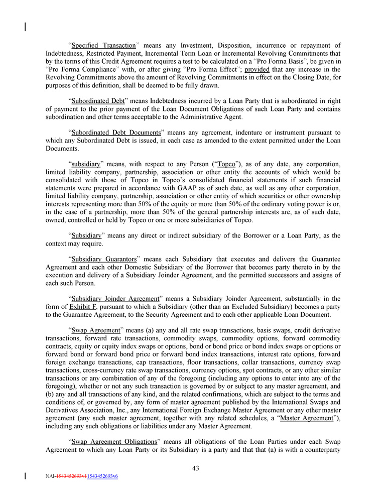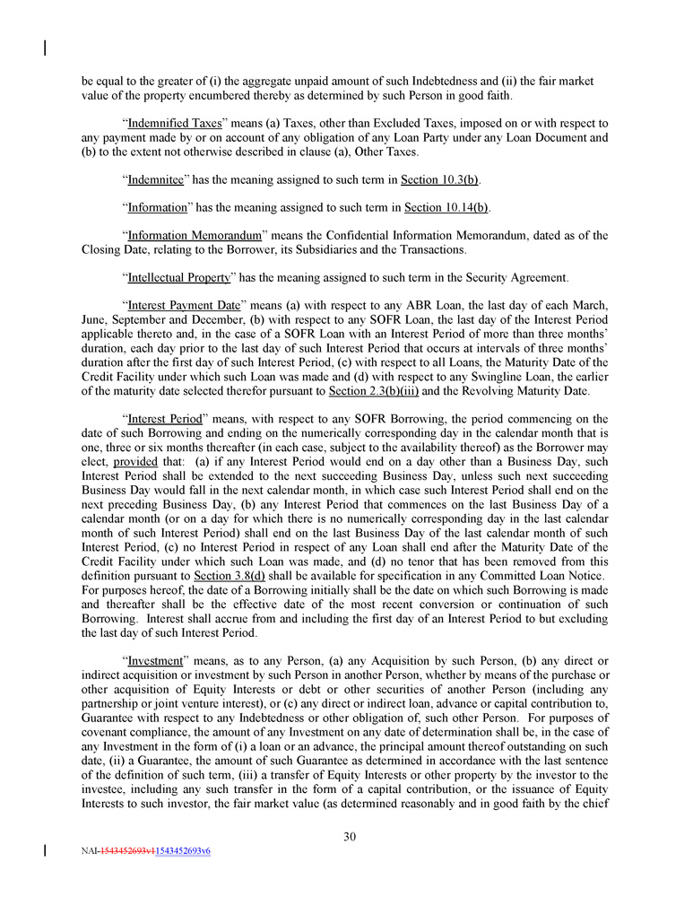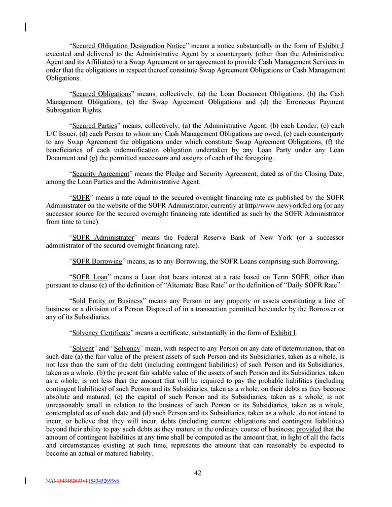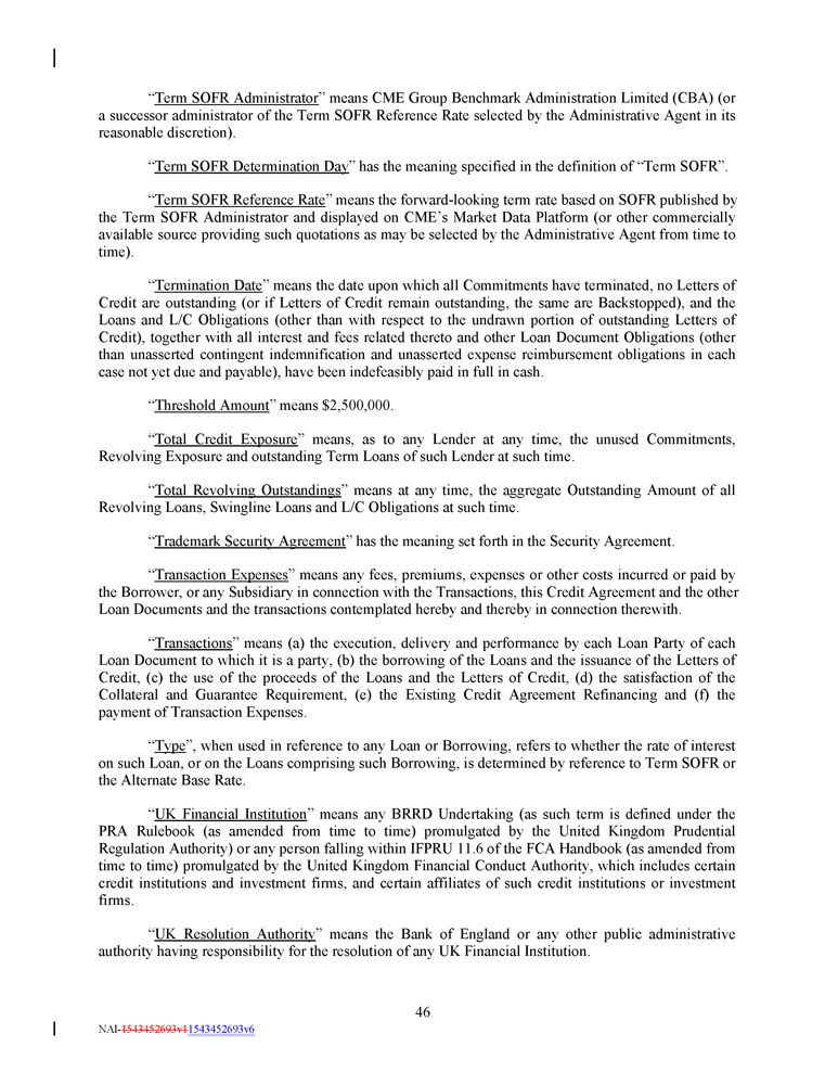 “ Term SOFR Administrator ” means CME Group Benchmark Administration Limited (CBA) (or a successor administrator of the Term SOFR Reference Rate selected by the Administrative Agent in its reasonable discretion) . “ Term SOFR Determination Day ” has the meaning specified in the definition of “Term SOFR” . “ Term SOFR Reference Rate ” means the forward - looking term rate based on SOFR published by the Term SOFR Administrator and displayed on CME’s Market Data Platform (or other commercially available source providing such quotations as may be selected by the Administrative Agent from time to time). “ Termination Date ” means the date upon which all Commitments have terminated, no Letters of Credit are outstanding (or if Letters of Credit remain outstanding, the same are Backstopped), and the Loans and L/C Obligations (other than with respect to the undrawn portion of outstanding Letters of Credit), together with all interest and fees related thereto and other Loan Document Obligations (other than unasserted contingent indemnification and unasserted expense reimbursement obligations in each case not yet due and payable), have been indefeasibly paid in full in cash . “ Threshold Amount ” means $ 2 , 500 , 000 . “ Total Credit Exposure ” means, as to any Lender at any time, the unused Commitments, Revolving Exposure and outstanding Term Loans of such Lender at such time . “ Total Revolving Outstandings ” means at any time, the aggregate Outstanding Amount of all Revolving Loans, Swingline Loans and L/C Obligations at such time . “ Trademark Security Agreement ” has the meaning set forth in the Security Agreement . “ Transaction Expenses ” means any fees, premiums, expenses or other costs incurred or paid by the Borrower, or any Subsidiary in connection with the Transactions, this Credit Agreement and the other Loan Documents and the transactions contemplated hereby and thereby in connection therewith. “ Transactions ” means (a) the execution, delivery and performance by each Loan Party of each Loan Document to which it is a party, (b) the borrowing of the Loans and the issuance of the Letters of Credit, (c) the use of the proceeds of the Loans and the Letters of Credit, (d) the satisfaction of the Collateral and Guarantee Requirement, (e) the Existing Credit Agreement Refinancing and (f) the payment of Transaction Expenses . “ Type ”, when used in reference to any Loan or Borrowing, refers to whether the rate of interest on such Loan, or on the Loans comprising such Borrowing, is determined by reference to Term SOFR or the Alternate Base Rate . “ UK Financial Institution ” means any BRRD Undertaking (as such term is defined under the PRA Rulebook (as amended from time to time) promulgated by the United Kingdom Prudential Regulation Authority) or any person falling within IFPRU 11 . 6 of the FCA Handbook (as amended from time to time) promulgated by the United Kingdom Financial Conduct Authority, which includes certain credit institutions and investment firms, and certain affiliates of such credit institutions or investment firms . “ UK Resolution Authority ” means the Bank of England or any other public administrative authority having responsibility for the resolution of any UK Financial Institution . 46 NAI - 1543452693v1 1543452693v6