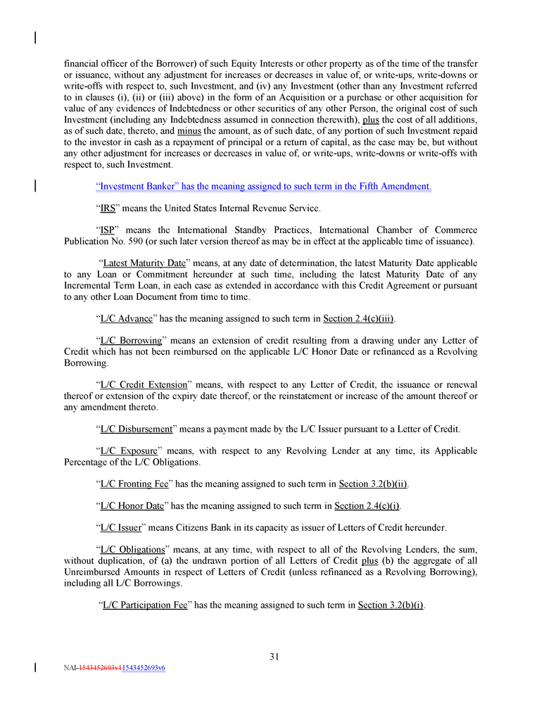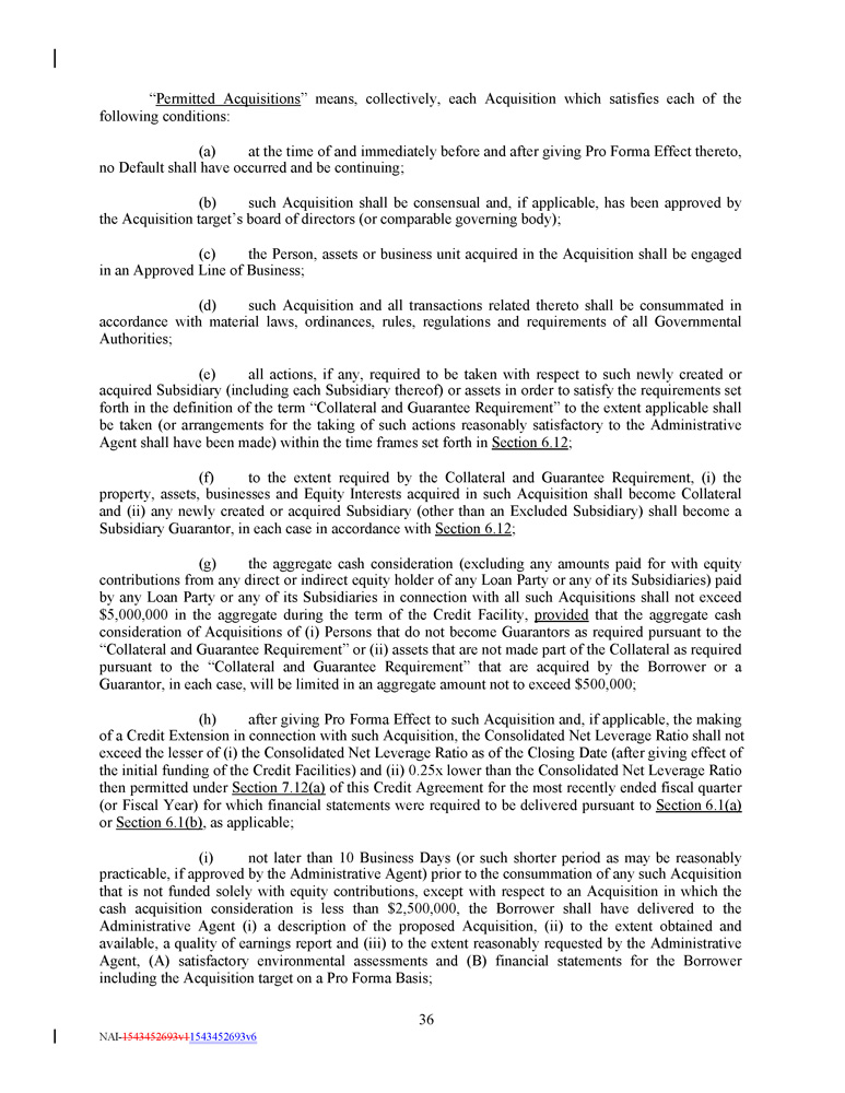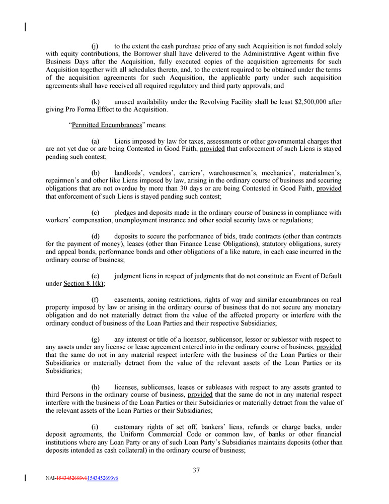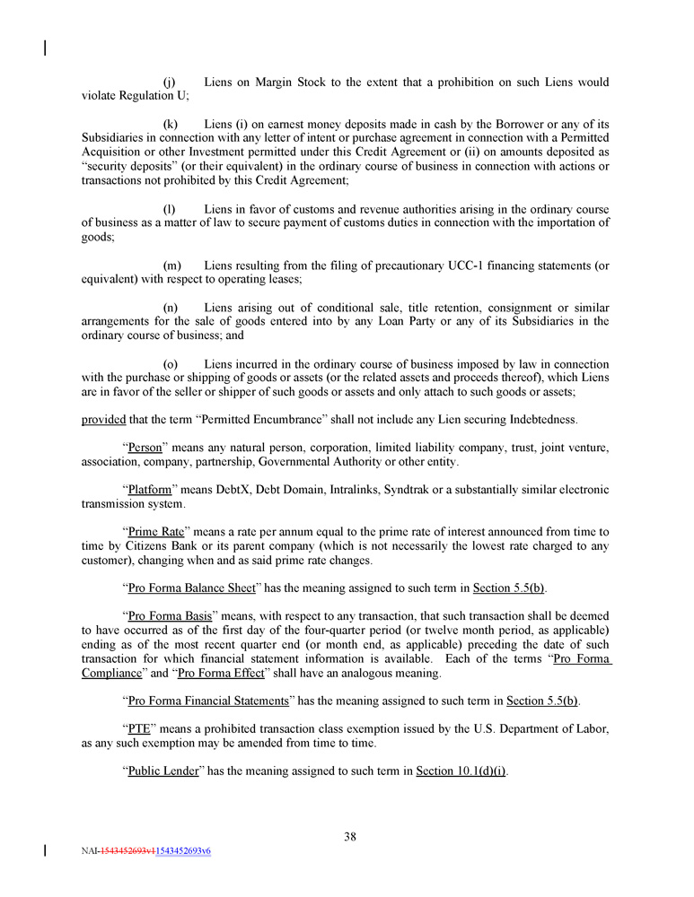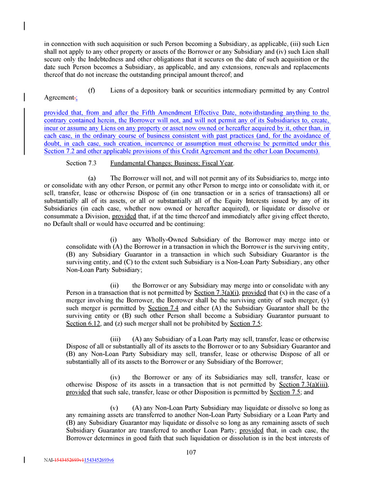 in connection with such acquisition or such Person becoming a Subsidiary, as applicable, (iii) such Lien shall not apply to any other property or assets of the Borrower or any Subsidiary and (iv) such Lien shall secure only the Indebtedness and other obligations that it secures on the date of such acquisition or the date such Person becomes a Subsidiary, as applicable, and any extensions, renewals and replacements thereof that do not increase the outstanding principal amount thereof ; and (f) Liens of a depository bank or securities intermediary permitted by any Control Agreement . ; provided that, from and after the Fifth Amendment Effective Date, notwithstanding anything to the contrary contained herein, the Borrower will not, and will not permit any of its Subsidiaries to, create, incur or assume any Liens on any property or asset now owned or hereafter acquired by it, other than, in each case, in the ordinary course of business consistent with past practices (and, for the avoidance of doubt, in each case, such creation, incurrence or assumption must otherwise be permitted under this Section 7 . 2 and other applicable provisions of this Credit Agreement and the other Loan Documents) . Section 7 . 3 Fundamental Changes ; Business ; Fiscal Year . (a) The Borrower will not, and will not permit any of its Subsidiaries to, merge into or consolidate with any other Person, or permit any other Person to merge into or consolidate with it, or sell, transfer, lease or otherwise Dispose of (in one transaction or in a series of transactions) all or substantially all of its assets, or all or substantially all of the Equity Interests issued by any of its Subsidiaries (in each case, whether now owned or hereafter acquired), or liquidate or dissolve or consummate a Division, provided that, if at the time thereof and immediately after giving effect thereto, no Default shall or would have occurred and be continuing : (i) any Wholly - Owned Subsidiary of the Borrower may merge into or consolidate with (A) the Borrower in a transaction in which the Borrower is the surviving entity, (B) any Subsidiary Guarantor in a transaction in which such Subsidiary Guarantor is the surviving entity, and (C) to the extent such Subsidiary is a Non - Loan Party Subsidiary, any other Non - Loan Party Subsidiary ; (ii) the Borrower or any Subsidiary may merge into or consolidate with any Person in a transaction that is not permitted by Section 7 . 3 (a)(i) , provided that (x) in the case of a merger involving the Borrower, the Borrower shall be the surviving entity of such merger, (y) such merger is permitted by Section 7 . 4 and either (A) the Subsidiary Guarantor shall be the surviving entity or (B) such other Person shall become a Subsidiary Guarantor pursuant to Section 6 . 12 , and (z) such merger shall not be prohibited by Section 7 . 5 ; (iii) (A) any Subsidiary of a Loan Party may sell, transfer, lease or otherwise Dispose of all or substantially all of its assets to the Borrower or to any Subsidiary Guarantor and (C) any Non - Loan Party Subsidiary may sell, transfer, lease or otherwise Dispose of all or substantially all of its assets to the Borrower or any Subsidiary of the Borrower ; (iv) the Borrower or any of its Subsidiaries may sell, transfer, lease or otherwise Dispose of its assets in a transaction that is not permitted by Section 7 . 3 (a)(iii) , provided that such sale, transfer, lease or other Disposition is permitted by Section 7 . 5 ; and (v) (A) any Non - Loan Party Subsidiary may liquidate or dissolve so long as any remaining assets are transferred to another Non - Loan Party Subsidiary or a Loan Party and (B) any Subsidiary Guarantor may liquidate or dissolve so long as any remaining assets of such Subsidiary Guarantor are transferred to another Loan Party ; provided that, in each case, the Borrower determines in good faith that such liquidation or dissolution is in the best interests of 107 NAI - 1543452693v1 1543452693v6