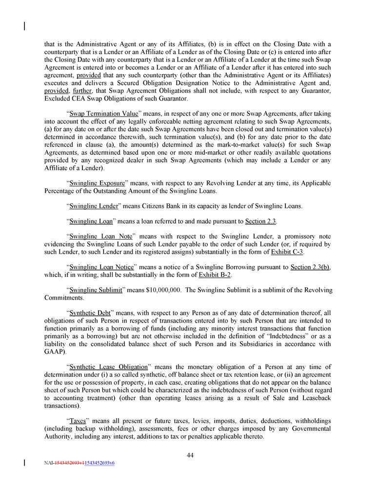 that is the Administrative Agent or any of its Affiliates, (b) is in effect on the Closing Date with a counterparty that is a Lender or an Affiliate of a Lender as of the Closing Date or (c) is entered into after the Closing Date with any counterparty that is a Lender or an Affiliate of a Lender at the time such Swap Agreement is entered into or becomes a Lender or an Affiliate of a Lender after it has entered into such agreement, provided that any such counterparty (other than the Administrative Agent or its Affiliates) executes and delivers a Secured Obligation Designation Notice to the Administrative Agent and, provided , further , that Swap Agreement Obligations shall not include, with respect to any Guarantor, Excluded CEA Swap Obligations of such Guarantor . “ Swap Termination Value ” means, in respect of any one or more Swap Agreements, after taking into account the effect of any legally enforceable netting agreement relating to such Swap Agreements, (a) for any date on or after the date such Swap Agreements have been closed out and termination value(s) determined in accordance therewith, such termination value(s), and (b) for any date prior to the date referenced in clause (a), the amount(s) determined as the mark - to - market value(s) for such Swap Agreements, as determined based upon one or more mid - market or other readily available quotations provided by any recognized dealer in such Swap Agreements (which may include a Lender or any Affiliate of a Lender) . “ Swingline Exposure ” means, with respect to any Revolving Lender at any time, its Applicable Percentage of the Outstanding Amount of the Swingline Loans . “ Swingline Lender ” means Citizens Bank in its capacity as lender of Swingline Loans . “ Swingline Loan ” means a loan referred to and made pursuant to Section 2 . 3 . “ Swingline Loan Note ” means with respect to the Swingline Lender, a promissory note evidencing the Swingline Loans of such Lender payable to the order of such Lender (or, if required by such Lender, to such Lender and its registered assigns) substantially in the form of Exhibit C - 3 . “ Swingline Loan Notice ” means a notice of a Swingline Borrowing pursuant to Section 2 . 3 (b) , which, if in writing, shall be substantially in the form of Exhibit B - 2 . “ Swingline Sublimit ” means $ 10 , 000 , 000 . The Swingline Sublimit is a sublimit of the Revolving Commitments . “ Synthetic Debt ” means, with respect to any Person as of any date of determination thereof, all obligations of such Person in respect of transactions entered into by such Person that are intended to function primarily as a borrowing of funds (including any minority interest transactions that function primarily as a borrowing) but are not otherwise included in the definition of “Indebtedness” or as a liability on the consolidated balance sheet of such Person and its Subsidiaries in accordance with GAAP) . “ Synthetic Lease Obligation ” means the monetary obligation of a Person at any time of determination under (i) a so called synthetic, off balance sheet or tax retention lease, or (ii) an agreement for the use or possession of property, in each case, creating obligations that do not appear on the balance sheet of such Person but which could be characterized as the indebtedness of such Person (without regard to accounting treatment) (other than operating leases arising as a result of Sale and Leaseback transactions) . “ Taxes ” means all present or future taxes, levies, imposts, duties, deductions, withholdings (including backup withholding), assessments, fees or other charges imposed by any Governmental Authority, including any interest, additions to tax or penalties applicable thereto . 44 NAI - 1543452693v1 1543452693v6