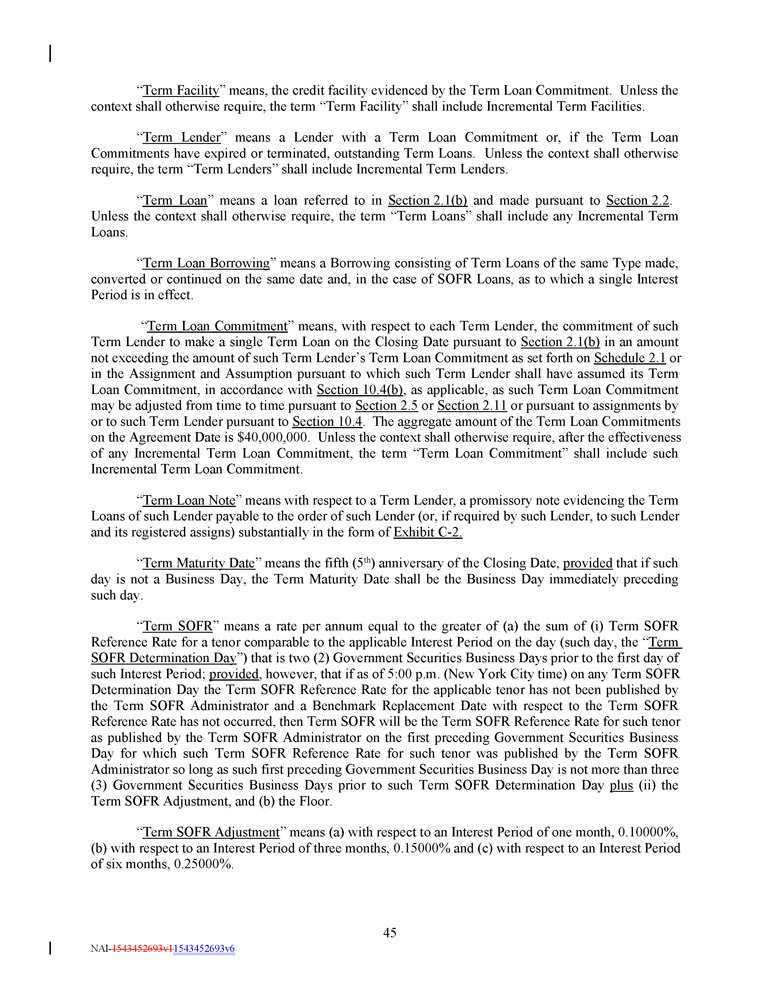 “ Term Facility ” means, the credit facility evidenced by the Term Loan Commitment . Unless the context shall otherwise require, the term “Term Facility” shall include Incremental Term Facilities . “ Term Lender ” means a Lender with a Term Loan Commitment or, if the Term Loan Commitments have expired or terminated, outstanding Term Loans . Unless the context shall otherwise require, the term “Term Lenders” shall include Incremental Term Lenders . “ Term Loan ” means a loan referred to in Section 2.1(b) and made pursuant to Section 2.2 . Unless the context shall otherwise require, the term “Term Loans” shall include any Incremental Term Loans. “ Term Loan Borrowing ” means a Borrowing consisting of Term Loans of the same Type made, converted or continued on the same date and, in the case of SOFR Loans, as to which a single Interest Period is in effect . “ Term Loan Commitment ” means, with respect to each Term Lender, the commitment of such Term Lender to make a single Term Loan on the Closing Date pursuant to Section 2 . 1 (b) in an amount not exceeding the amount of such Term Lender’s Term Loan Commitment as set forth on Schedule 2 . 1 or in the Assignment and Assumption pursuant to which such Term Lender shall have assumed its Term Loan Commitment, in accordance with Section 10 . 4 (b) , as applicable, as such Term Loan Commitment may be adjusted from time to time pursuant to Section 2 . 5 or Section 2 . 11 or pursuant to assignments by or to such Term Lender pursuant to Section 10 . 4 . The aggregate amount of the Term Loan Commitments on the Agreement Date is $ 40 , 000 , 000 . Unless the context shall otherwise require, after the effectiveness of any Incremental Term Loan Commitment, the term “Term Loan Commitment” shall include such Incremental Term Loan Commitment . “ Term Loan Note ” means with respect to a Term Lender, a promissory note evidencing the Term Loans of such Lender payable to the order of such Lender (or, if required by such Lender, to such Lender and its registered assigns) substantially in the form of Exhibit C - 2 . “ Term Maturity Date ” means the fifth ( 5 th ) anniversary of the Closing Date, provided that if such day is not a Business Day, the Term Maturity Date shall be the Business Day immediately preceding such day . “ Term SOFR ” means a rate per annum equal to the greater of (a) the sum of (i) Term SOFR Reference Rate for a tenor comparable to the applicable Interest Period on the day (such day, the “ Term SOFR Determination Day ”) that is two ( 2 ) Government Securities Business Days prior to the first day of such Interest Period ; provided , however, that if as of 5 : 00 p . m . (New York City time) on any Term SOFR Determination Day the Term SOFR Reference Rate for the applicable tenor has not been published by the Term SOFR Administrator and a Benchmark Replacement Date with respect to the Term SOFR Reference Rate has not occurred, then Term SOFR will be the Term SOFR Reference Rate for such tenor as published by the Term SOFR Administrator on the first preceding Government Securities Business Day for which such Term SOFR Reference Rate for such tenor was published by the Term SOFR Administrator so long as such first preceding Government Securities Business Day is not more than three ( 3 ) Government Securities Business Days prior to such Term SOFR Determination Day plus (ii) the Term SOFR Adjustment, and (b) the Floor . “ Term SOFR Adjustment ” means (a) with respect to an Interest Period of one month, 0.10000%, (b) with respect to an Interest Period of three months, 0 . 15000 % and (c) with respect to an Interest Period of six months, 0 . 25000 % . 45 NAI - 1543452693v1 1543452693v6