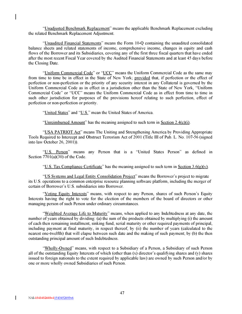 “ Unadjusted Benchmark Replacement ” means the applicable Benchmark Replacement excluding the related Benchmark Replacement Adjustment . “ Unaudited Financial Statements ” means the Form 10 - Q containing the unaudited consolidated balance sheets and related statements of income, comprehensive income, changes in equity and cash flows of the Borrower and its Subsidiaries, covering any of the first three fiscal quarters that have ended after the most recent Fiscal Year covered by the Audited Financial Statements and at least 45 days before the Closing Date . “ Uniform Commercial Code ” or “ UCC ” means the Uniform Commercial Code as the same may from time to time be in effect in the State of New York ; provided that, if perfection or the effect of perfection or non - perfection or the priority of any security interest in any Collateral is governed by the Uniform Commercial Code as in effect in a jurisdiction other than the State of New York, “Uniform Commercial Code” or “UCC” means the Uniform Commercial Code as in effect from time to time in such other jurisdiction for purposes of the provisions hereof relating to such perfection, effect of perfection or non - perfection or priority . “ United States ” and “ U.S. ” mean the United States of America. “ Unreimbursed Amount ” has the meaning assigned to such term in Section 2.4(c)(i) . “ USA PATRIOT Act ” means The Uniting and Strengthening America by Providing Appropriate Tools Required to Intercept and Obstruct Terrorism Act of 2001 (Title III of Pub . L . No . 107 - 56 (signed into law October 26 , 2001 )) . “ U . S . Person ” means any Person that is a “United States Person” as defined in Section 7701 (a)( 30 ) of the Code . “ U.S. Tax Compliance Certificate ” has the meaning assigned to such term in Section 3.6(g)(v) . “ US Systems and Legal Entity Consolidation Project ” means the Borrower’s project to migrate its U . S . operations to a common enterprise resource planning software platform, including the merger of certain of Borrower’s U . S . subsidiaries into Borrower . “ Voting Equity Interests ” means, with respect to any Person, shares of such Person’s Equity Interests having the right to vote for the election of the members of the board of directors or other managing person of such Person under ordinary circumstances . “ Weighted Average Life to Maturity ” means, when applied to any Indebtedness at any date, the number of years obtained by dividing : (a) the sum of the products obtained by multiplying (i) the amount of each then remaining installment, sinking fund, serial maturity or other required payments of principal, including payment at final maturity, in respect thereof, by (ii) the number of years (calculated to the nearest one - twelfth) that will elapse between such date and the making of such payment ; by (b) the then outstanding principal amount of such Indebtedness . “ Wholly - Owned ” means, with respect to a Subsidiary of a Person, a Subsidiary of such Person all of the outstanding Equity Interests of which (other than (x) director’s qualifying shares and (y) shares issued to foreign nationals to the extent required by applicable law) are owned by such Person and/or by one or more wholly owned Subsidiaries of such Person . 47 NAI - 1543452693v1 1543452693v6