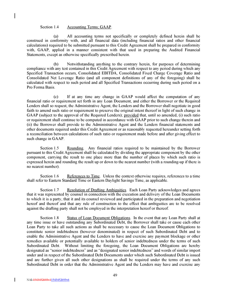 Section 1.4 49 NAI - 1543452693v1 1543452693v6 Accounting Terms; GAAP . (a) All accounting terms not specifically or completely defined herein shall be construed in conformity with, and all financial data (including financial ratios and other financial calculations) required to be submitted pursuant to this Credit Agreement shall be prepared in conformity with, GAAP, applied in a manner consistent with that used in preparing the Audited Financial Statements, except as otherwise specifically prescribed herein . (b) Notwithstanding anything to the contrary herein, for purposes of determining compliance with any test contained in this Credit Agreement with respect to any period during which any Specified Transaction occurs, Consolidated EBITDA, Consolidated Fixed Charge Coverage Ratio and Consolidated Net Leverage Ratio (and all component definitions of any of the foregoing) shall be calculated with respect to such period and all Specified Transactions occurring during such period on a Pro Forma Basis . (c) If at any time any change in GAAP would affect the computation of any financial ratio or requirement set forth in any Loan Document, and either the Borrower or the Required Lenders shall so request, the Administrative Agent, the Lenders and the Borrower shall negotiate in good faith to amend such ratio or requirement to preserve the original intent thereof in light of such change in GAAP (subject to the approval of the Required Lenders) ; provided that, until so amended, (i) such ratio or requirement shall continue to be computed in accordance with GAAP prior to such change therein and (ii) the Borrower shall provide to the Administrative Agent and the Lenders financial statements and other documents required under this Credit Agreement or as reasonably requested hereunder setting forth a reconciliation between calculations of such ratio or requirement made before and after giving effect to such change in GAAP . Section 1 . 5 Rounding . Any financial ratios required to be maintained by the Borrower pursuant to this Credit Agreement shall be calculated by dividing the appropriate component by the other component, carrying the result to one place more than the number of places by which such ratio is expressed herein and rounding the result up or down to the nearest number (with a rounding - up if there is no nearest number) . Section 1 . 6 References to Time . Unless the context otherwise requires, references to a time shall refer to Eastern Standard Time or Eastern Daylight Savings Time, as applicable . Section 1 . 7 Resolution of Drafting Ambiguities . Each Loan Party acknowledges and agrees that it was represented by counsel in connection with the execution and delivery of the Loan Documents to which it is a party, that it and its counsel reviewed and participated in the preparation and negotiation hereof and thereof and that any rule of construction to the effect that ambiguities are to be resolved against the drafting party shall not be employed in the interpretation hereof or thereof . Section 1 . 8 Status of Loan Document Obligations . In the event that any Loan Party shall at any time issue or have outstanding any Subordinated Debt, the Borrower shall take or cause each other Loan Party to take all such actions as shall be necessary to cause the Loan Document Obligations to constitute senior indebtedness (however denominated) in respect of such Subordinated Debt and to enable the Administrative Agent and the Lenders to have and exercise any payment blockage or other remedies available or potentially available to holders of senior indebtedness under the terms of such Subordinated Debt . Without limiting the foregoing, the Loan Document Obligations are hereby designated as “senior indebtedness” and as “designated senior indebtedness” and words of similar import under and in respect of the Subordinated Debt Documents under which such Subordinated Debt is issued and are further given all such other designations as shall be required under the terms of any such Subordinated Debt in order that the Administrative Agent and the Lenders may have and exercise any