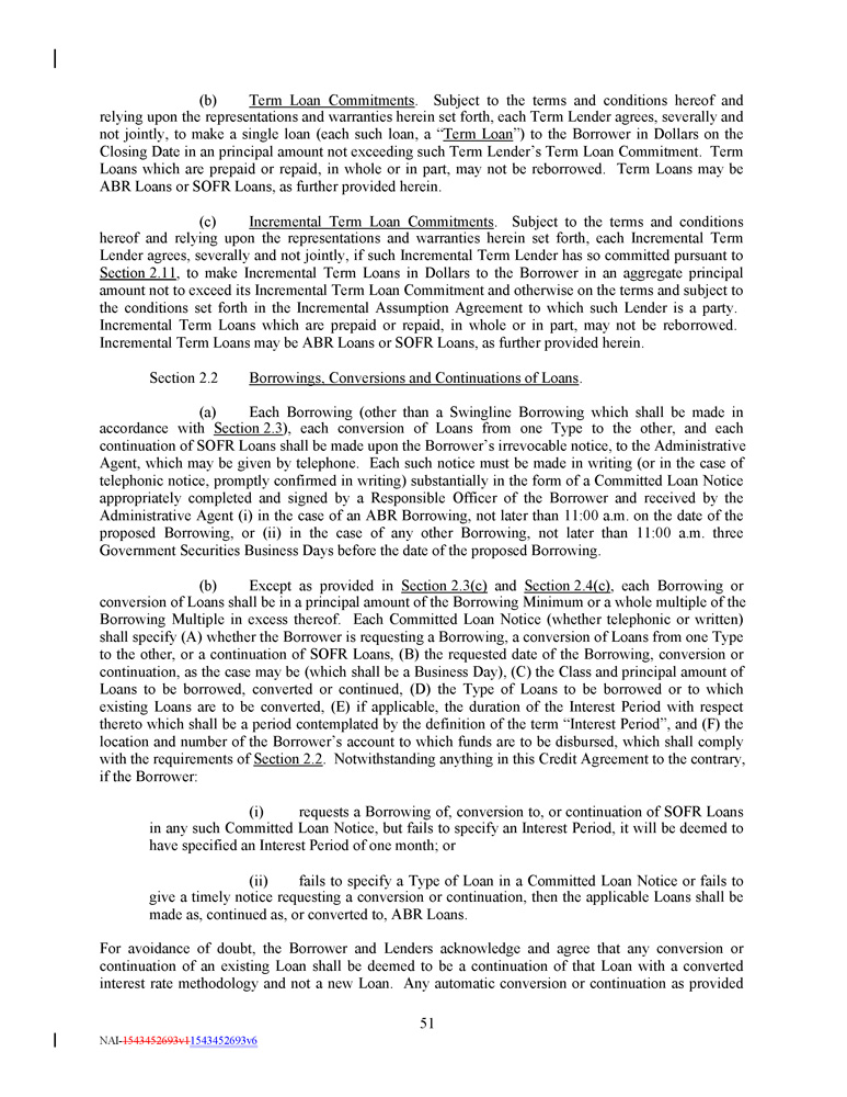 (b) Term Loan Commitments . Subject to the terms and conditions hereof and relying upon the representations and warranties herein set forth, each Term Lender agrees, severally and not jointly, to make a single loan (each such loan, a “ Term Loan ”) to the Borrower in Dollars on the Closing Date in an principal amount not exceeding such Term Lender’s Term Loan Commitment . Term Loans which are prepaid or repaid, in whole or in part, may not be reborrowed . Term Loans may be ABR Loans or SOFR Loans, as further provided herein . (c) Incremental Term Loan Commitments . Subject to the terms and conditions hereof and relying upon the representations and warranties herein set forth, each Incremental Term Lender agrees, severally and not jointly, if such Incremental Term Lender has so committed pursuant to Section 2.11 , to make Incremental Term Loans in Dollars to the Borrower in an aggregate principal amount not to exceed its Incremental Term Loan Commitment and otherwise on the terms and subject to the conditions set forth in the Incremental Assumption Agreement to which such Lender is a party. Incremental Term Loans which are prepaid or repaid, in whole or in part, may not be reborrowed. Incremental Term Loans may be ABR Loans or SOFR Loans, as further provided herein. Section 2.2 Borrowings, Conversions and Continuations of Loans . (a) Each Borrowing (other than a Swingline Borrowing which shall be made in accordance with Section 2 . 3 ), each conversion of Loans from one Type to the other, and each continuation of SOFR Loans shall be made upon the Borrower’s irrevocable notice, to the Administrative Agent, which may be given by telephone . Each such notice must be made in writing (or in the case of telephonic notice, promptly confirmed in writing) substantially in the form of a Committed Loan Notice appropriately completed and signed by a Responsible Officer of the Borrower and received by the Administrative Agent (i) in the case of an ABR Borrowing, not later than 11 : 00 a . m . on the date of the proposed Borrowing, or (ii) in the case of any other Borrowing, not later than 11 : 00 a . m . three Government Securities Business Days before the date of the proposed Borrowing . (b) Except as provided in Section 2 . 3 (c) and Section 2 . 4 (c) , each Borrowing or conversion of Loans shall be in a principal amount of the Borrowing Minimum or a whole multiple of the Borrowing Multiple in excess thereof . Each Committed Loan Notice (whether telephonic or written) shall specify (A) whether the Borrower is requesting a Borrowing, a conversion of Loans from one Type to the other, or a continuation of SOFR Loans, (B) the requested date of the Borrowing, conversion or continuation, as the case may be (which shall be a Business Day), (C) the Class and principal amount of Loans to be borrowed, converted or continued, (D) the Type of Loans to be borrowed or to which existing Loans are to be converted, (E) if applicable, the duration of the Interest Period with respect thereto which shall be a period contemplated by the definition of the term “Interest Period”, and (F) the location and number of the Borrower’s account to which funds are to be disbursed, which shall comply with the requirements of Section 2 . 2 . Notwithstanding anything in this Credit Agreement to the contrary, if the Borrower : (i) requests a Borrowing of, conversion to, or continuation of SOFR Loans in any such Committed Loan Notice, but fails to specify an Interest Period, it will be deemed to have specified an Interest Period of one month ; or (ii) fails to specify a Type of Loan in a Committed Loan Notice or fails to give a timely notice requesting a conversion or continuation, then the applicable Loans shall be made as, continued as, or converted to, ABR Loans . For avoidance of doubt, the Borrower and Lenders acknowledge and agree that any conversion or continuation of an existing Loan shall be deemed to be a continuation of that Loan with a converted interest rate methodology and not a new Loan . Any automatic conversion or continuation as provided 51 NAI - 1543452693v1 1543452693v6