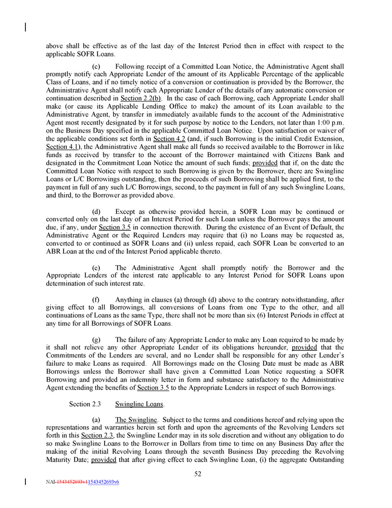 above shall be effective as of the last day of the Interest Period then in effect with respect to the applicable SOFR Loans. (c) Following receipt of a Committed Loan Notice, the Administrative Agent shall promptly notify each Appropriate Lender of the amount of its Applicable Percentage of the applicable Class of Loans, and if no timely notice of a conversion or continuation is provided by the Borrower, the Administrative Agent shall notify each Appropriate Lender of the details of any automatic conversion or continuation described in Section 2 . 2 (b) . In the case of each Borrowing, each Appropriate Lender shall make (or cause its Applicable Lending Office to make) the amount of its Loan available to the Administrative Agent, by transfer in immediately available funds to the account of the Administrative Agent most recently designated by it for such purpose by notice to the Lenders, not later than 1 : 00 p . m . on the Business Day specified in the applicable Committed Loan Notice . Upon satisfaction or waiver of the applicable conditions set forth in Section 4 . 2 (and, if such Borrowing is the initial Credit Extension, Section 4 . 1 ), the Administrative Agent shall make all funds so received available to the Borrower in like funds as received by transfer to the account of the Borrower maintained with Citizens Bank and designated in the Commitment Loan Notice the amount of such funds ; provided that if, on the date the Committed Loan Notice with respect to such Borrowing is given by the Borrower, there are Swingline Loans or L/C Borrowings outstanding, then the proceeds of such Borrowing shall be applied first, to the payment in full of any such L/C Borrowings, second, to the payment in full of any such Swingline Loans, and third, to the Borrower as provided above . (d) Except as otherwise provided herein, a SOFR Loan may be continued or converted only on the last day of an Interest Period for such Loan unless the Borrower pays the amount due, if any, under Section 3 . 5 in connection therewith . During the existence of an Event of Default, the Administrative Agent or the Required Lenders may require that (i) no Loans may be requested as, converted to or continued as SOFR Loans and (ii) unless repaid, each SOFR Loan be converted to an ABR Loan at the end of the Interest Period applicable thereto . (e) The Administrative Agent shall promptly notify the Borrower and the Appropriate Lenders of the interest rate applicable to any Interest Period for SOFR Loans upon determination of such interest rate . (f) Anything in clauses (a) through (d) above to the contrary notwithstanding, after giving effect to all Borrowings, all conversions of Loans from one Type to the other, and all continuations of Loans as the same Type, there shall not be more than six ( 6 ) Interest Periods in effect at any time for all Borrowings of SOFR Loans . (g) The failure of any Appropriate Lender to make any Loan required to be made by it shall not relieve any other Appropriate Lender of its obligations hereunder, provided that the Commitments of the Lenders are several, and no Lender shall be responsible for any other Lender’s failure to make Loans as required . All Borrowings made on the Closing Date must be made as ABR Borrowings unless the Borrower shall have given a Committed Loan Notice requesting a SOFR Borrowing and provided an indemnity letter in form and substance satisfactory to the Administrative Agent extending the benefits of Section 3 . 5 to the Appropriate Lenders in respect of such Borrowings . Section 2.3 Swingline Loans . (a) The Swingline . Subject to the terms and conditions hereof and relying upon the representations and warranties herein set forth and upon the agreements of the Revolving Lenders set forth in this Section 2 . 3 , the Swingline Lender may in its sole discretion and without any obligation to do so make Swingline Loans to the Borrower in Dollars from time to time on any Business Day after the making of the initial Revolving Loans through the seventh Business Day preceding the Revolving Maturity Date ; provided that after giving effect to each Swingline Loan, (i) the aggregate Outstanding 52 NAI - 1543452693v1 1543452693v6