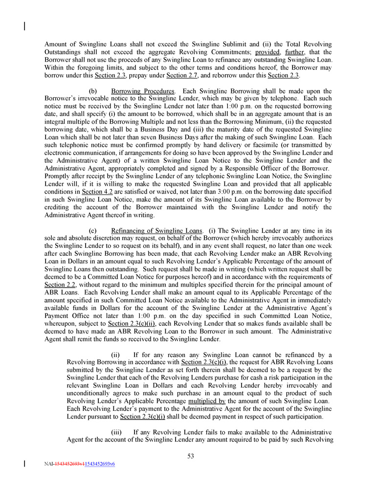 Amount of Swingline Loans shall not exceed the Swingline Sublimit and (ii) the Total Revolving Outstandings shall not exceed the aggregate Revolving Commitments ; provided , further , that the Borrower shall not use the proceeds of any Swingline Loan to refinance any outstanding Swingline Loan . Within the foregoing limits, and subject to the other terms and conditions hereof, the Borrower may borrow under this Section 2 . 3 , prepay under Section 2 . 7 , and reborrow under this Section 2 . 3 . (b) Borrowing Procedures . Each Swingline Borrowing shall be made upon the Borrower’s irrevocable notice to the Swingline Lender, which may be given by telephone. Each such notice must be received by the Swingline Lender not later than 1:00 p.m. on the requested borrowing date, and shall specify (i) the amount to be borrowed, which shall be in an aggregate amount that is an integral multiple of the Borrowing Multiple and not less than the Borrowing Minimum, (ii) the requested borrowing date, which shall be a Business Day and (iii) the maturity date of the requested Swingline Loan which shall be not later than seven Business Days after the making of such Swingline Loan. Each such telephonic notice must be confirmed promptly by hand delivery or facsimile (or transmitted by electronic communication, if arrangements for doing so have been approved by the Swingline Lender and the Administrative Agent) of a written Swingline Loan Notice to the Swingline Lender and the Administrative Agent, appropriately completed and signed by a Responsible Officer of the Borrower. Promptly after receipt by the Swingline Lender of any telephonic Swingline Loan Notice, the Swingline Lender will, if it is willing to make the requested Swingline Loan and provided that all applicable conditions in Section 4.2 are satisfied or waived, not later than 3:00 p.m. on the borrowing date specified in such Swingline Loan Notice, make the amount of its Swingline Loan available to the Borrower by crediting the account of the Borrower maintained with the Swingline Lender and notify the Administrative Agent thereof in writing. (c) Refinancing of Swingline Loans . (i) The Swingline Lender at any time in its sole and absolute discretion may request, on behalf of the Borrower (which hereby irrevocably authorizes the Swingline Lender to so request on its behalf), and in any event shall request, no later than one week after each Swingline Borrowing has been made, that each Revolving Lender make an ABR Revolving Loan in Dollars in an amount equal to such Revolving Lender’s Applicable Percentage of the amount of Swingline Loans then outstanding . Such request shall be made in writing (which written request shall be deemed to be a Committed Loan Notice for purposes hereof) and in accordance with the requirements of Section 2 . 2 , without regard to the minimum and multiples specified therein for the principal amount of ABR Loans . Each Revolving Lender shall make an amount equal to its Applicable Percentage of the amount specified in such Committed Loan Notice available to the Administrative Agent in immediately available funds in Dollars for the account of the Swingline Lender at the Administrative Agent’s Payment Office not later than 1 : 00 p . m . on the day specified in such Committed Loan Notice, whereupon, subject to Section 2 . 3 (c)(ii) , each Revolving Lender that so makes funds available shall be deemed to have made an ABR Revolving Loan to the Borrower in such amount . The Administrative Agent shall remit the funds so received to the Swingline Lender . (ii) If for any reason any Swingline Loan cannot be refinanced by a Revolving Borrowing in accordance with Section 2.3(c)(i) , the request for ABR Revolving Loans submitted by the Swingline Lender as set forth therein shall be deemed to be a request by the Swingline Lender that each of the Revolving Lenders purchase for cash a risk participation in the relevant Swingline Loan in Dollars and each Revolving Lender hereby irrevocably and unconditionally agrees to make such purchase in an amount equal to the product of such Revolving Lender’s Applicable Percentage multiplied by the amount of such Swingline Loan. Each Revolving Lender’s payment to the Administrative Agent for the account of the Swingline Lender pursuant to Section 2.3(c)(i) shall be deemed payment in respect of such participation. (iii) If any Revolving Lender fails to make available to the Administrative Agent for the account of the Swingline Lender any amount required to be paid by such Revolving 53 NAI - 1543452693v1 1543452693v6