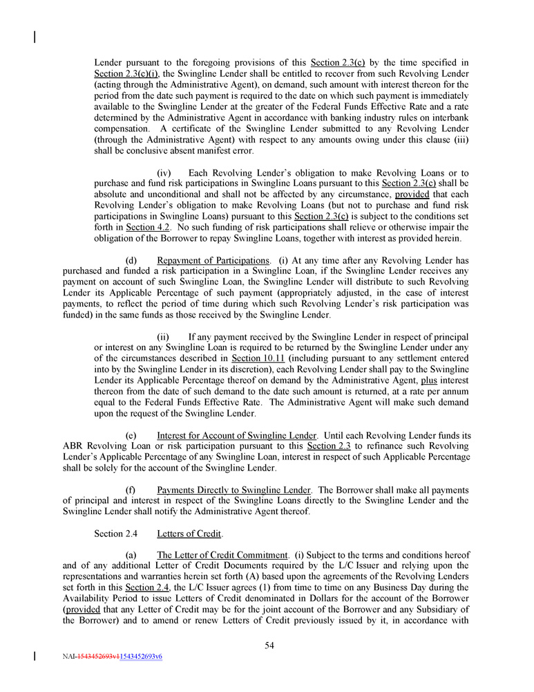 Lender pursuant to the foregoing provisions of this Section 2 . 3 (c) by the time specified in Section 2 . 3 (c)(i) , the Swingline Lender shall be entitled to recover from such Revolving Lender (acting through the Administrative Agent), on demand, such amount with interest thereon for the period from the date such payment is required to the date on which such payment is immediately available to the Swingline Lender at the greater of the Federal Funds Effective Rate and a rate determined by the Administrative Agent in accordance with banking industry rules on interbank compensation . A certificate of the Swingline Lender submitted to any Revolving Lender (through the Administrative Agent) with respect to any amounts owing under this clause (iii) shall be conclusive absent manifest error . (iv) Each Revolving Lender’s obligation to make Revolving Loans or to purchase and fund risk participations in Swingline Loans pursuant to this Section 2 . 3 (c) shall be absolute and unconditional and shall not be affected by any circumstance, provided that each Revolving Lender’s obligation to make Revolving Loans (but not to purchase and fund risk participations in Swingline Loans) pursuant to this Section 2 . 3 (c) is subject to the conditions set forth in Section 4 . 2 . No such funding of risk participations shall relieve or otherwise impair the obligation of the Borrower to repay Swingline Loans, together with interest as provided herein . (d) Repayment of Participations . (i) At any time after any Revolving Lender has purchased and funded a risk participation in a Swingline Loan, if the Swingline Lender receives any payment on account of such Swingline Loan, the Swingline Lender will distribute to such Revolving Lender its Applicable Percentage of such payment (appropriately adjusted, in the case of interest payments, to reflect the period of time during which such Revolving Lender’s risk participation was funded) in the same funds as those received by the Swingline Lender . (ii) If any payment received by the Swingline Lender in respect of principal or interest on any Swingline Loan is required to be returned by the Swingline Lender under any of the circumstances described in Section 10 . 11 (including pursuant to any settlement entered into by the Swingline Lender in its discretion), each Revolving Lender shall pay to the Swingline Lender its Applicable Percentage thereof on demand by the Administrative Agent, plus interest thereon from the date of such demand to the date such amount is returned, at a rate per annum equal to the Federal Funds Effective Rate . The Administrative Agent will make such demand upon the request of the Swingline Lender . (e) Interest for Account of Swingline Lender . Until each Revolving Lender funds its ABR Revolving Loan or risk participation pursuant to this Section 2 . 3 to refinance such Revolving Lender’s Applicable Percentage of any Swingline Loan, interest in respect of such Applicable Percentage shall be solely for the account of the Swingline Lender . (f) Payments Directly to Swingline Lender . The Borrower shall make all payments of principal and interest in respect of the Swingline Loans directly to the Swingline Lender and the Swingline Lender shall notify the Administrative Agent thereof . Section 2 . 4 Letters of Credit . (a) The Letter of Credit Commitment . (i) Subject to the terms and conditions hereof and of any additional Letter of Credit Documents required by the L/C Issuer and relying upon the representations and warranties herein set forth (A) based upon the agreements of the Revolving Lenders set forth in this Section 2 . 4 , the L/C Issuer agrees ( 1 ) from time to time on any Business Day during the Availability Period to issue Letters of Credit denominated in Dollars for the account of the Borrower ( provided that any Letter of Credit may be for the joint account of the Borrower and any Subsidiary of the Borrower) and to amend or renew Letters of Credit previously issued by it, in accordance with 54 NAI - 1543452693v1 1543452693v6