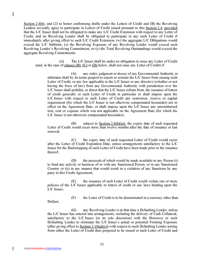 Section 2 . 4 (b) , and ( 2 ) to honor conforming drafts under the Letters of Credit and (B) the Revolving Lenders severally agree to participate in Letters of Credit issued pursuant to this Section 2 . 4 ; provided that the L/C Issuer shall not be obligated to make any L/C Credit Extension with respect to any Letter of Credit, and no Revolving Lender shall be obligated to participate in any such Letter of Credit if immediately after giving effect to such L/C Credit Extension, (w) the aggregate L/C Obligations would exceed the L/C Sublimit, (x) the Revolving Exposure of any Revolving Lender would exceed such Revolving Lender’s Revolving Commitment, or (y) the Total Revolving Outstandings would exceed the aggregate Revolving Commitments . (ii) The L/C Issuer shall be under no obligation to issue any Letter of Credit (and, in the case of clauses (B) , (C) or (D) below, shall not issue any Letter of Credit) if: (A) any order, judgment or decree of any Governmental Authority or arbitrator shall by its terms purport to enjoin or restrain the L/C Issuer from issuing such Letter of Credit, or any law applicable to the L/C Issuer or any directive (whether or not having the force of law) from any Governmental Authority with jurisdiction over the L/C Issuer shall prohibit, or direct that the L/C Issuer refrain from, the issuance of letters of credit generally or such Letter of Credit in particular or shall impose upon the L/C Issuer with respect to such Letter of Credit any restriction, reserve or capital requirement (for which the L/C Issuer is not otherwise compensated hereunder) not in effect on the Agreement Date, or shall impose upon the L/C Issuer any unreimbursed loss, cost or expense which was not applicable on the Agreement Date (for which the L/C Issuer is not otherwise compensated hereunder) ; (B) subject to Section 2 . 4 (b)(iii) , the expiry date of such requested Letter of Credit would occur more than twelve months after the date of issuance or last renewal ; (C) the expiry date of such requested Letter of Credit would occur after the Letter of Credit Expiration Date, unless arrangements satisfactory to the L/C Issuer for the Backstopping of such Letter of Credit have been made prior to the issuance thereof ; (D) the proceeds of which would be made available to any Person (i) to fund any activity or business of or with any Sanctioned Person, or in any Sanctioned Country or (ii) in any manner that would result in a violation of any Sanctions by any party to this Credit Agreement ; (E) the issuance of such Letter of Credit would violate one or more policies of the L/C Issuer applicable to letters of credit or any laws binding upon the L/C Issuer ; (F) the Letter of Credit is to be denominated in a currency other than Dollars; (G) any Revolving Lender is at that time a Defaulting Lender, unless the L/C Issuer has entered into arrangements, including the delivery of Cash Collateral, satisfactory to the L/C Issuer (in its sole discretion) with the Borrower or such Defaulting Lender to eliminate the L/C Issuer’s actual or potential Fronting Exposure (after giving effect to Section 2 . 10 (a)(iv) ) with respect to such Defaulting Lender arising from either the Letter of Credit then proposed to be issued or such Letter of Credit and 55 NAI - 1543452693v1 1543452693v6