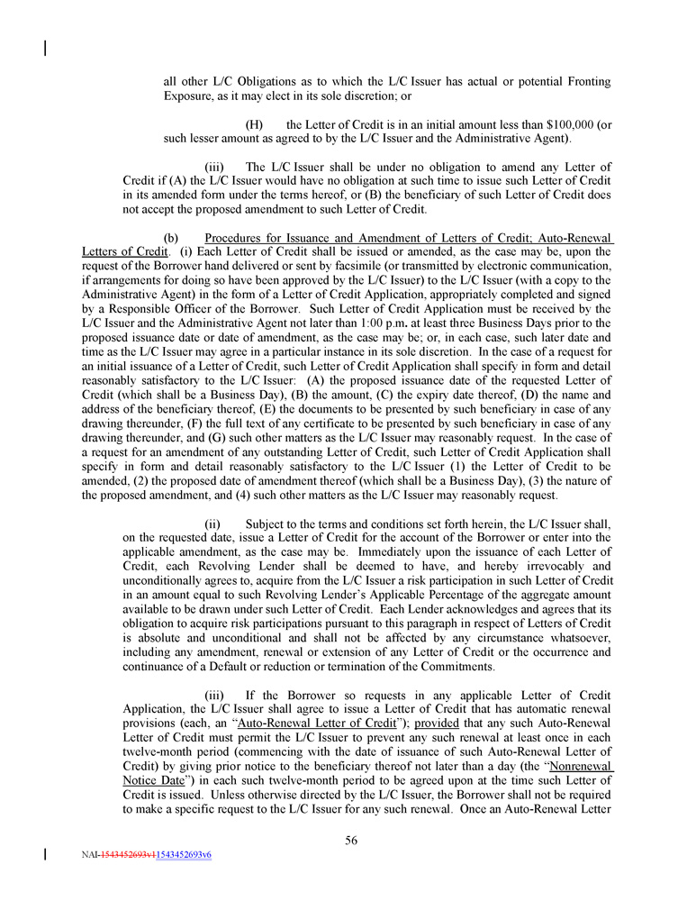 all other L/C Obligations as to which the L/C Issuer has actual or potential Fronting Exposure, as it may elect in its sole discretion; or (H) the Letter of Credit is in an initial amount less than $100,000 (or such lesser amount as agreed to by the L/C Issuer and the Administrative Agent). (iii) The L/C Issuer shall be under no obligation to amend any Letter of Credit if (A) the L/C Issuer would have no obligation at such time to issue such Letter of Credit in its amended form under the terms hereof, or (B) the beneficiary of such Letter of Credit does not accept the proposed amendment to such Letter of Credit . (b) Procedures for Issuance and Amendment of Letters of Credit ; Auto - Renewal Letters of Credit . (i) Each Letter of Credit shall be issued or amended, as the case may be, upon the request of the Borrower hand delivered or sent by facsimile (or transmitted by electronic communication, if arrangements for doing so have been approved by the L/C Issuer) to the L/C Issuer (with a copy to the Administrative Agent) in the form of a Letter of Credit Application, appropriately completed and signed by a Responsible Officer of the Borrower . Such Letter of Credit Application must be received by the L/C Issuer and the Administrative Agent not later than 1 : 00 p . m . at least three Business Days prior to the proposed issuance date or date of amendment, as the case may be ; or, in each case, such later date and time as the L/C Issuer may agree in a particular instance in its sole discretion . In the case of a request for an initial issuance of a Letter of Credit, such Letter of Credit Application shall specify in form and detail reasonably satisfactory to the L/C Issuer : (A) the proposed issuance date of the requested Letter of Credit (which shall be a Business Day), (B) the amount, (C) the expiry date thereof, (D) the name and address of the beneficiary thereof, (E) the documents to be presented by such beneficiary in case of any drawing thereunder, (F) the full text of any certificate to be presented by such beneficiary in case of any drawing thereunder, and (G) such other matters as the L/C Issuer may reasonably request . In the case of a request for an amendment of any outstanding Letter of Credit, such Letter of Credit Application shall specify in form and detail reasonably satisfactory to the L/C Issuer ( 1 ) the Letter of Credit to be amended, ( 2 ) the proposed date of amendment thereof (which shall be a Business Day), ( 3 ) the nature of the proposed amendment, and ( 4 ) such other matters as the L/C Issuer may reasonably request . (ii) Subject to the terms and conditions set forth herein, the L/C Issuer shall, on the requested date, issue a Letter of Credit for the account of the Borrower or enter into the applicable amendment, as the case may be . Immediately upon the issuance of each Letter of Credit, each Revolving Lender shall be deemed to have, and hereby irrevocably and unconditionally agrees to, acquire from the L/C Issuer a risk participation in such Letter of Credit in an amount equal to such Revolving Lender’s Applicable Percentage of the aggregate amount available to be drawn under such Letter of Credit . Each Lender acknowledges and agrees that its obligation to acquire risk participations pursuant to this paragraph in respect of Letters of Credit is absolute and unconditional and shall not be affected by any circumstance whatsoever, including any amendment, renewal or extension of any Letter of Credit or the occurrence and continuance of a Default or reduction or termination of the Commitments . (iii) If the Borrower so requests in any applicable Letter of Credit Application, the L/C Issuer shall agree to issue a Letter of Credit that has automatic renewal provisions (each, an “ Auto - Renewal Letter of Credit ”) ; provided that any such Auto - Renewal Letter of Credit must permit the L/C Issuer to prevent any such renewal at least once in each twelve - month period (commencing with the date of issuance of such Auto - Renewal Letter of Credit) by giving prior notice to the beneficiary thereof not later than a day (the “ Nonrenewal Notice Date ”) in each such twelve - month period to be agreed upon at the time such Letter of Credit is issued . Unless otherwise directed by the L/C Issuer, the Borrower shall not be required to make a specific request to the L/C Issuer for any such renewal . Once an Auto - Renewal Letter 56 NAI - 1543452693v1 1543452693v6